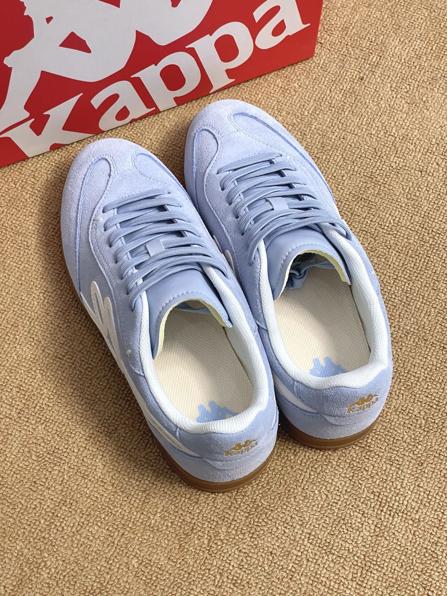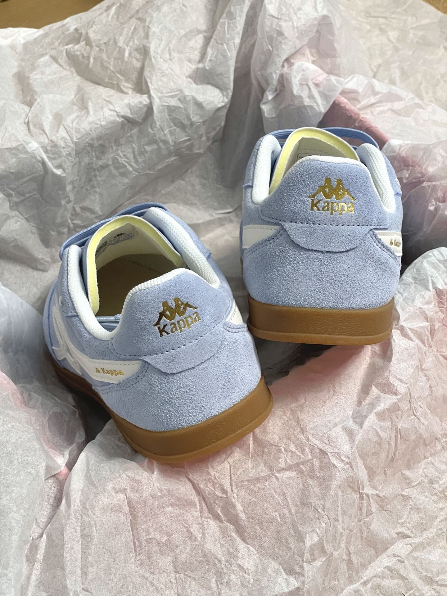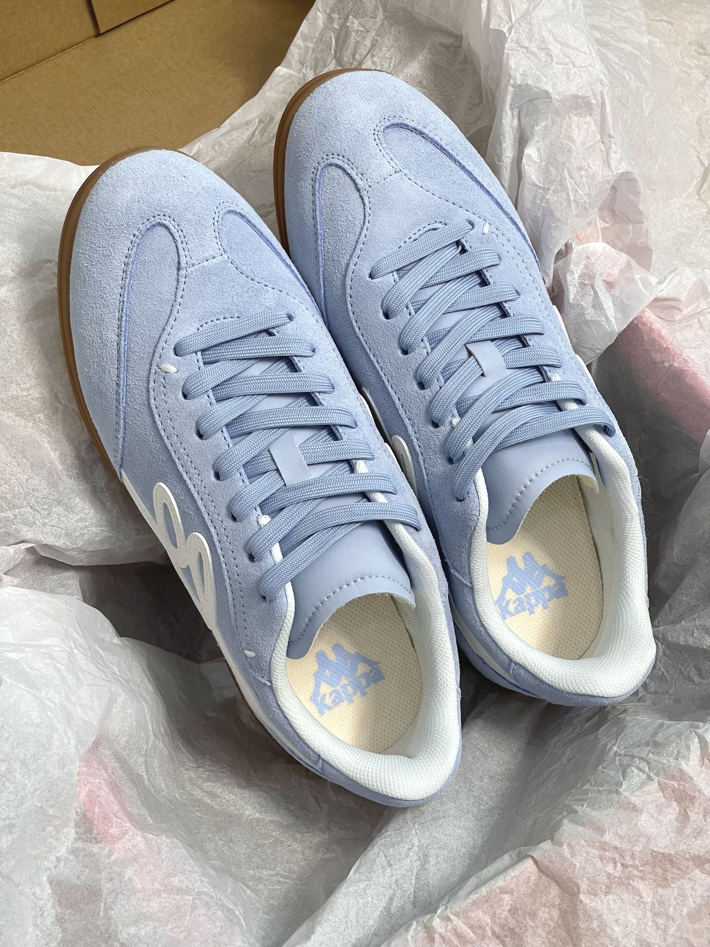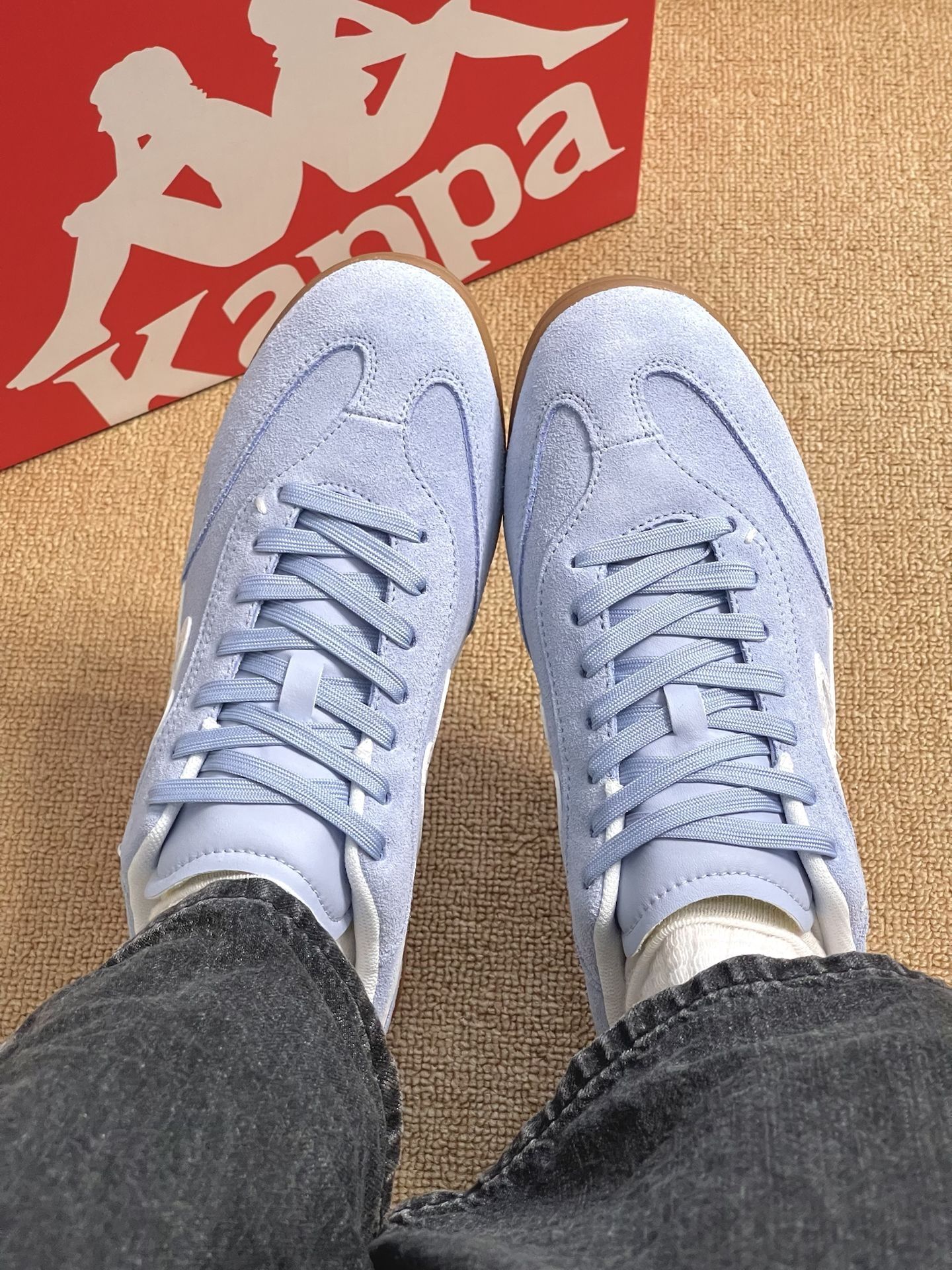 谁懂啊!Kappa这双雾霾蓝德训鞋真的长在我审美点上了💙 麂皮材质摸起来软乎乎的,雾霾蓝配色自带温柔滤镜,搭配生胶鞋底复古感直接拉满,不管是配牛仔裤、工装裙还是休闲裤都超和谐!鞋型是经典德训款,包裹感刚刚好,走路软弹不磨脚,日常通勤、校园上课、周末citywalk都能穿,百搭到我想焊在脚上! 白色刺绣Kappa标+金色烫金细节,质感直接拉满,小众不撞款,百元价位就能get大牌质感,早秋穿搭缺它...