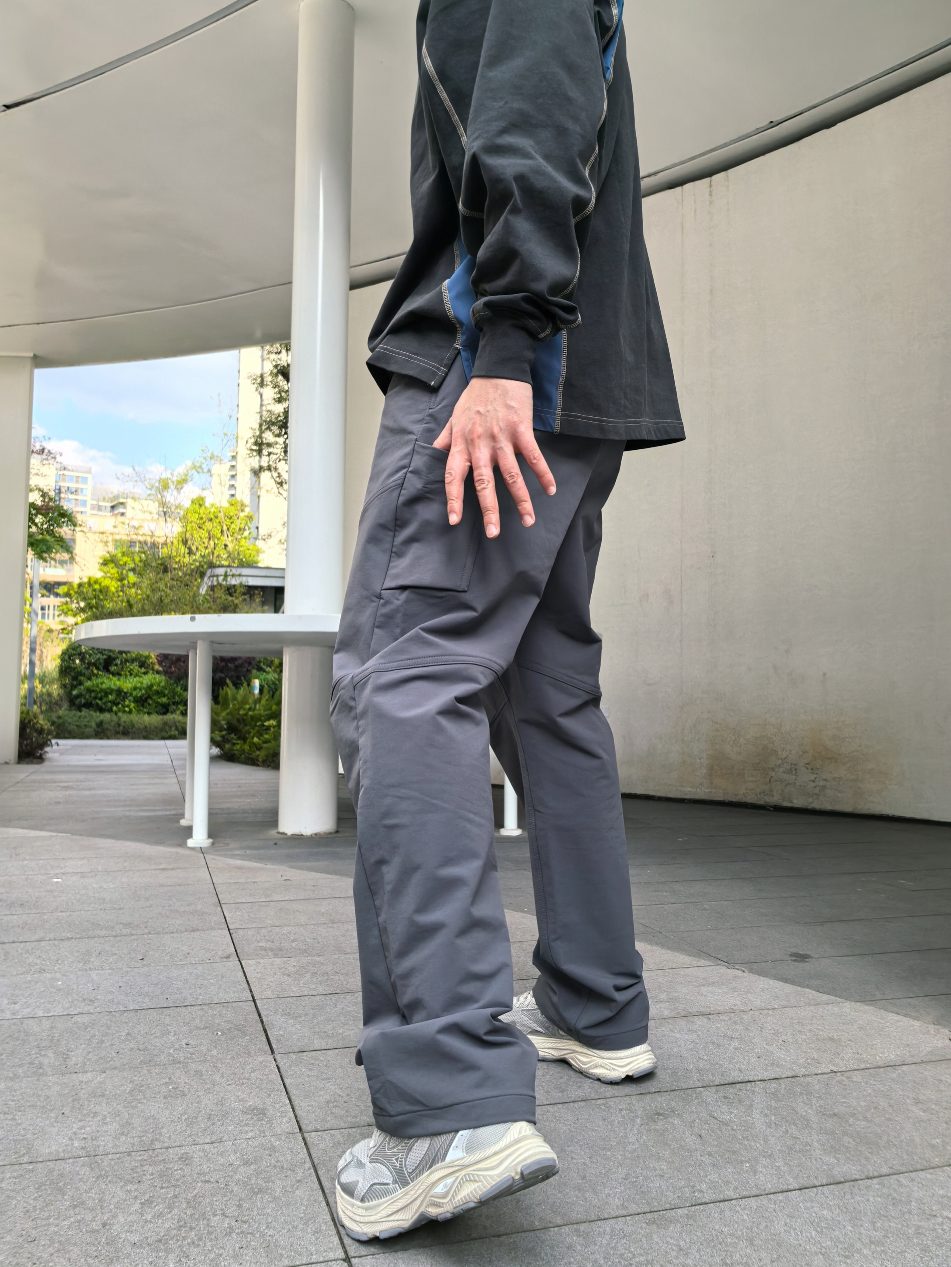 户外裤实用又高级? 🏃今天在外面闲逛我就搭配了这条Vibe风户外裤,一个深灰色,我觉得相比黑色会更高级,同时裤子的一些纹理和系列也会更明显! 👾他是一个偏软壳的质感,厚度适中,这几天上身比较合适。裤身侧边大口袋+立体剪裁,放手机、耳机都不晃,平时通勤、citywalk、户外徒步都能穿,随便套个拼色长袖就很有氛围感,不用费脑子想搭配! 🏷️我的身高175体重135,穿的一个XL码合身的状态