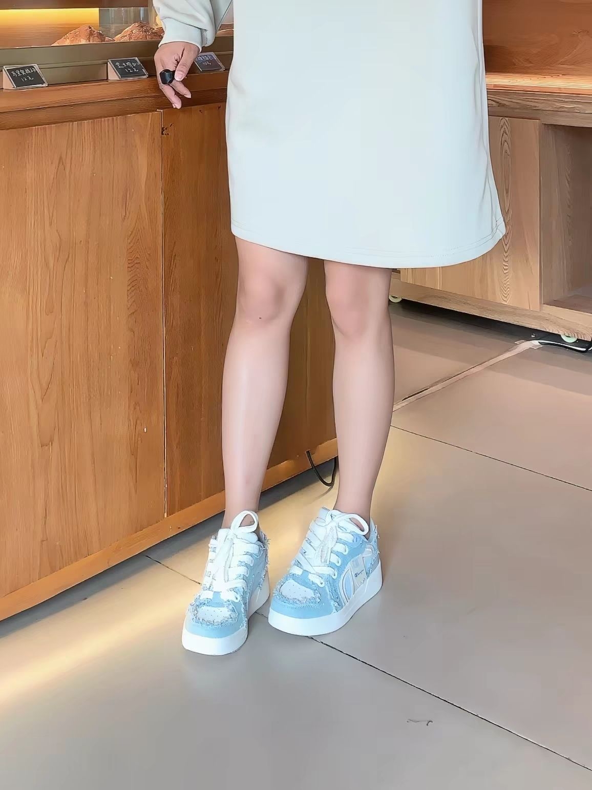 这双海盐奶蓝毛边板鞋真的太戳少女心了! 浅蓝与奶白的撞色像把春日海风穿在脚上,做旧毛边设计自带慵懒随性,厚底悄悄拉长腿部线条,配裙子、牛仔裤都超绝,走路软弹不累脚,通勤约会都能穿,是一眼就心动的清新感