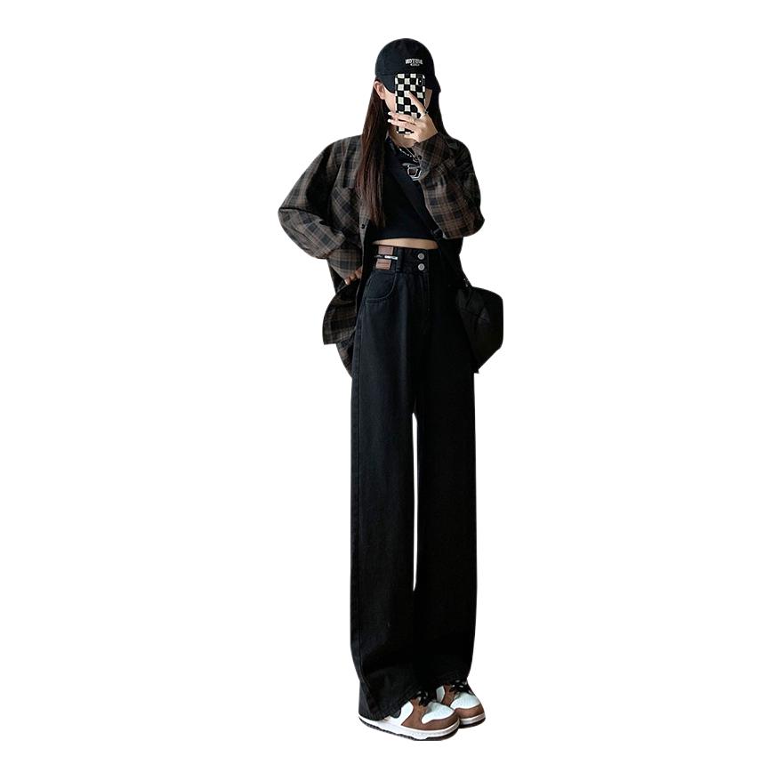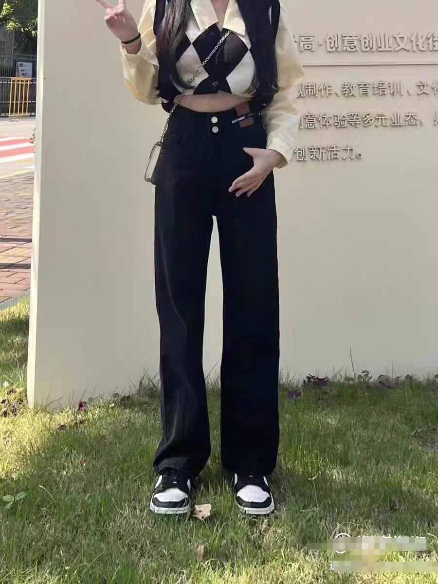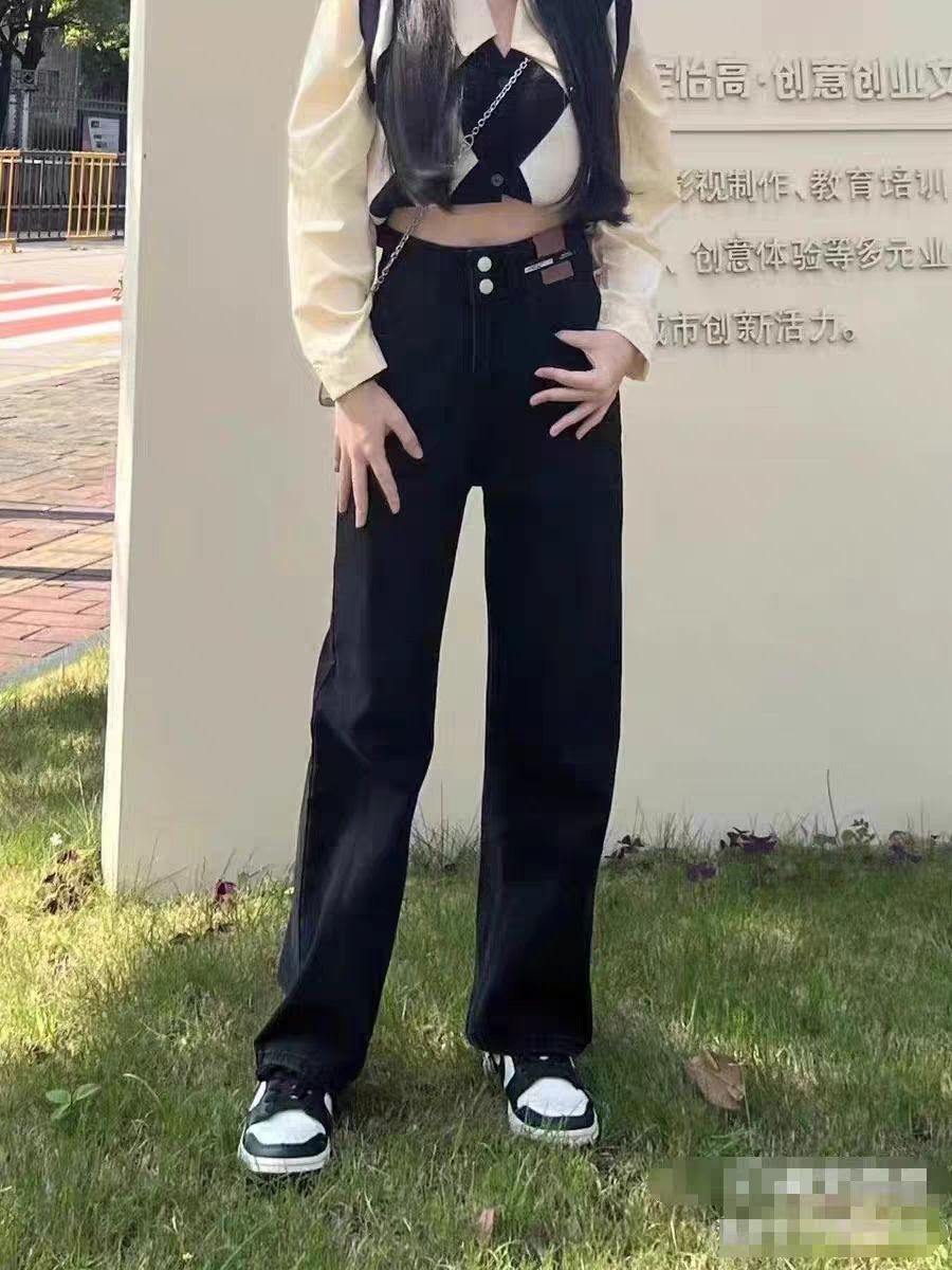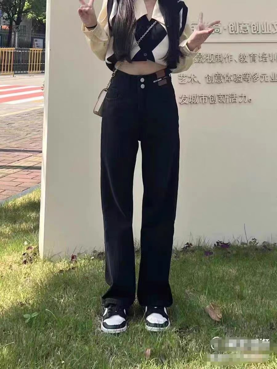 这条黑色直筒牛仔裤真的是衣柜里的万能款!高腰双扣设计牢牢锁住腰线,瞬间拉长下半身比例,直筒裤型把所有腿部不完美都藏得严严实实,不管是肌肉腿还是假胯宽都能轻松修饰。纯黑色调高级又耐脏,搭配短款上衣、卫衣、衬衫都超好看,通勤、出街、约会都能hold住。面料挺括有质感,不易变形、不易皱,是能穿好几年的基础款,闭眼入不踩雷!