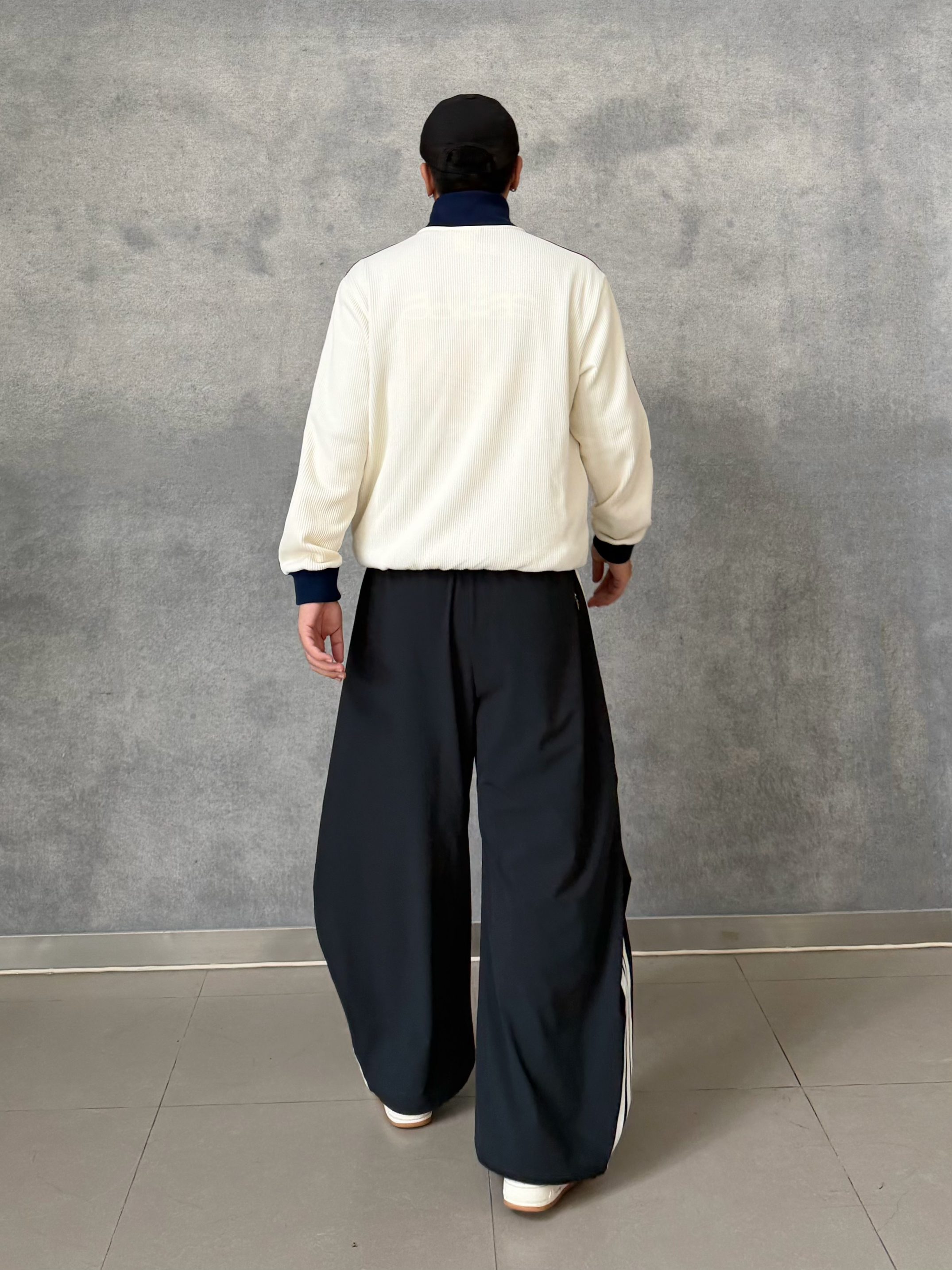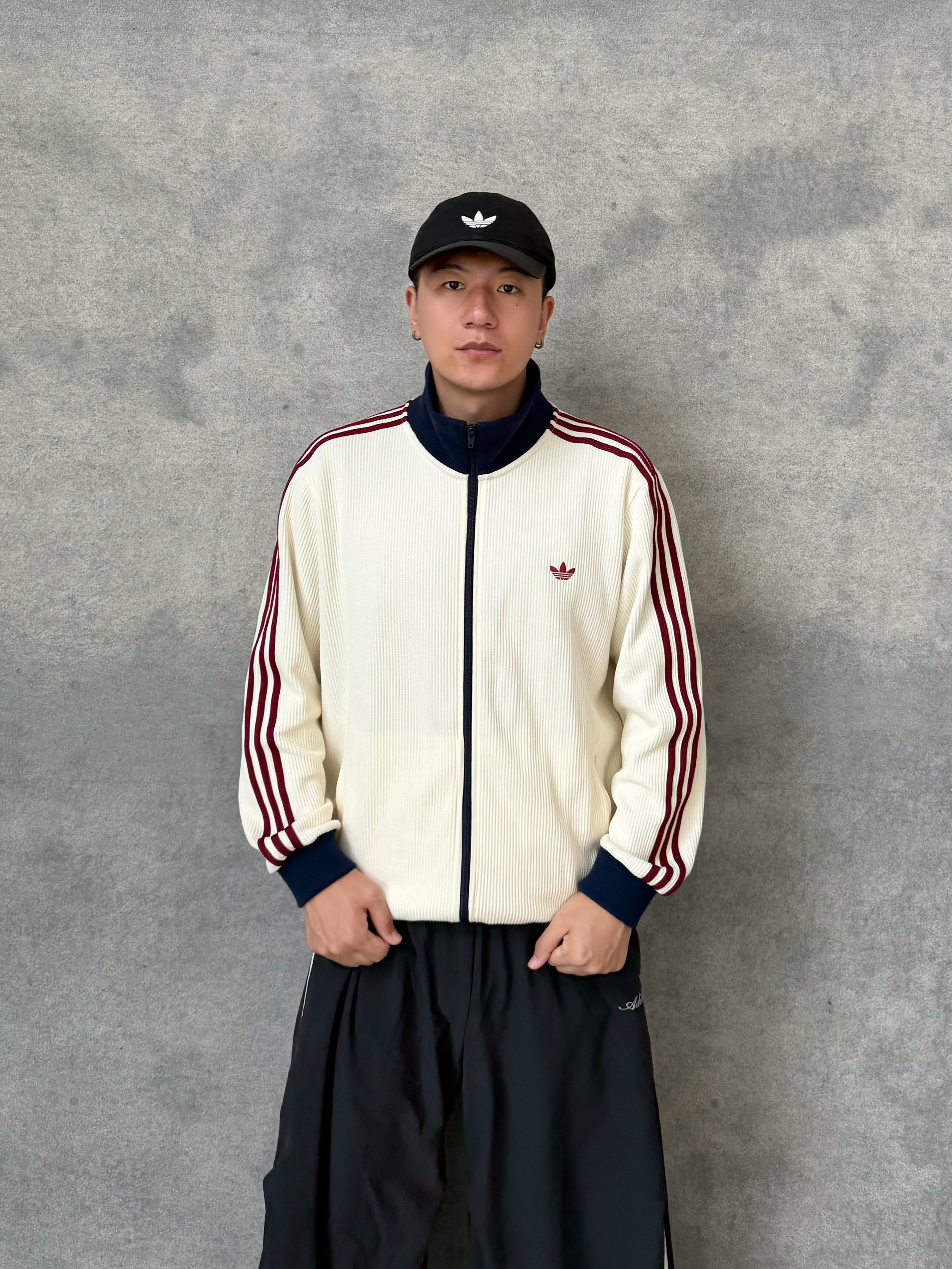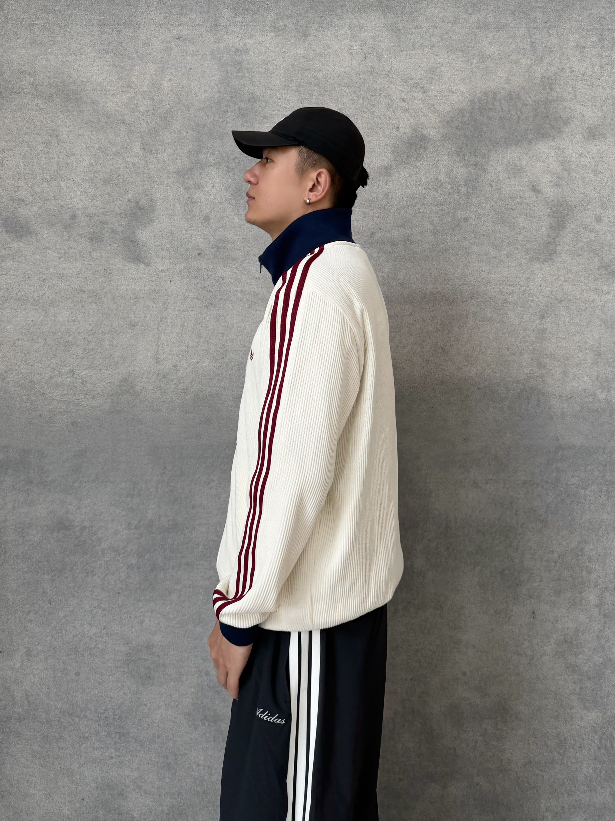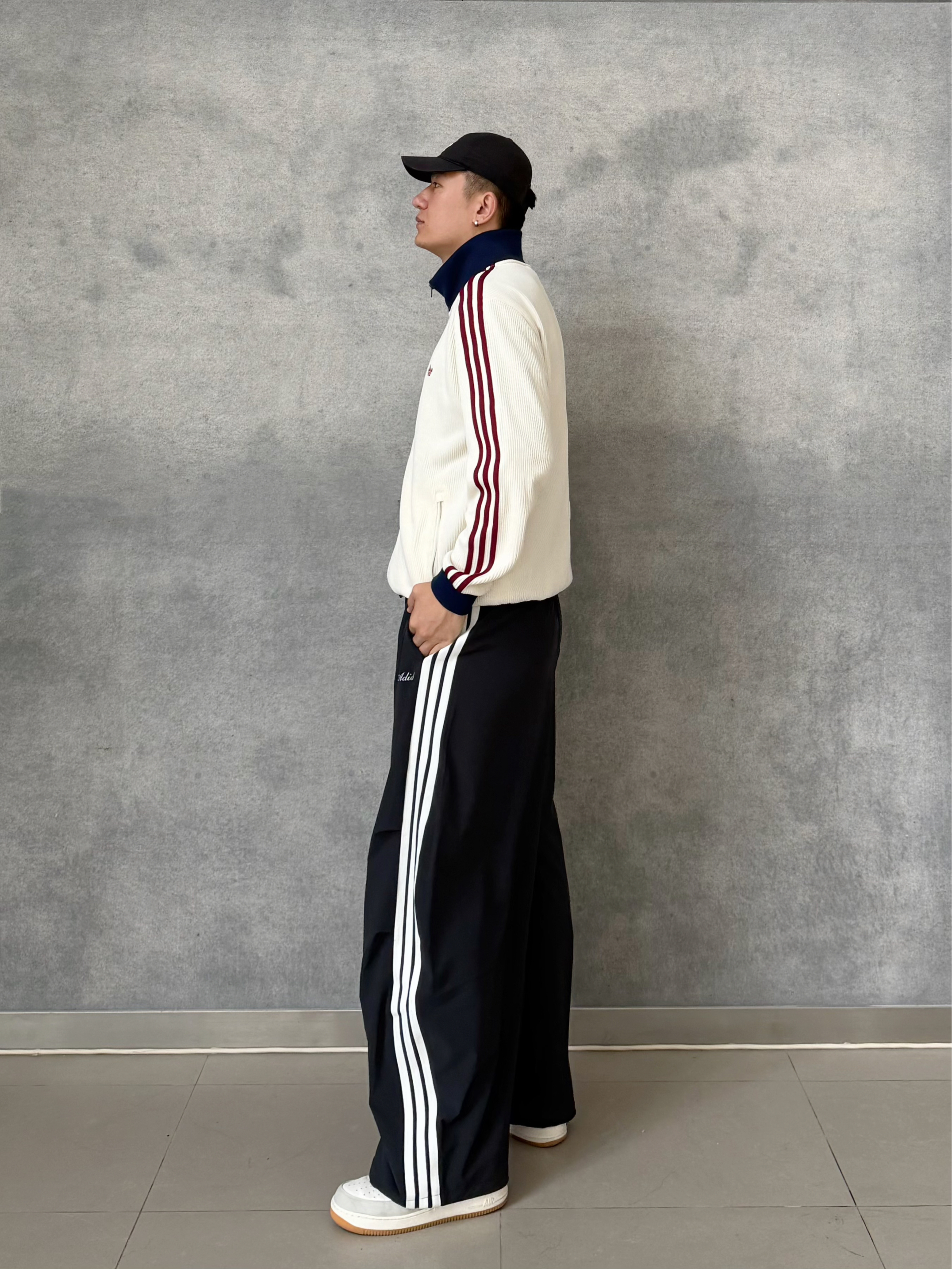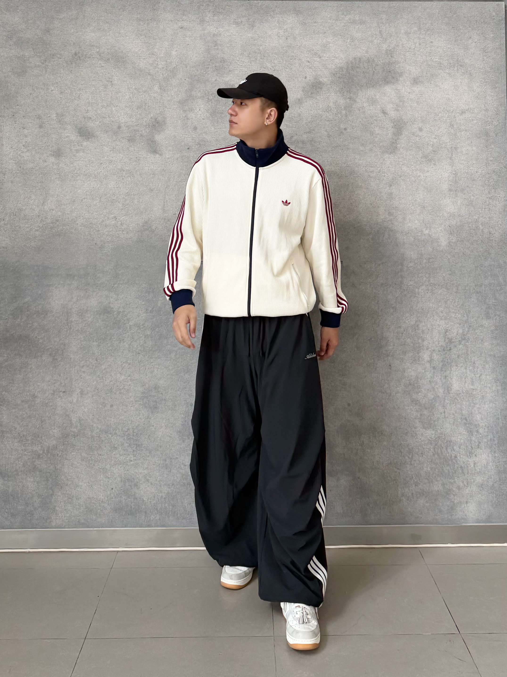 早春就得这种慵慵懒懒的调调🍃 外套Adidas乳白华夫格 藏蓝领口袖口撞上酒红条纹 简约高级✨ 下身直接套条Adidas黑阔腿裤 三条白杠显腿长 踩双卡其板鞋 没刻意凹造型 但就是很有型 我愿称之为 不用力的好看✌🏻 👦🏻:188 | 85 🧥:XXL 👖:XL