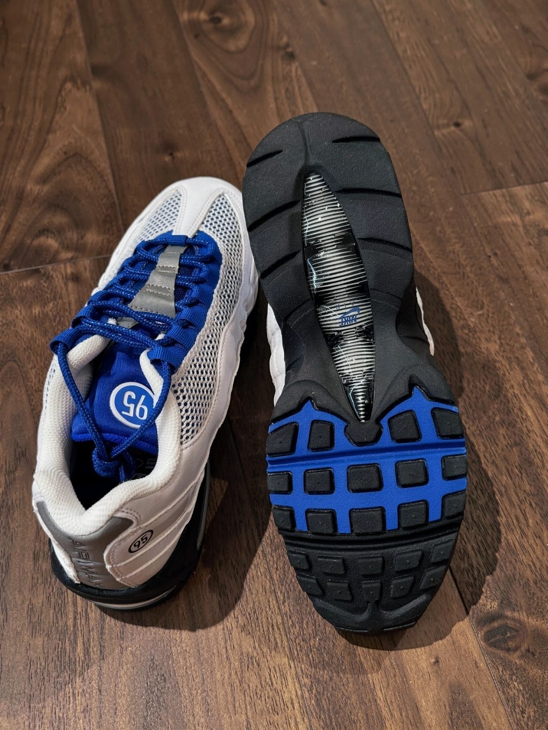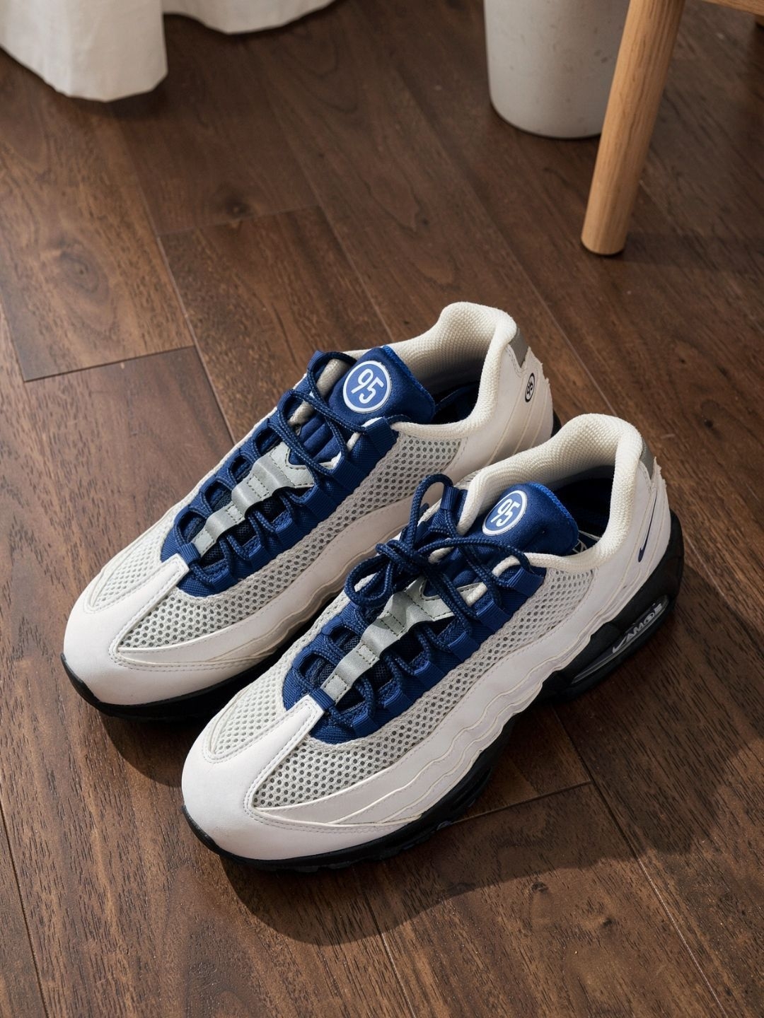 最近把这双Nike Air Max 95拿出来了, 真的是越看越喜欢!🥰 它的配色是那种经典的白、灰和深蓝色, 鞋面层次感很丰富, 尤其是波浪形的线条设计, 很有辨识度, 一眼就能认出来是Air Max 95
