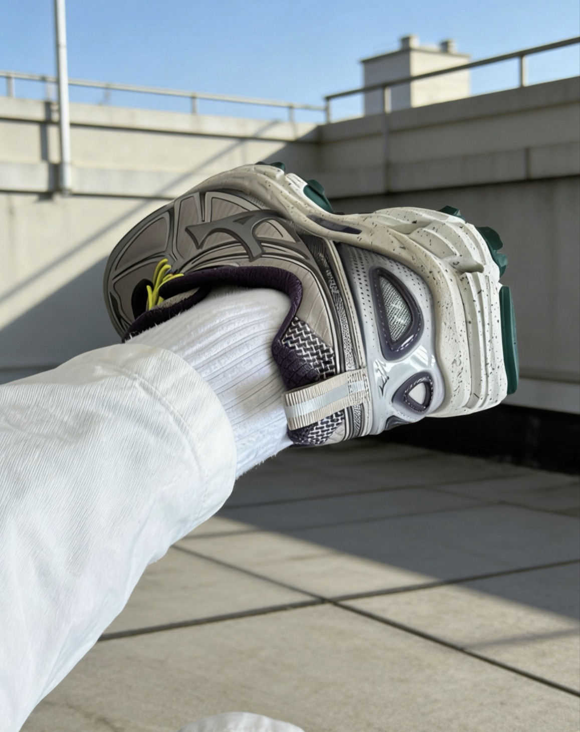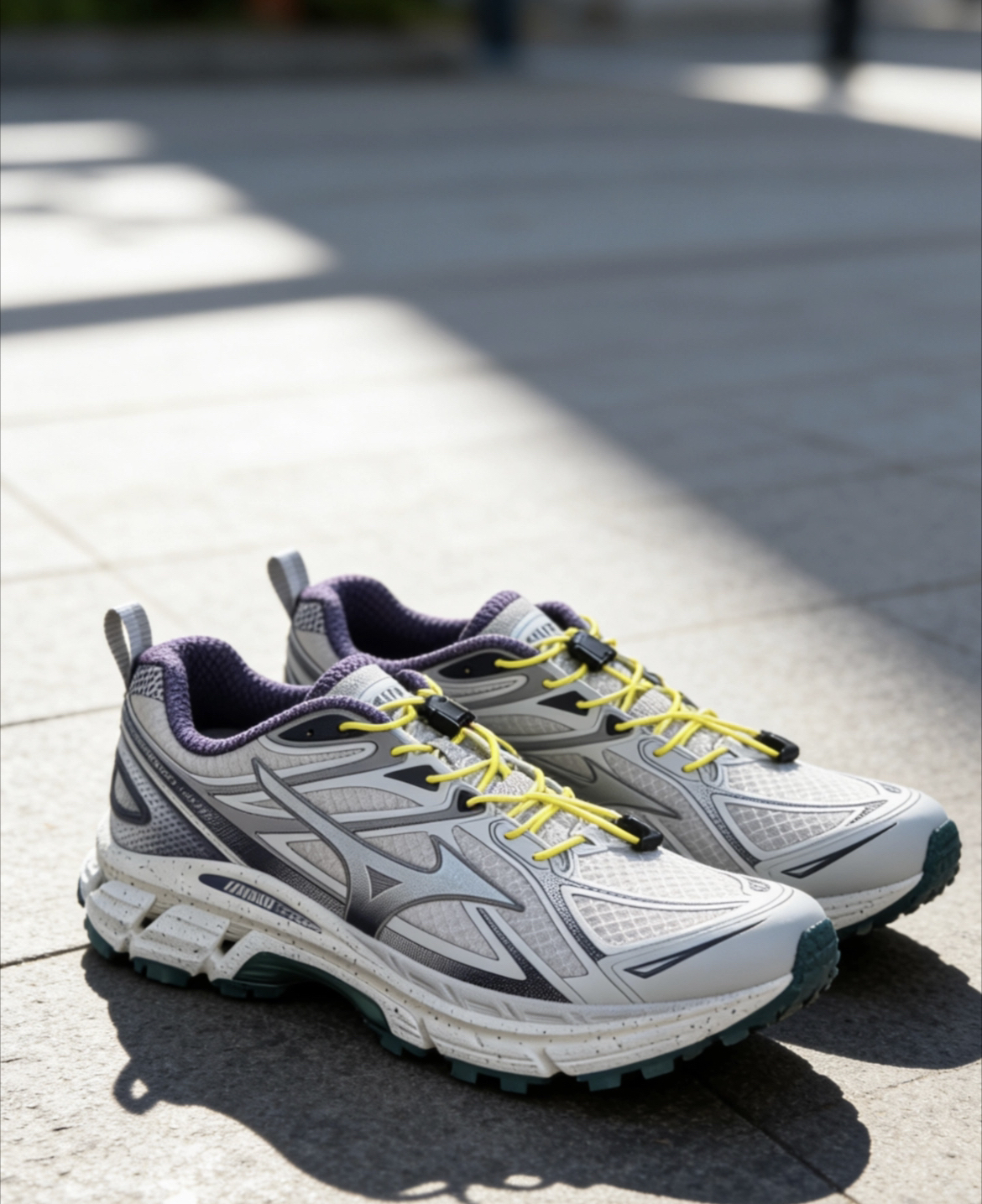 网眼鞋面透气不闷脚,发泡中底软弹又支撑,深齿纹大底抓地力拉满,雨天走路也稳。上脚超轻,完全没有老爹鞋的笨重感,浅灰+紫+荧光黄配色复古又显活力,搭白裤、工装裤都好看,通勤citywalk都能穿。 有没有同款爱穿轻量户外鞋的