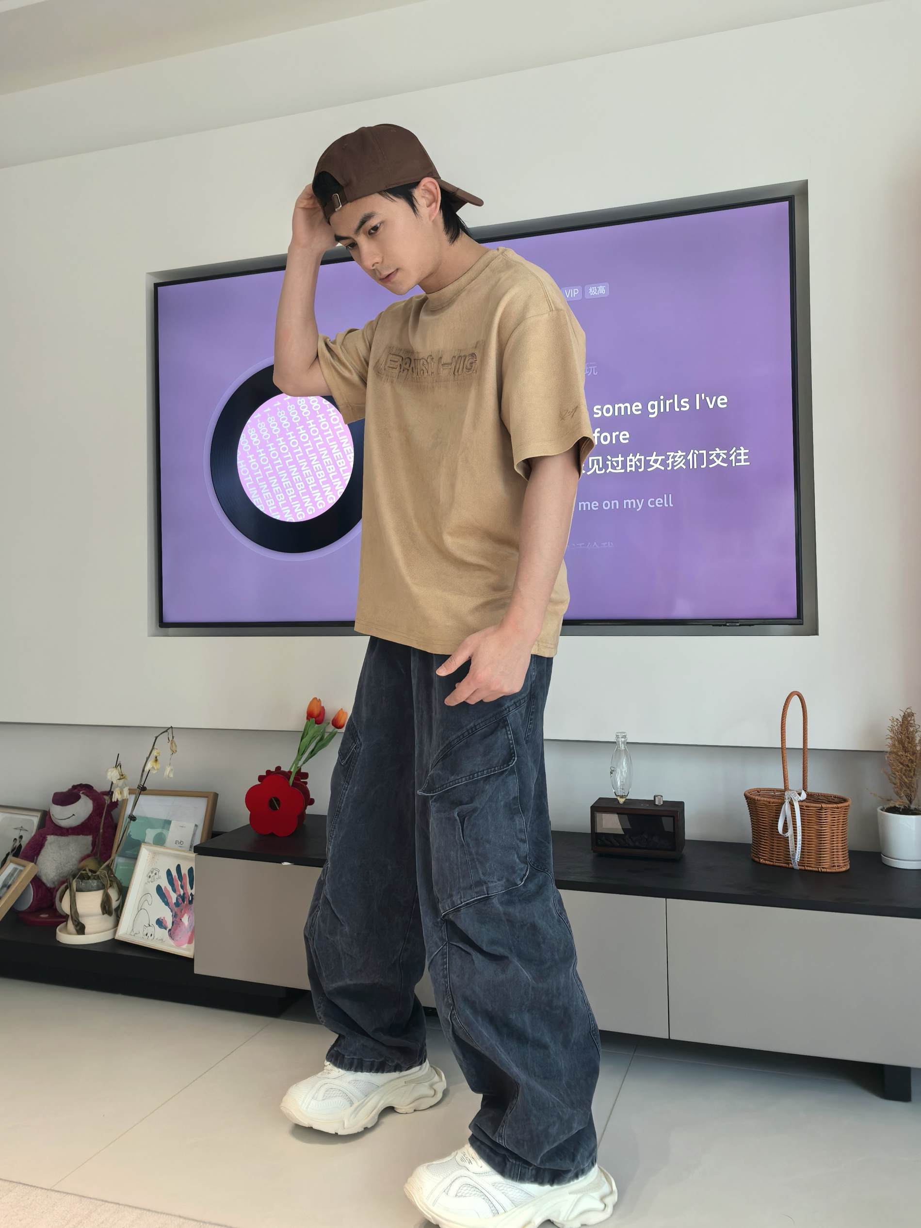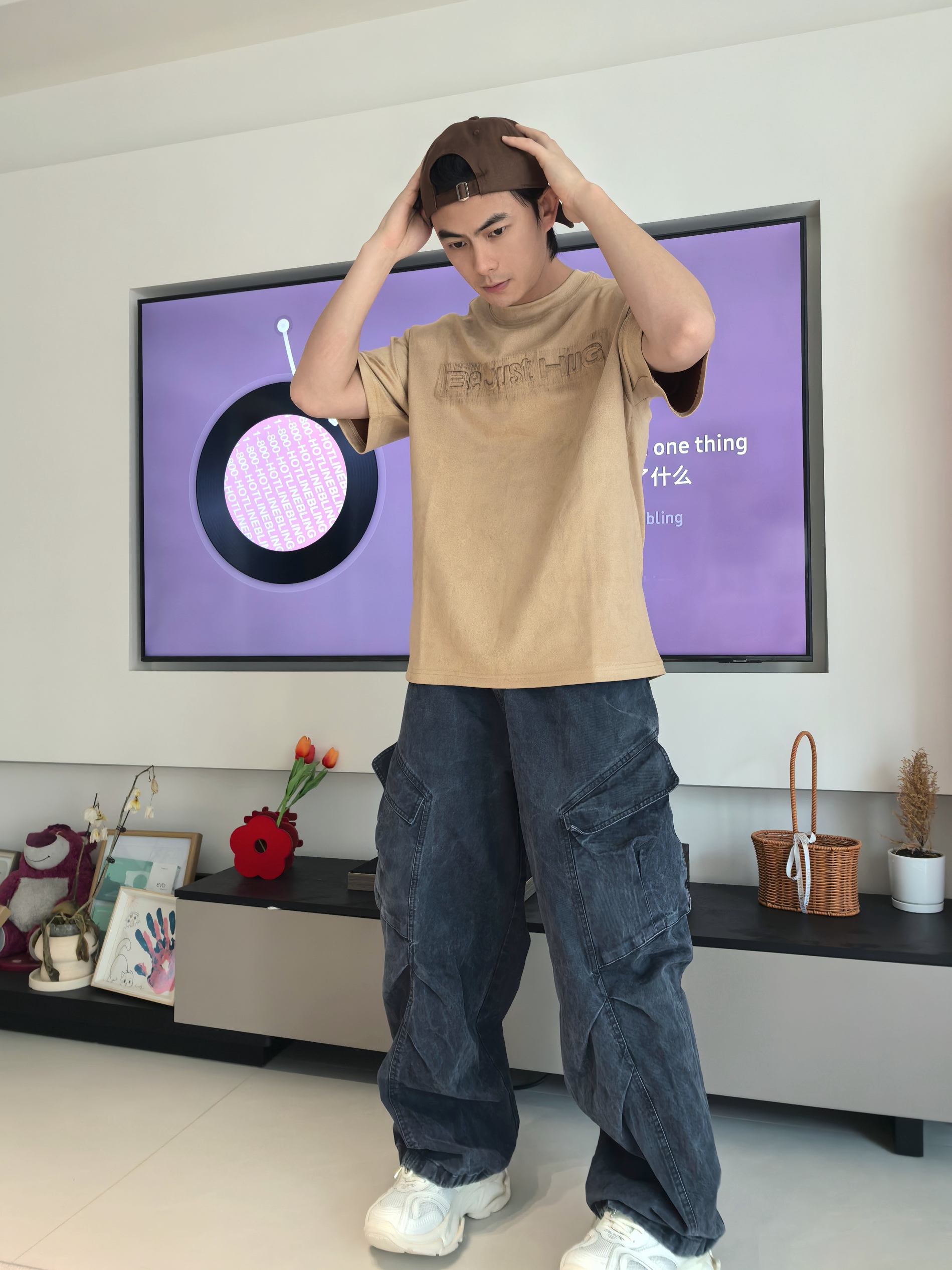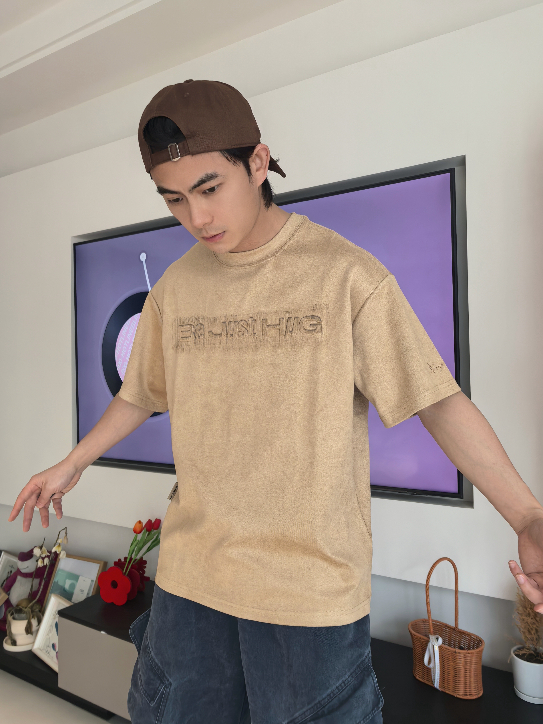 短袖一件入春冷不冷?🥶 ☘️今天我上身这件大地色系短T,不在于颜色独特,而是给我最大的感受在于麂皮绒的质感和视觉效果更显高级! 麂皮绒柔软亲肤,春季穿感受到温度正合适。 胸前是立体字母刺绣,会有一点水洗做旧效果,凸起纹路搭配麂皮绒用手触摸质感Nice! 🏃我175/135上身的M码,版型宽松落肩,搭配一条深蓝做旧宽松工装裤,鞋子是一双偏前卫的老爹鞋 整体能有美式复古氛围,不单调。 #