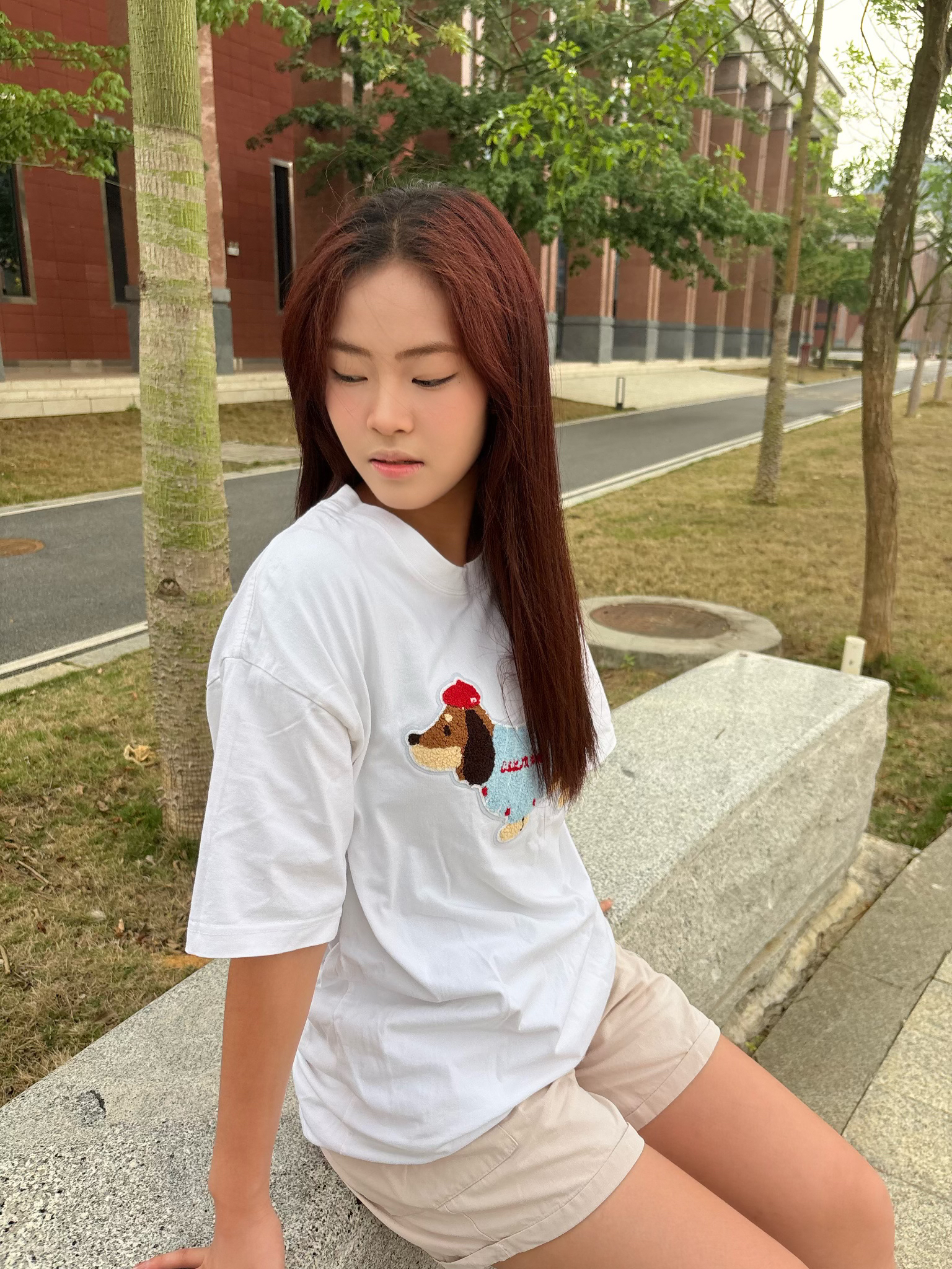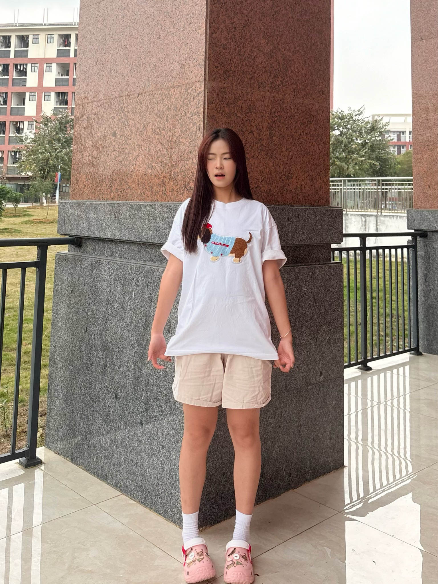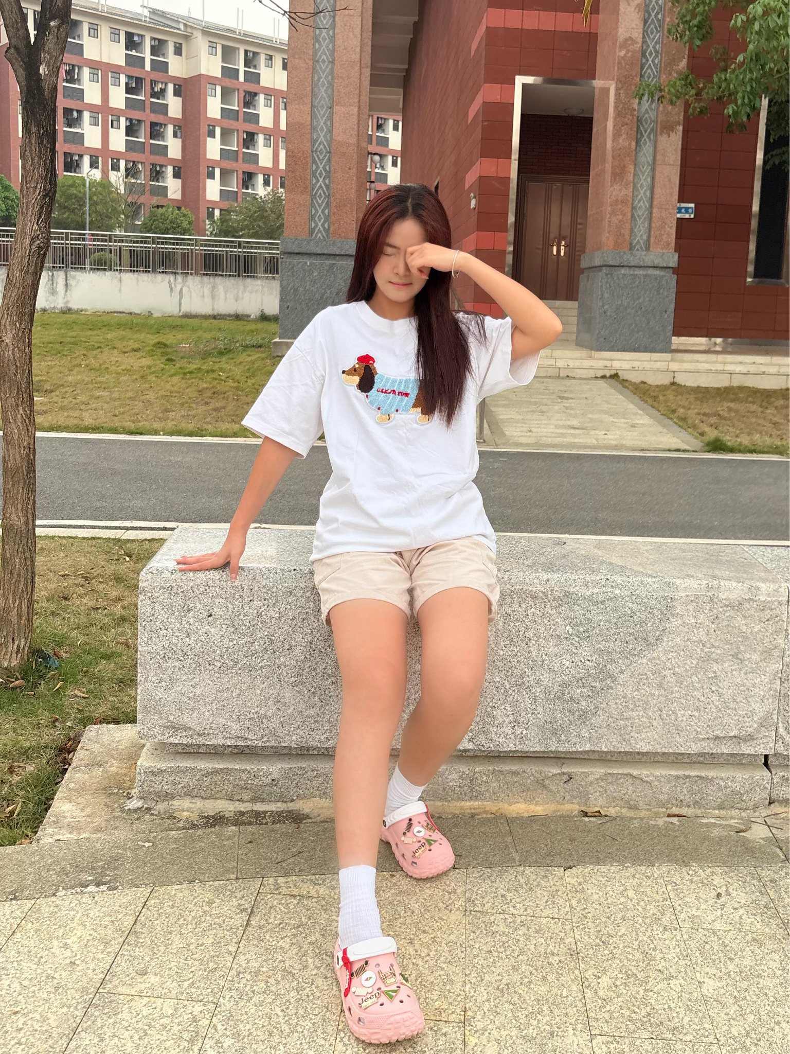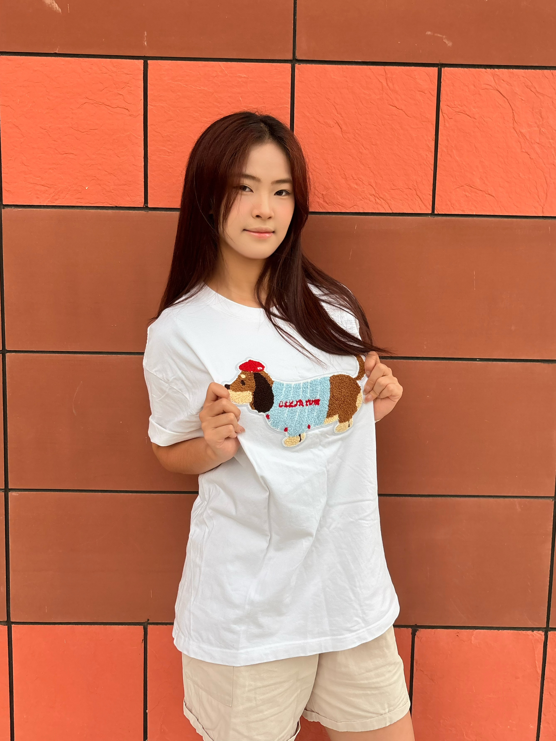 谁能拒绝一件自带可爱buff的小狗T啊! oversize版型藏住所有小肉肉,卡通腊肠狗刺绣软萌到犯规,随便搭个卡其短裤就清爽到发光~ 再踩上粉洞洞鞋配白袜,整个人都冒着甜妹气泡,上课、逛校园、拍照都能打,舒服到想焊在脚上! 不用费脑搭配,5分钟出门搞定,懒人党直接抄作业✅