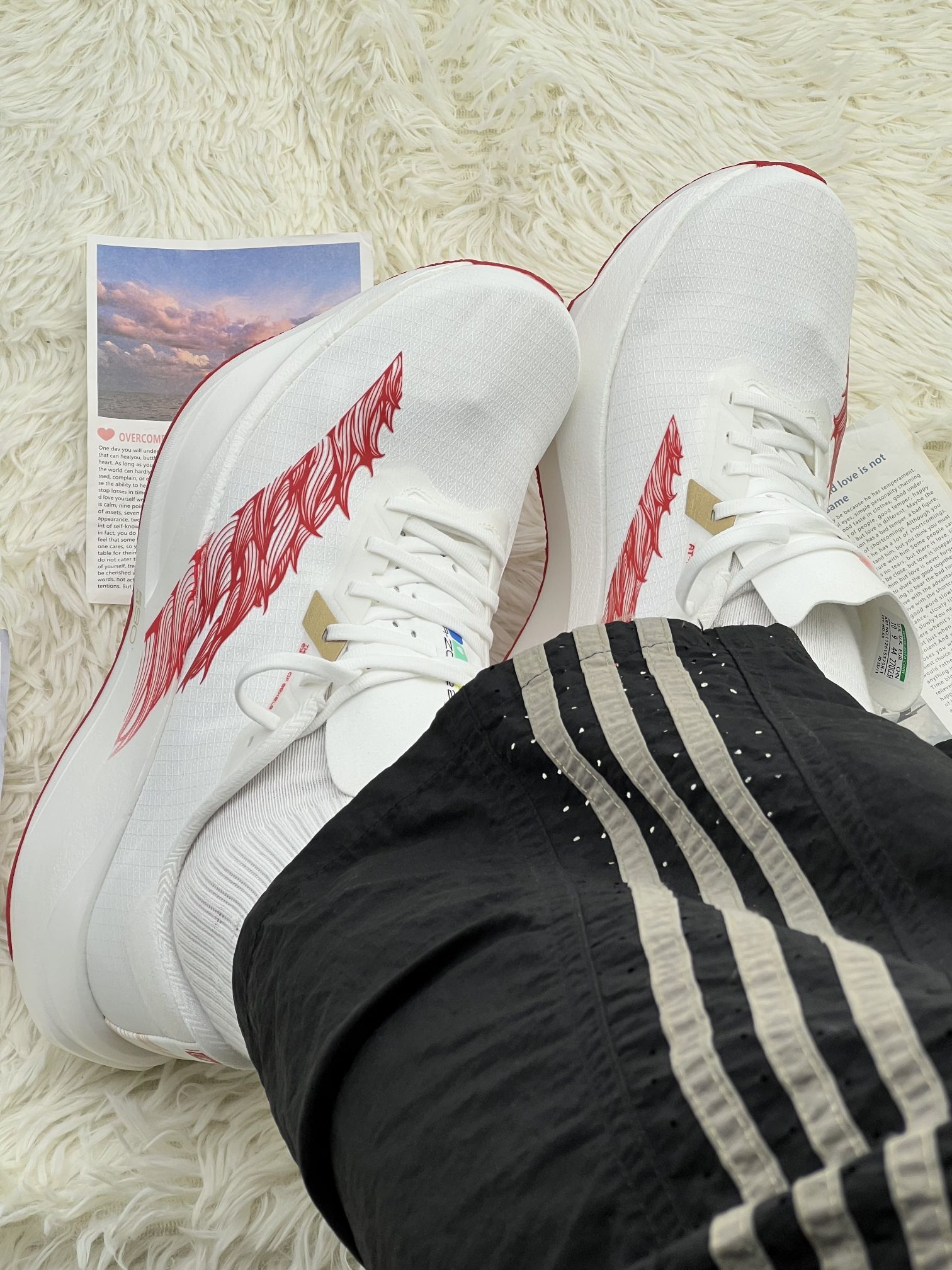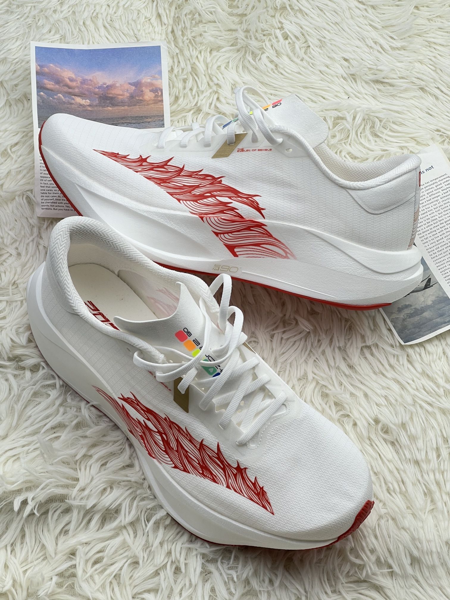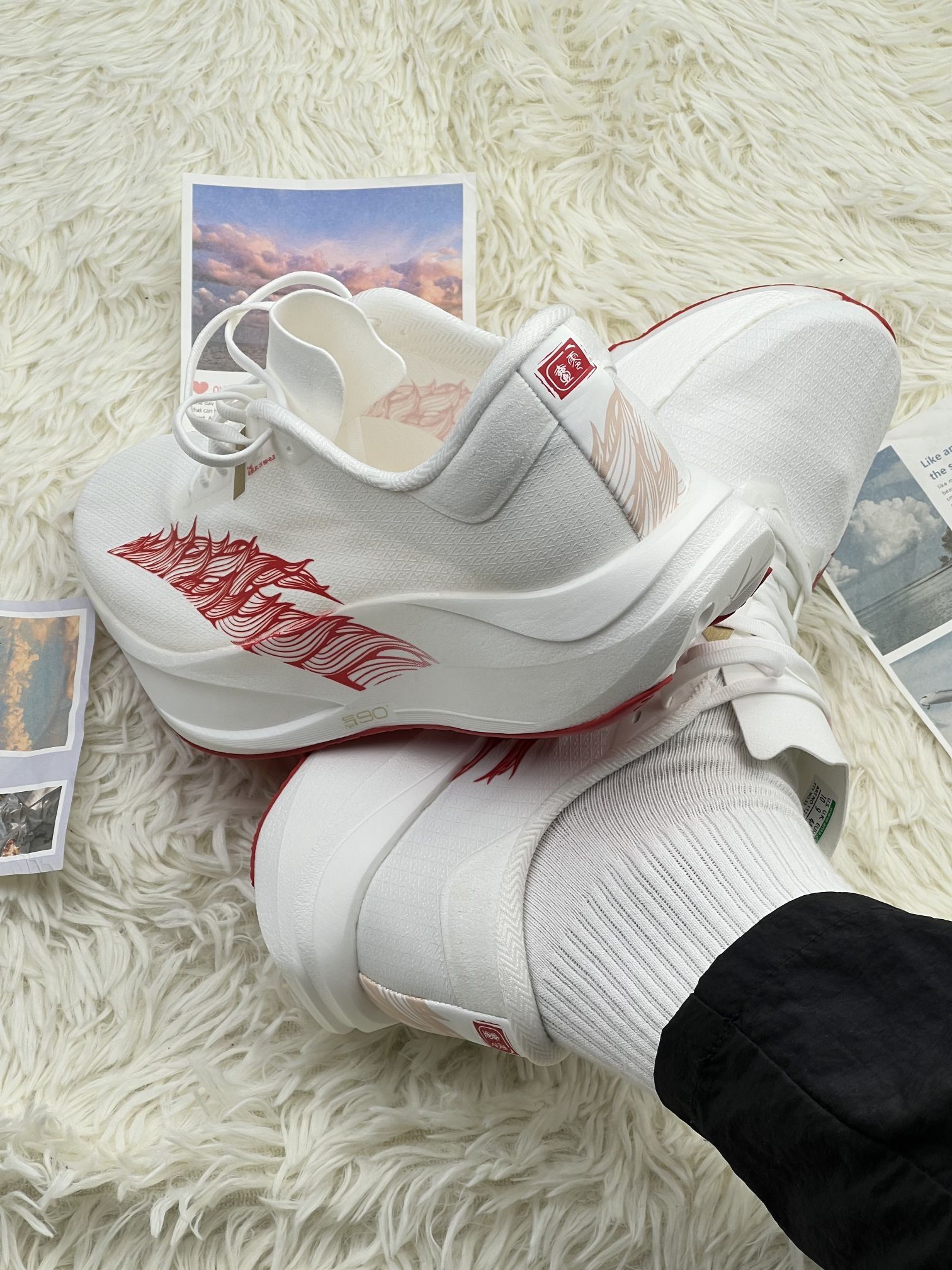 拿到手第一感觉是轻,白红配色很干净,线条感也利落,日常出街也能搭。上脚后前掌包裹偏紧,脚宽的朋友得大半码,刚穿时脚背会有点压,走久了才慢慢适应。 中底回弹不算“踩屎感”,更偏向韧弹,慢跑时能感觉到支撑,但长距离后脚跟会有点酸,缓震极限不算高。鞋面透气还行,夏天通勤不闷,但网布偏薄,担心久穿容易勾丝起球。 最大的槽点是鞋舌容易跑偏,跑起来得时不时拉一下;还有鞋底纹路偏浅,湿滑路面要小心打滑。...