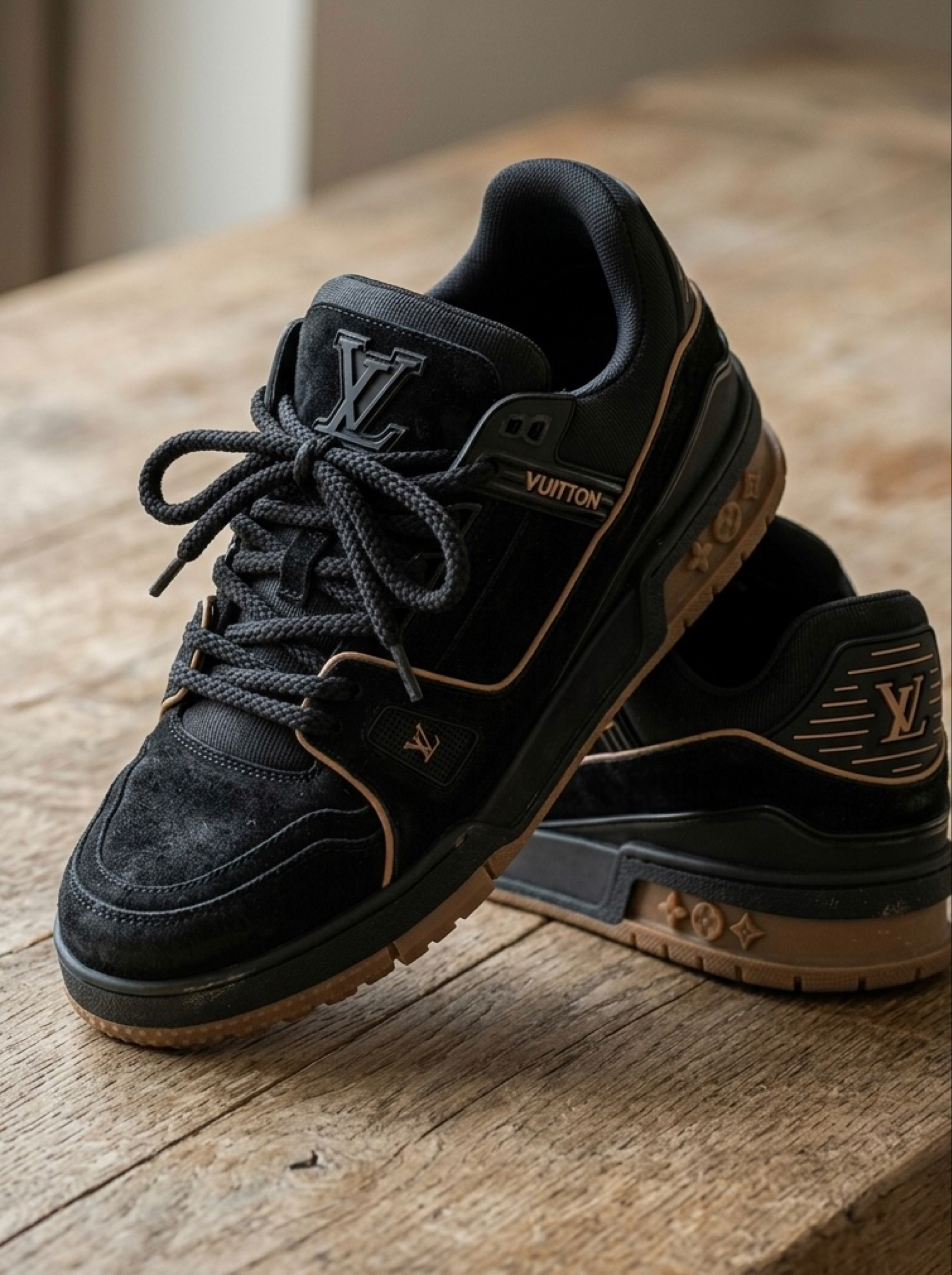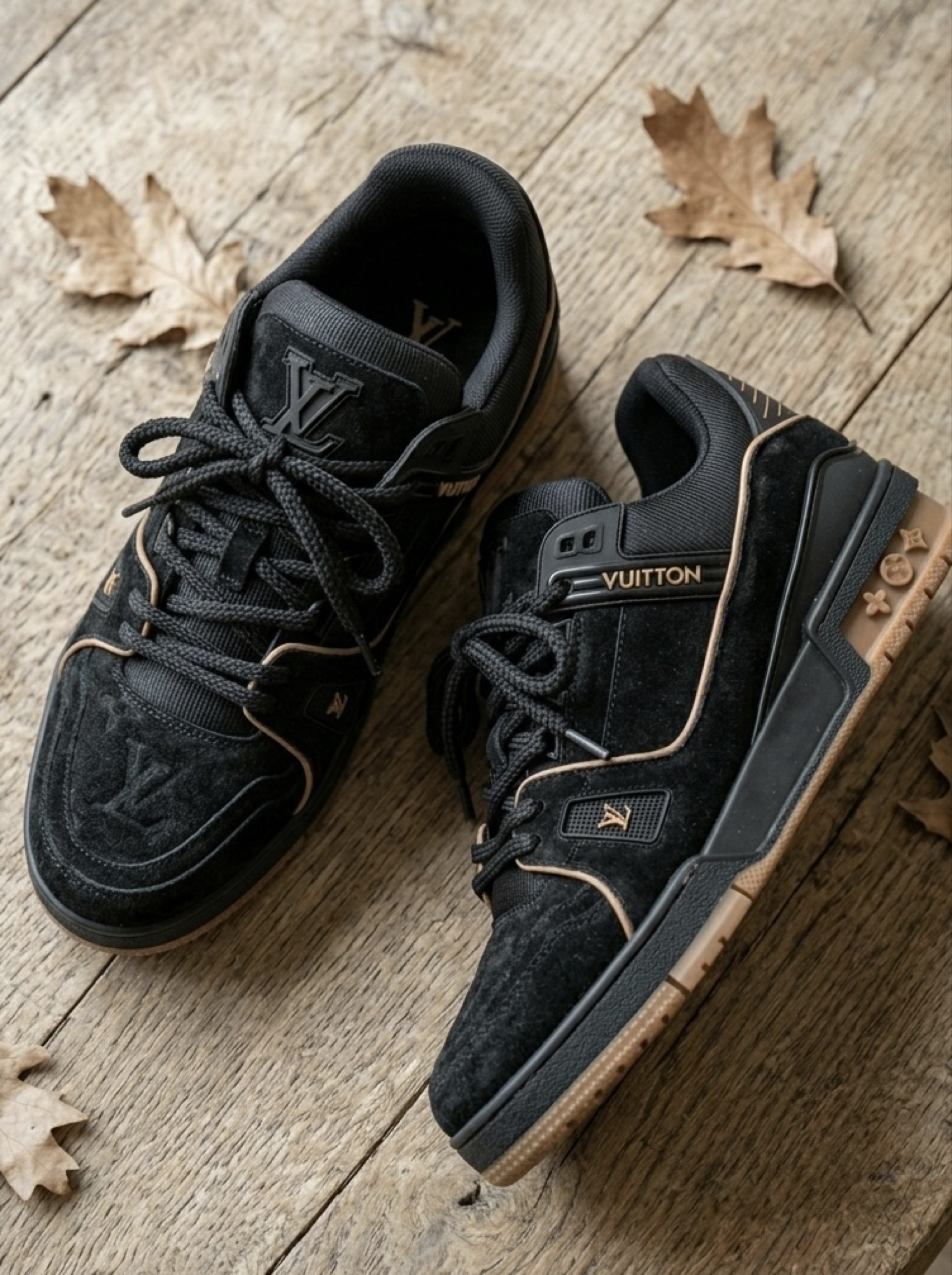 这双LV Trainer Maxi小胖丁是我最近出门穿得最多的一双板鞋,整体是全黑麂皮配生胶底的搭配,看着就很有质感,男生穿特别显稳重。 鞋型是那种有点“胖胖”的感觉,比普通Trainer更圆润,上脚不会显得笨重,反而带点憨感,对脚型包容度也高,宽脚穿也不挤。全黑麂皮的材质摸起来绒绒的,质感细腻,虽然麂皮打理要稍微注意点,但日常小污渍擦一擦就干净,耐脏性还可以。生胶底和黑色鞋面的撞色不会太单调,...