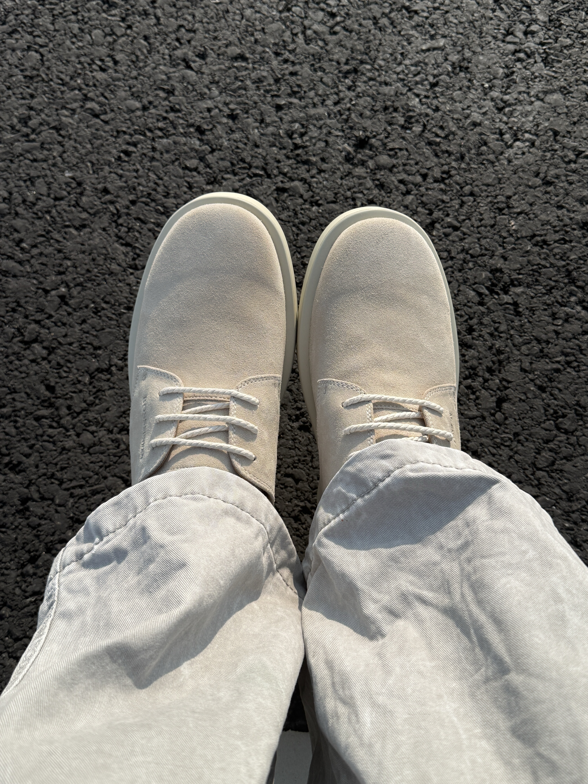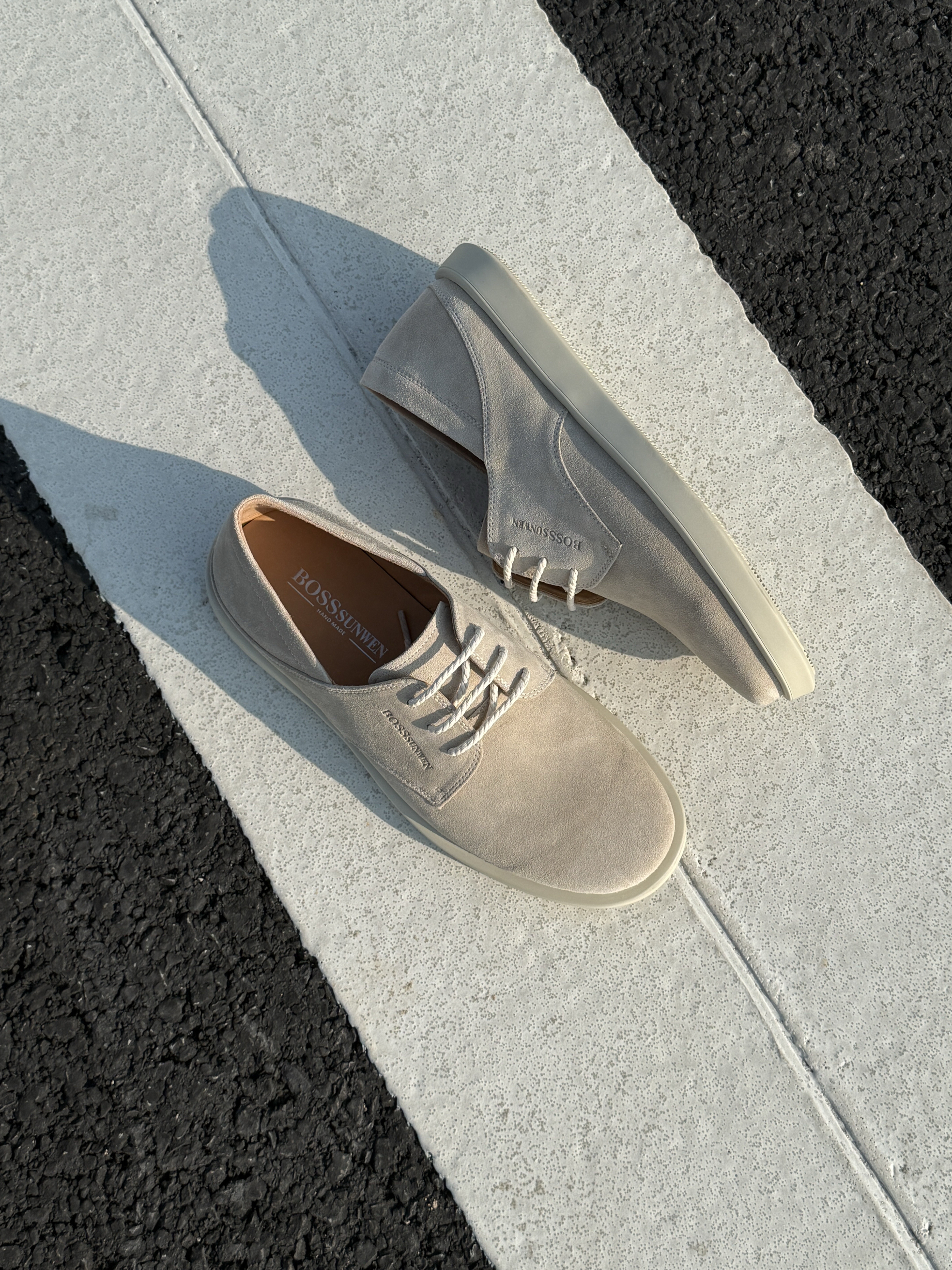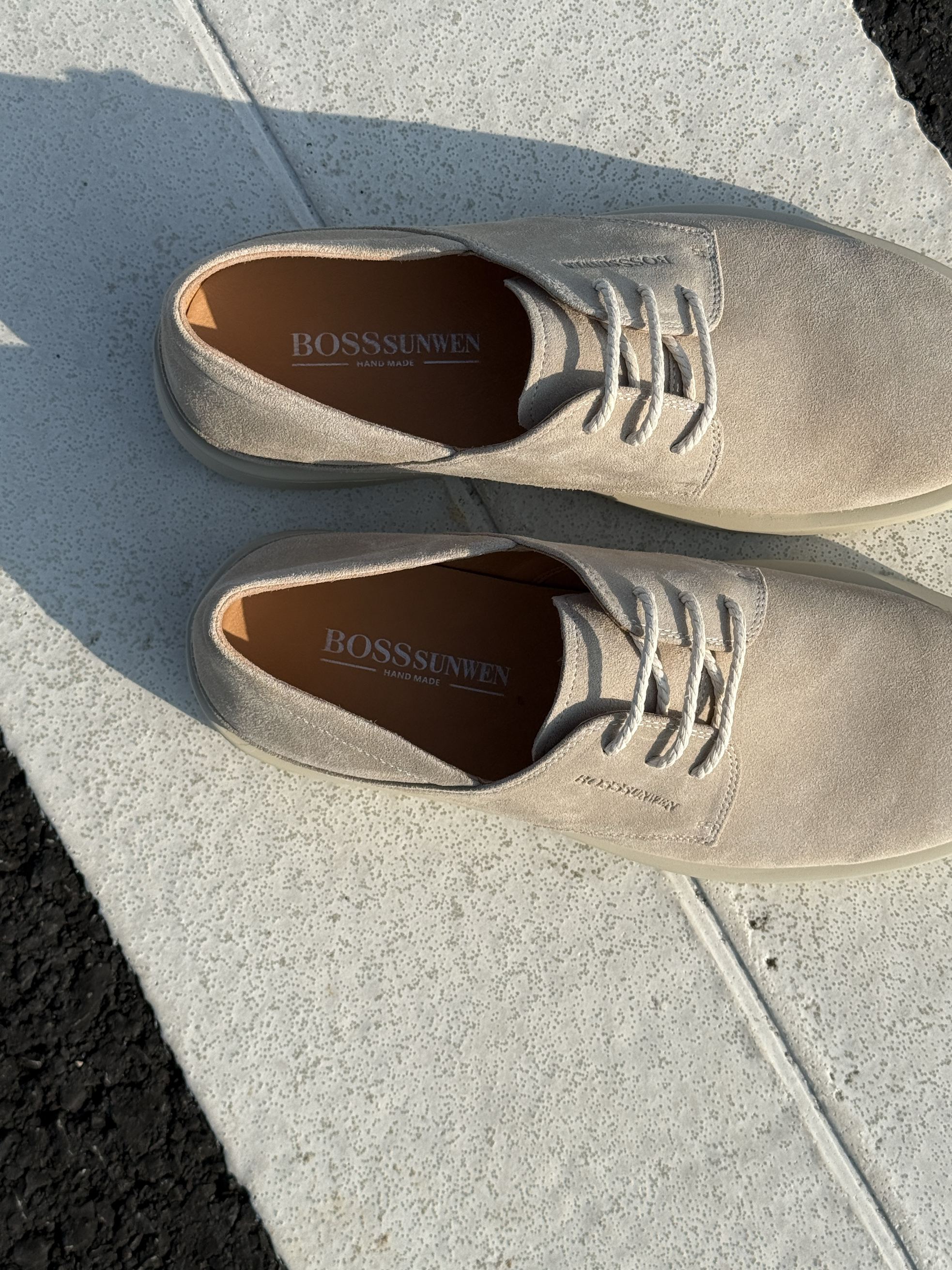 这段时间通勤基本都靠这双鞋,越穿越觉得选对了。 整体是很干净的沙色翻毛皮,不是那种容易显脏的米白,也不会太沉闷,搭牛仔裤、休闲裤都很顺,不用费脑子想搭配。鞋型是偏简约的德比款,没有多余的设计,日常穿不突兀,就算是稍微正式一点的场合也能hold住,不会太随意。 上脚最直观的就是舒服,鞋底是软弹的那种,不是硬邦邦的皮鞋底,每天走个大几千步,脚也不会累。鞋后跟还能踩下去当拖鞋穿,赶时间或者办公室换鞋...