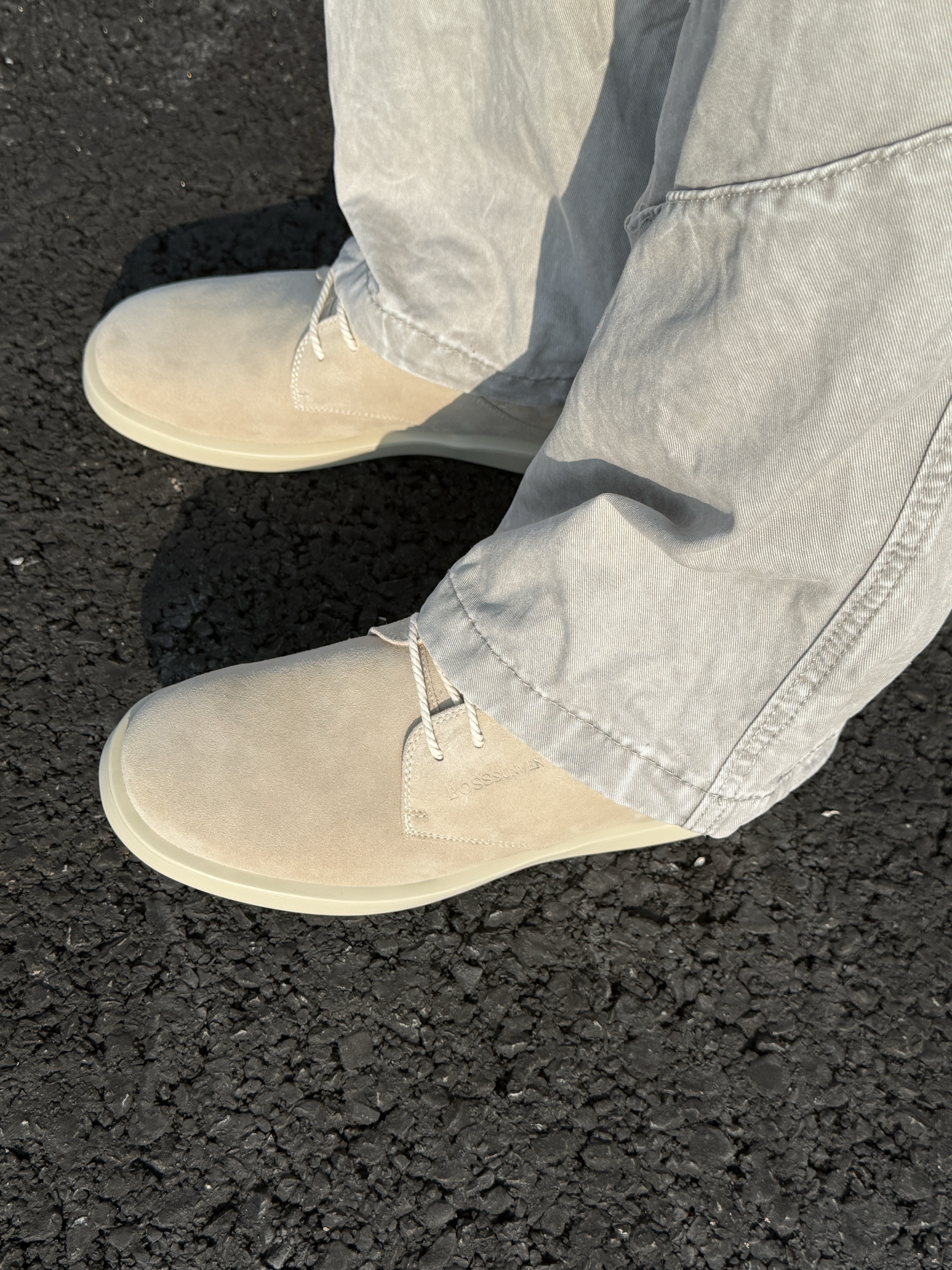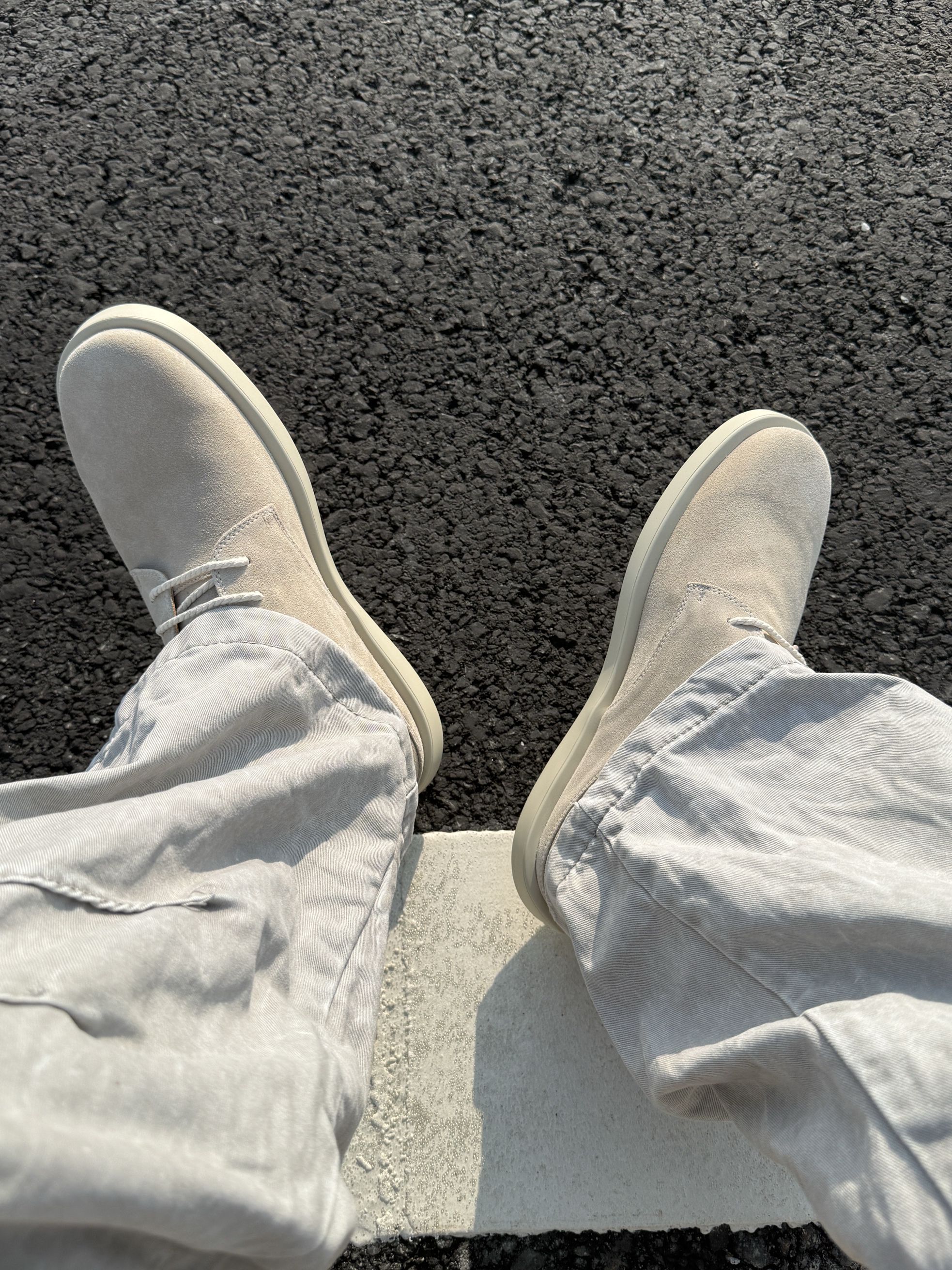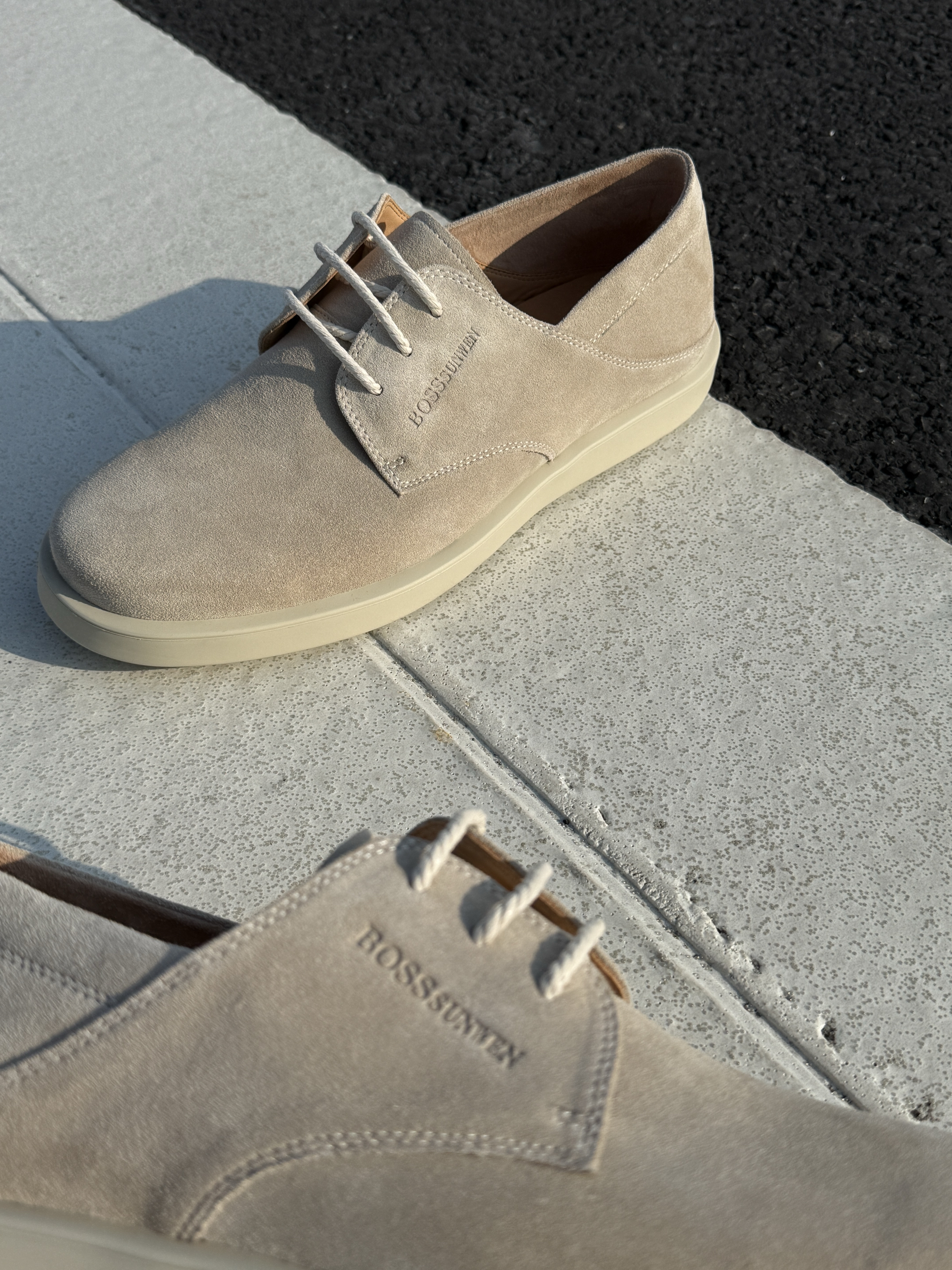这段时间通勤基本都靠这双鞋,越穿越觉得选对了。 整体是很干净的沙色翻毛皮,不是那种容易显脏的米白,也不会太沉闷,搭牛仔裤、休闲裤都很顺,不用费脑子想搭配。鞋型是偏简约的德比款,没有多余的设计,日常穿不突兀,就算是稍微正式一点的场合也能hold住,不会太随意。 上脚最直观的就是舒服,鞋底是软弹的那种,不是硬邦邦的皮鞋底,每天走个大几千步,脚也不会累。鞋后跟还能踩下去当拖鞋穿,赶时间或者办公室换鞋...