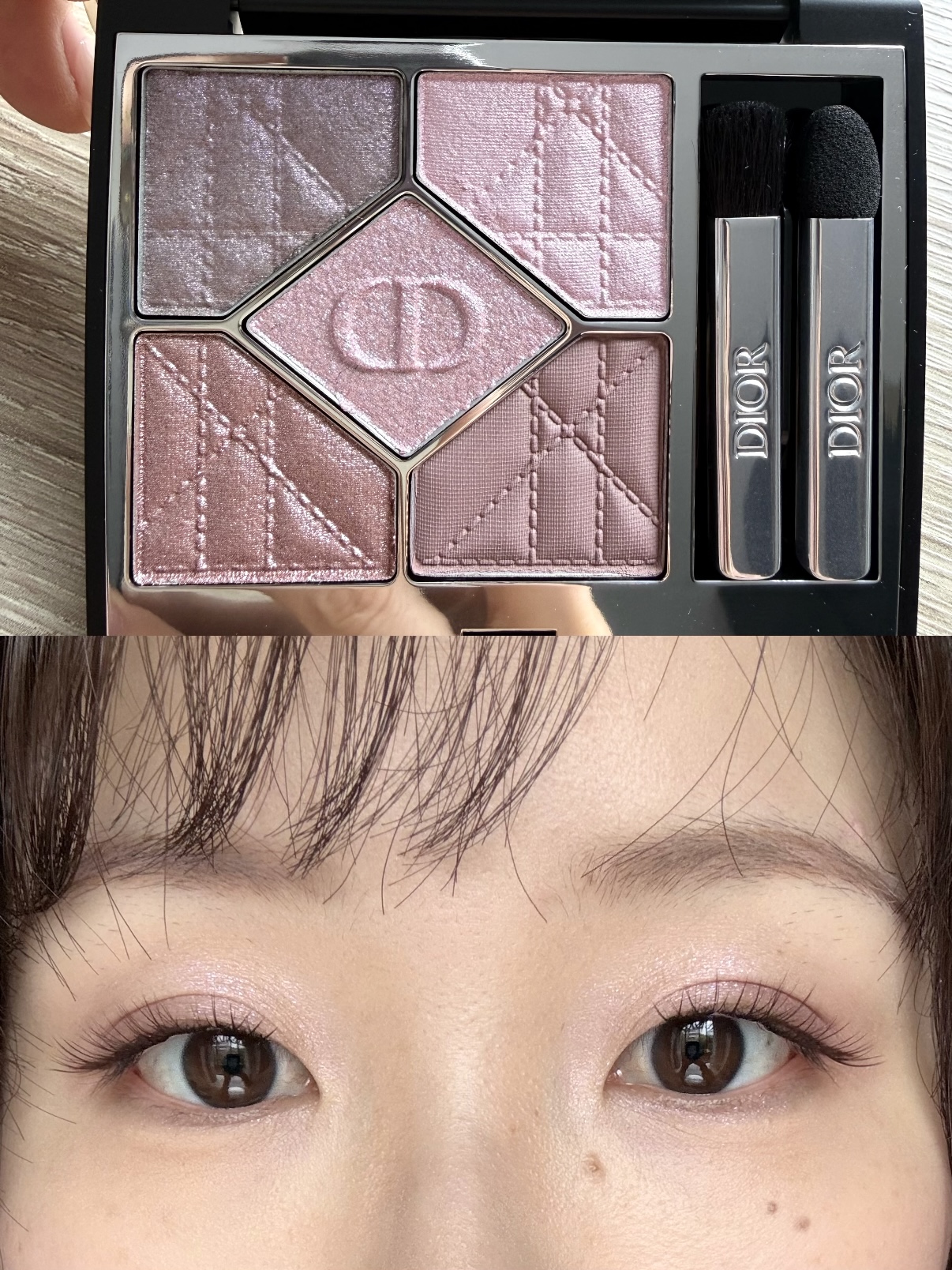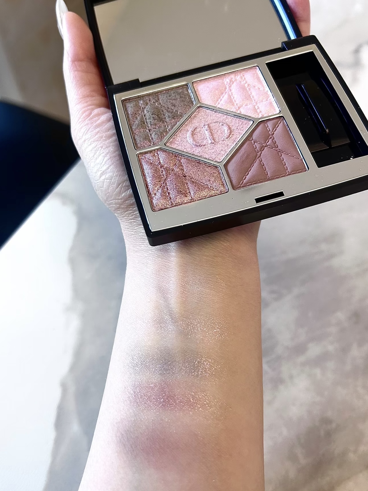 不枉我费尽周折蹲了这么久 颜色太戳我了非常貌美非常好看!! 有种富家千金的清冷感,冷色盘,非常之美丽,右上角其实是一颗淡粉,自然光下看看其实比官网上冷很多,右下角上眼是冷粉棕,左下微暖但本冷橄榄可以接受。 显色度不算特别高,也可能是我下手太轻了(技术不好哈),但是中间那颗真的巨好看!有点泛紫很清透的闪片,完全点睛之笔!特别适合夏日冷调清透的妆,浅夏冲冲冲!