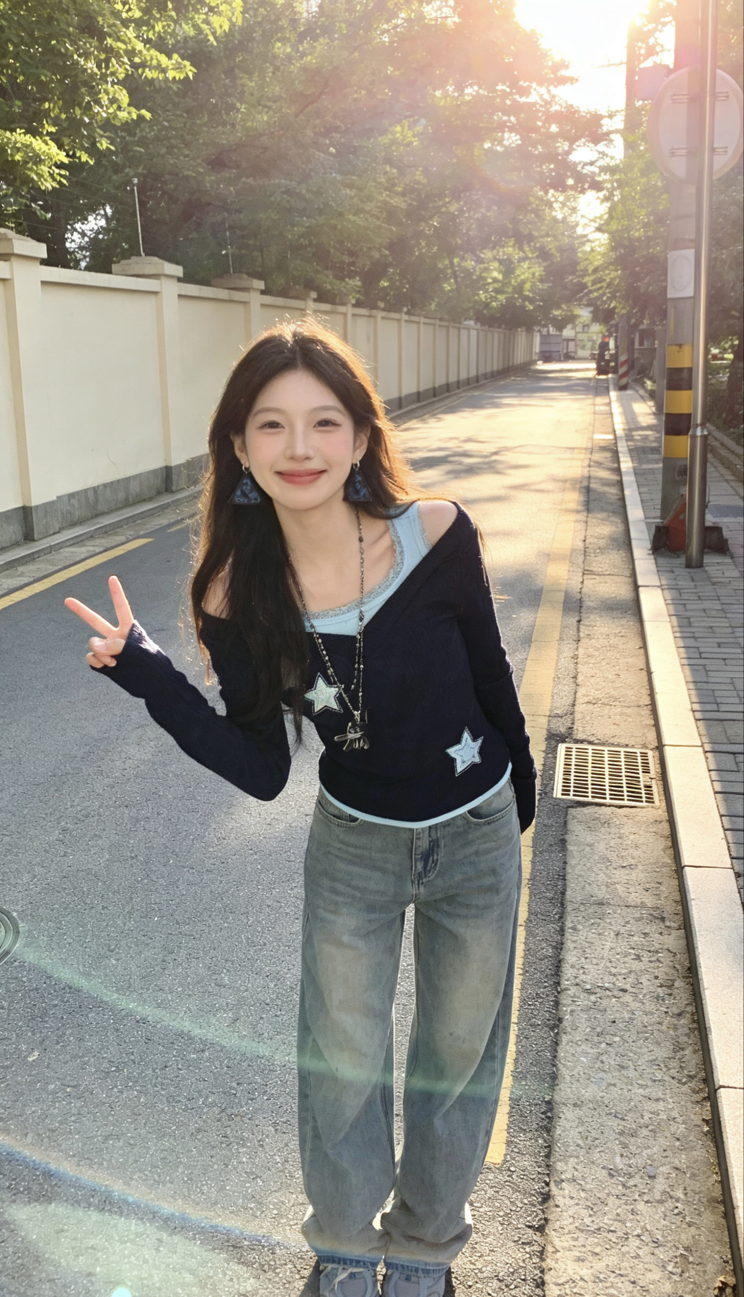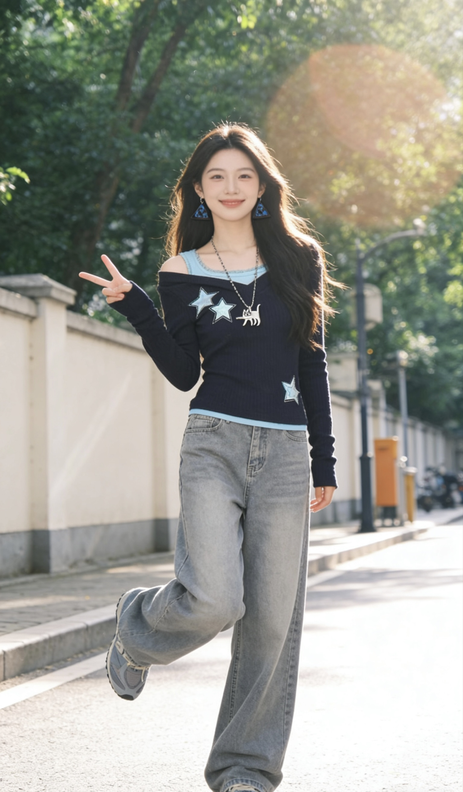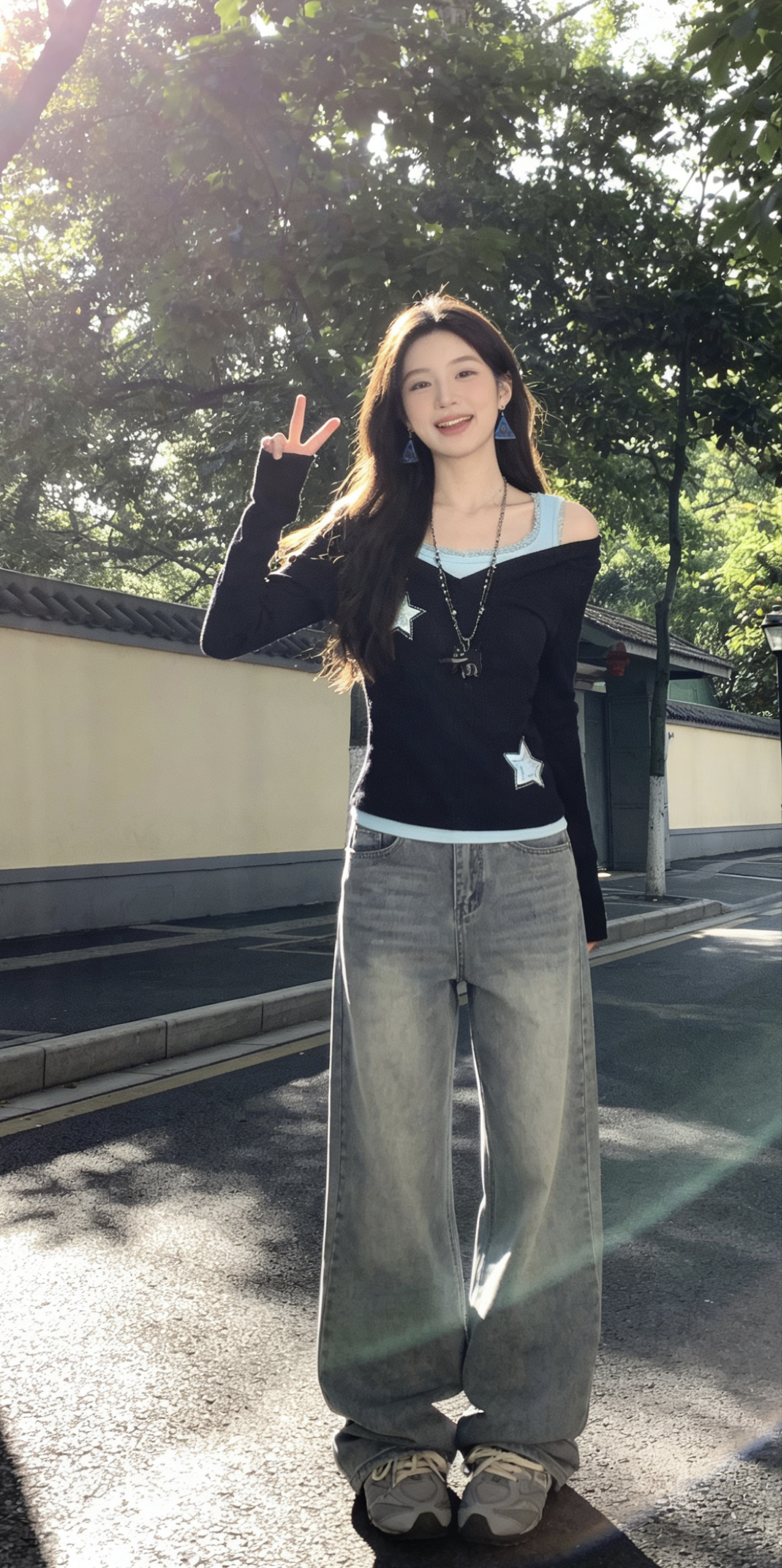 谁懂啊!这套早春辣妹穿搭真的又酷又甜,直接焊在身上! 黑蓝撞色假两件上衣,露肩设计+星星贴布,又甜又拽,修身版型把腰线掐得刚刚好,叠戴两条项链氛围感直接拉满~ 搭配浅蓝阔腿牛仔裤,复古做旧感+明线口袋,慵懒随性又显腿长,梨形身材也能轻松藏肉! 配饰细节超加分💙 三角陶瓷耳饰+搞怪小猫项链,个性又吸睛,再踩上灰蓝拼色德训鞋,走路带风的韩系慵懒感直接拉满! 春日阳光下随手一拍,发丝都在发光,青春活力...