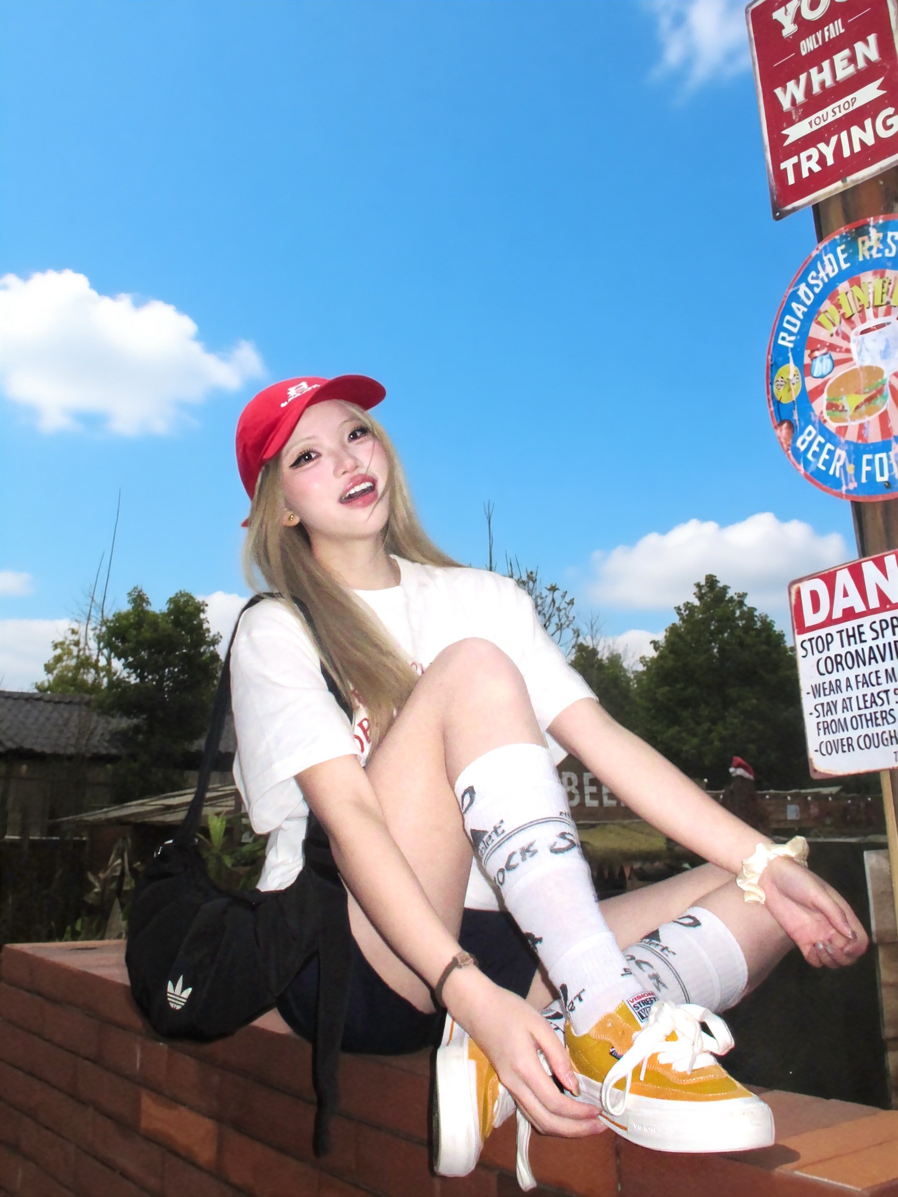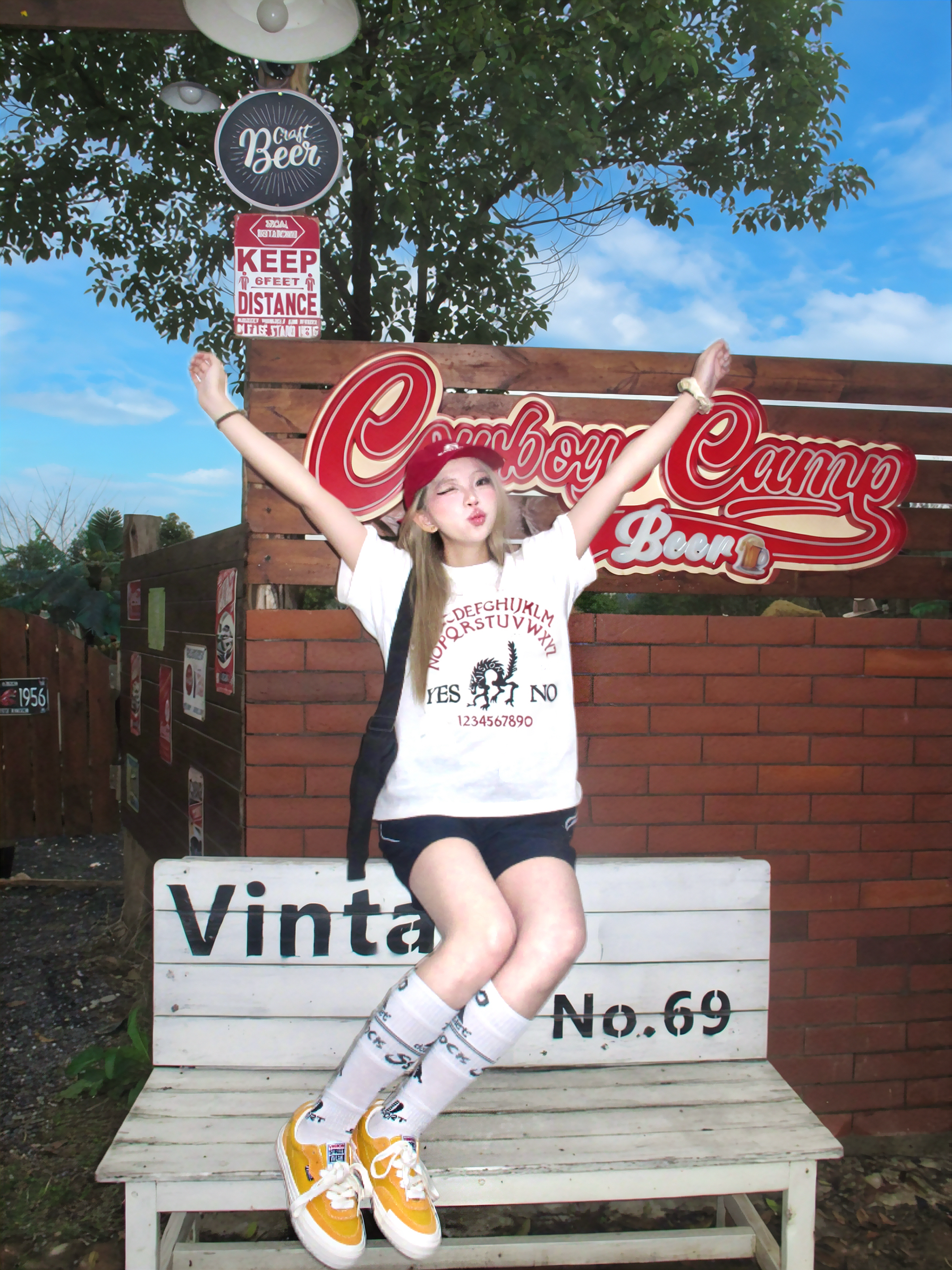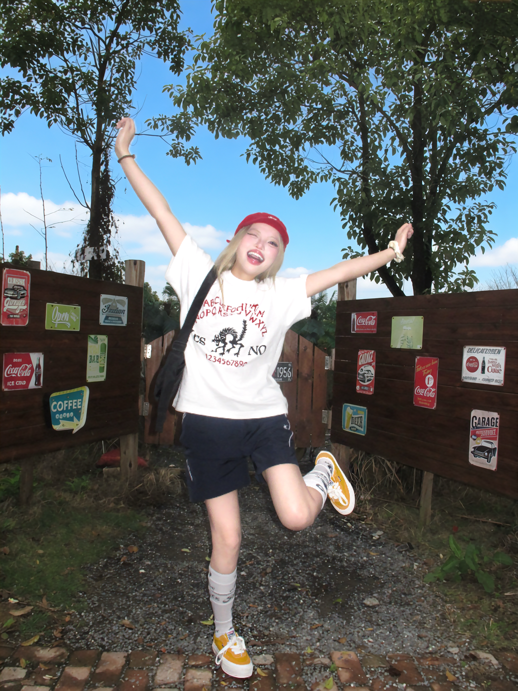 谁懂晴天穿美式出街的快乐~ 白色字母印花t恤搭配藏蓝色短裤 一套好经典又慵懒 搭配运动袜配vision黄色板鞋💛 色彩安排起来好有春天感! 另外选择红色的棒球帽作搭配 有复古美式那味了✌️🧱 再背上黑色云朵包 跟我一起出街~