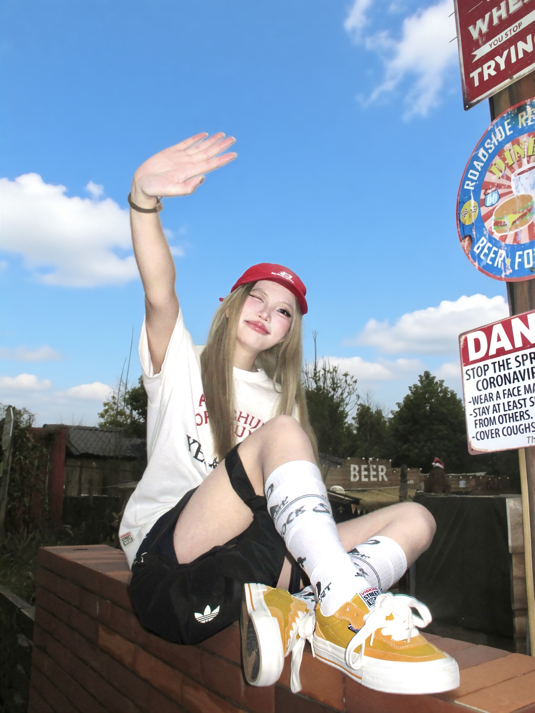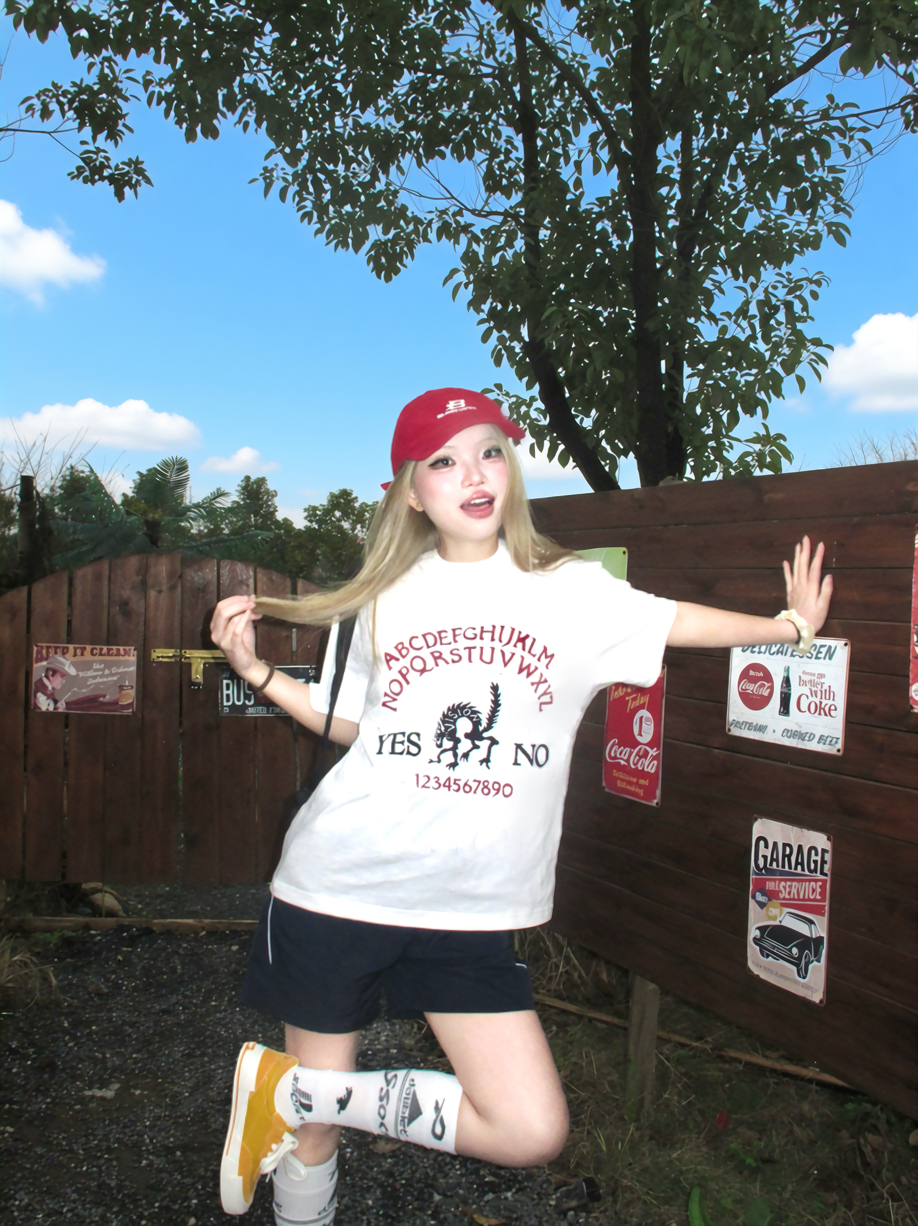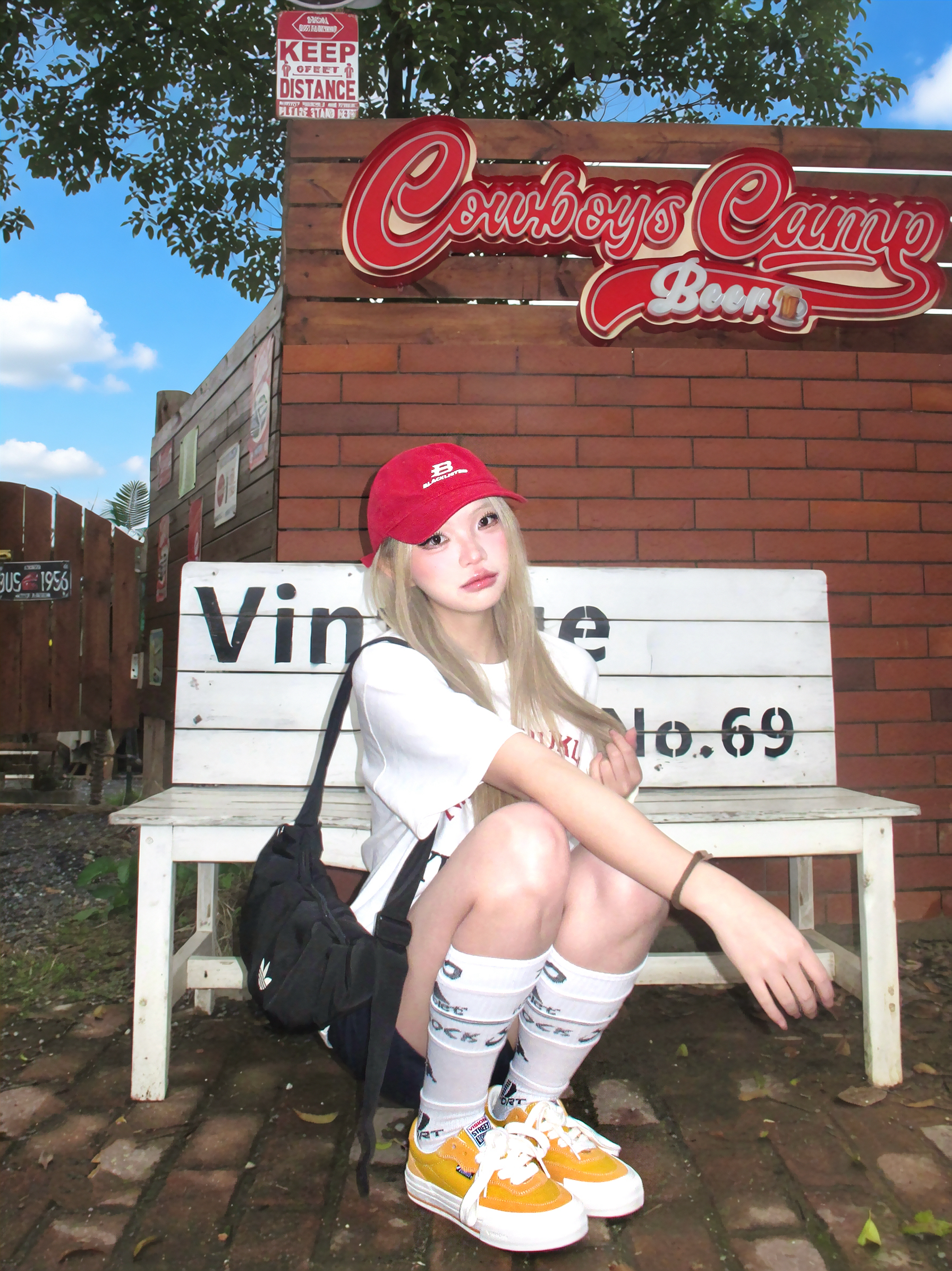 谁懂晴天穿美式出街的快乐~ 白色字母印花t恤搭配藏蓝色短裤 一套好经典又慵懒 搭配运动袜配vision黄色板鞋💛 色彩安排起来好有春天感! 另外选择红色的棒球帽作搭配 有复古美式那味了✌️🧱 再背上黑色云朵包 跟我一起出街~