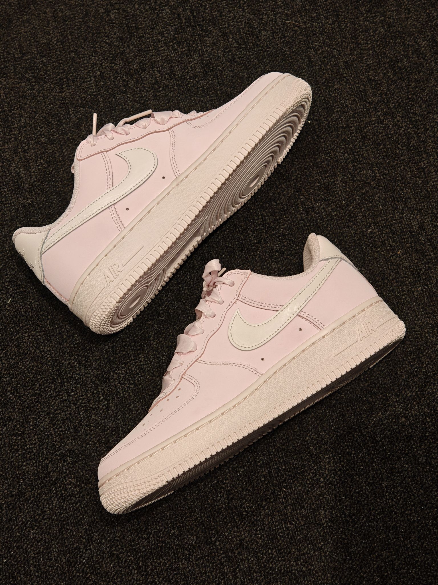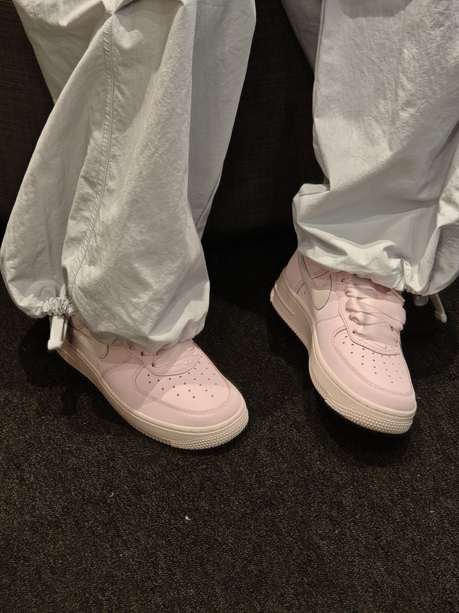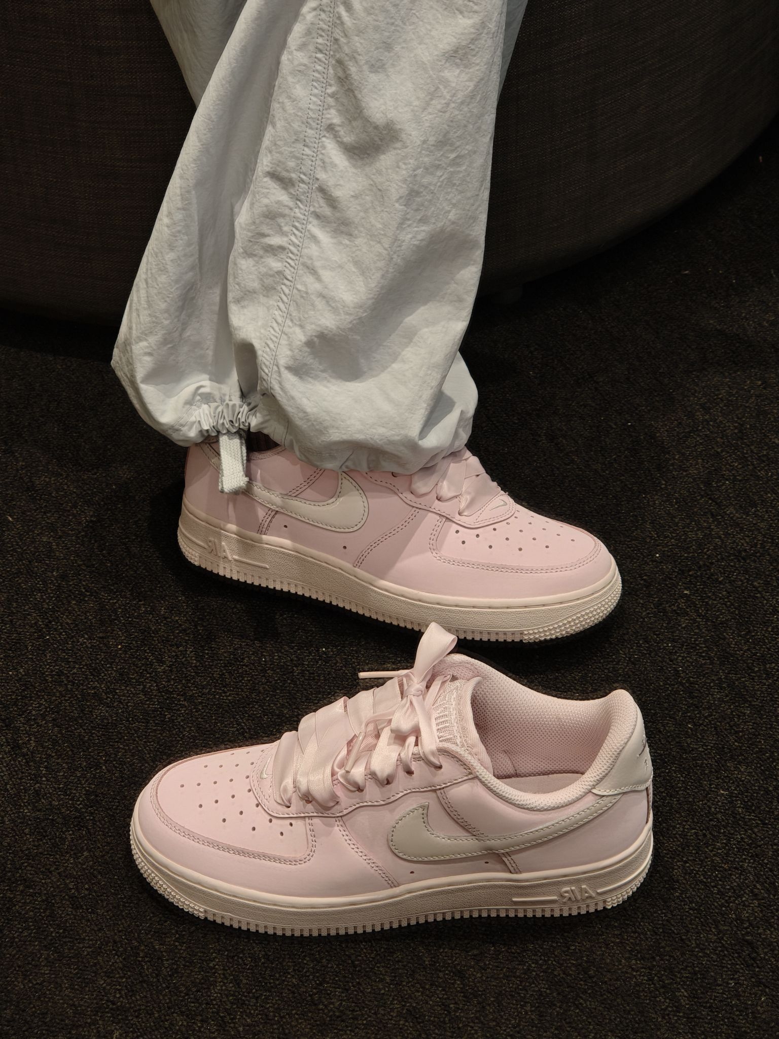 谁还没被这双粉空军戳中少女心啊💖 浅粉奶fufu的,配上缎面鞋带,温柔又显贵! 上脚软乎乎,走路带风还显脚小, 搭牛仔裤、百褶裙都绝了,甜妹直接焊在脚上!