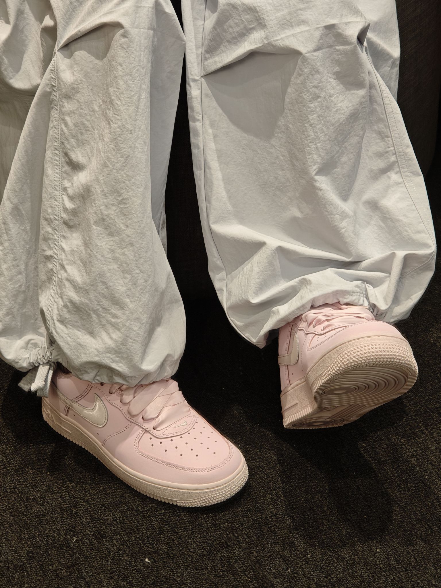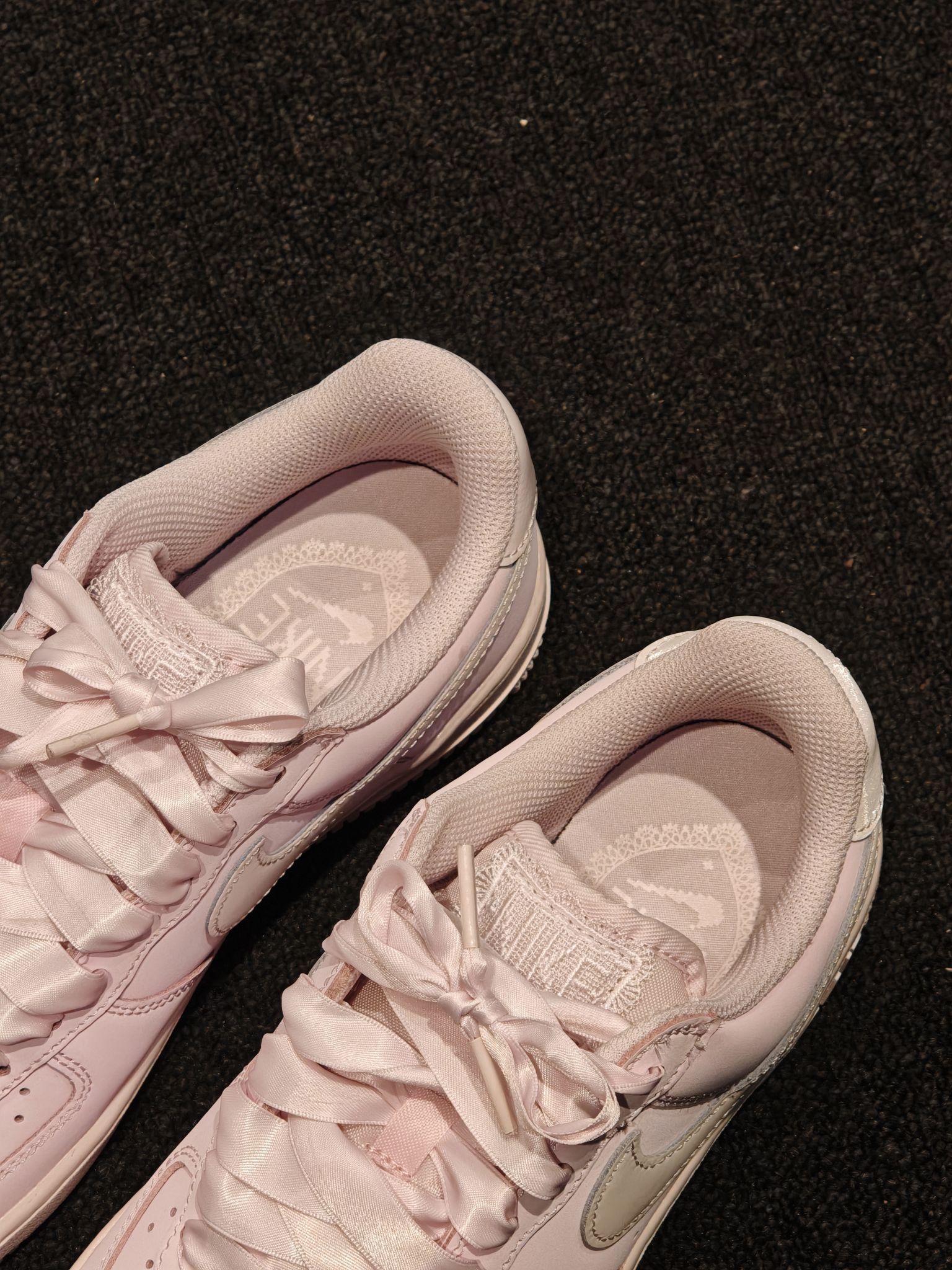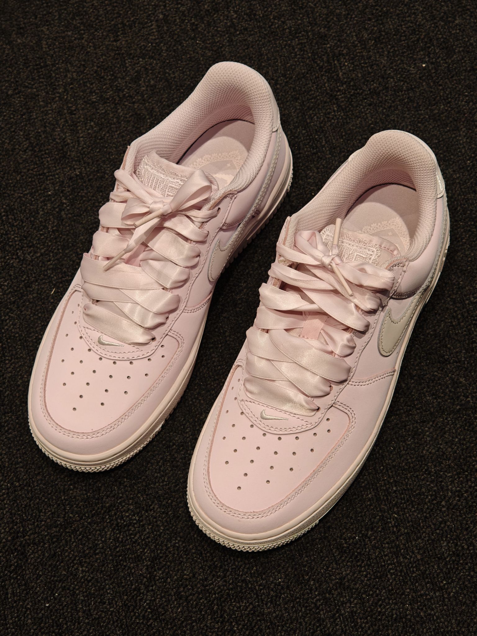 谁还没被这双粉空军戳中少女心啊💖 浅粉奶fufu的,配上缎面鞋带,温柔又显贵! 上脚软乎乎,走路带风还显脚小, 搭牛仔裤、百褶裙都绝了,甜妹直接焊在脚上!