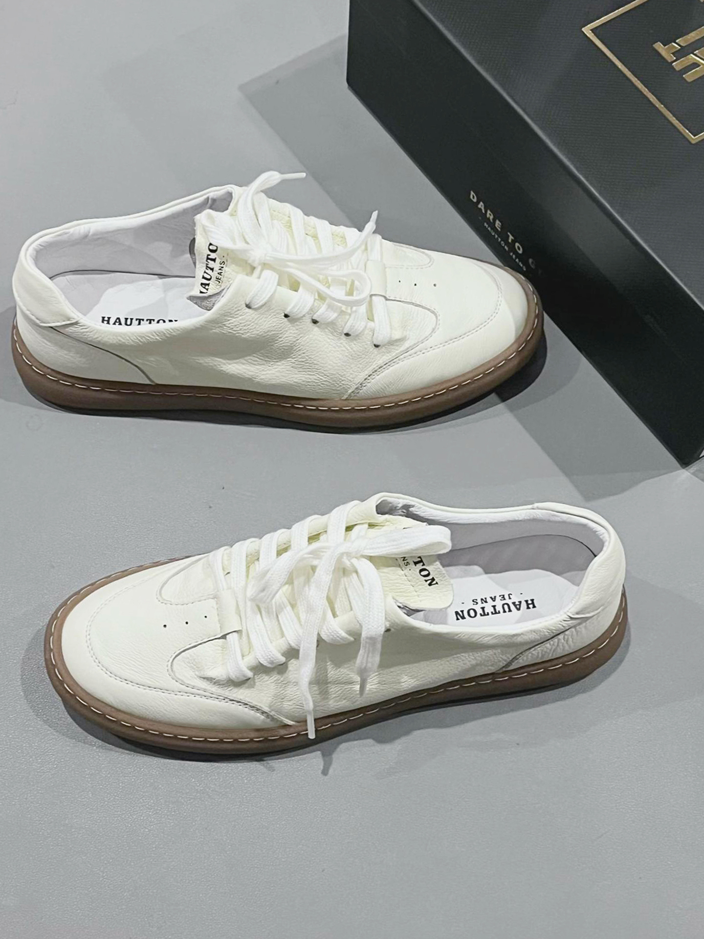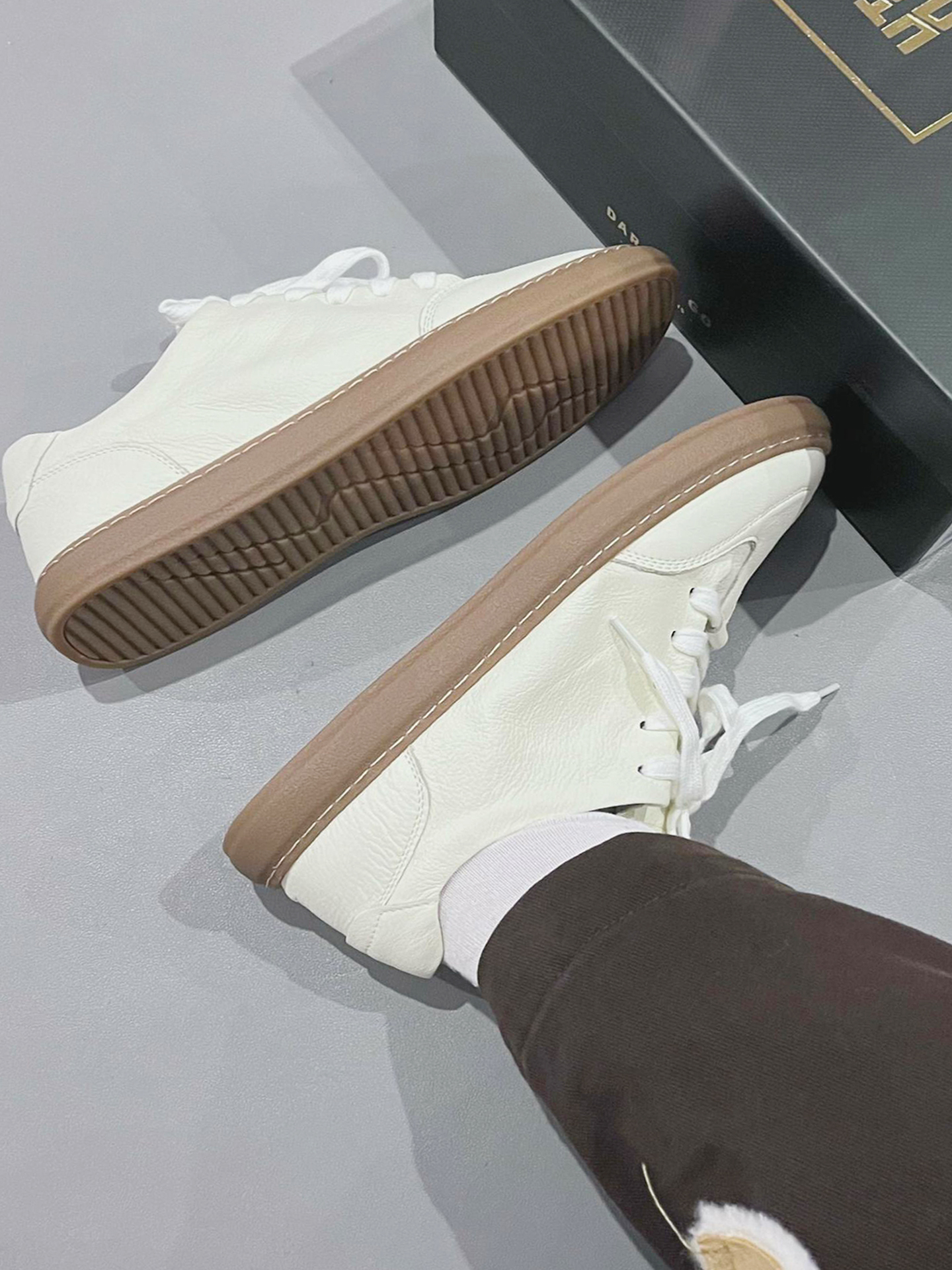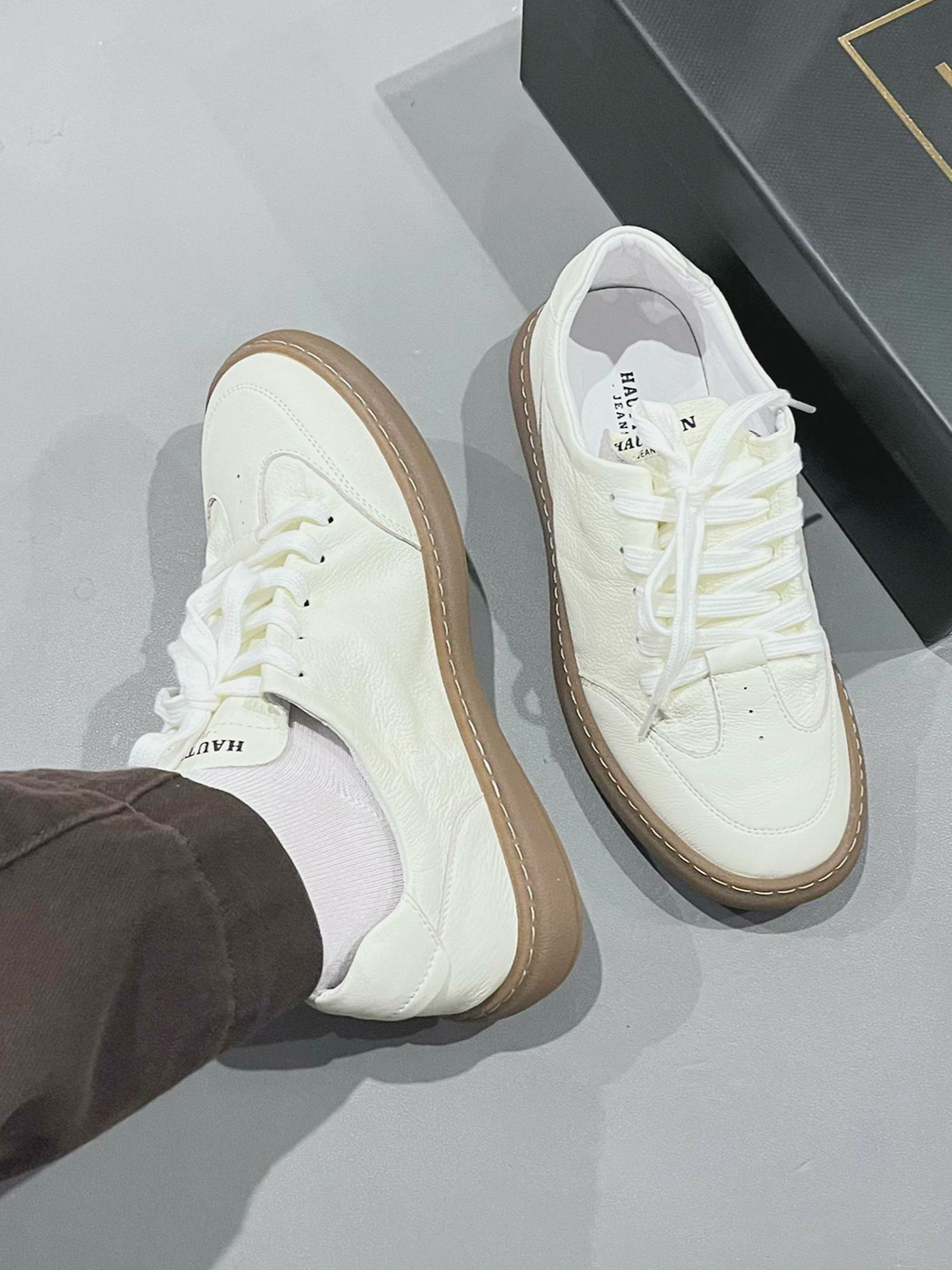 本来只是随便走走,想趁着晚风晃一晃,踩上这双 HAUT.TON 小白鞋就出了门。 踩着细腻的荔枝纹皮面走在老巷🍂,生胶底稳稳贴住青石板,软乎乎的皮质裹着脚,配着深棕休闲裤,一转角就撞见卖手作桂花糕的小店,甜香裹着晚风漫出来。 如果不是穿这双鞋,可能就错过了这份清甜的烟火气📸,就是鞋口偏浅,长时间行走会轻微蹭到脚踝。