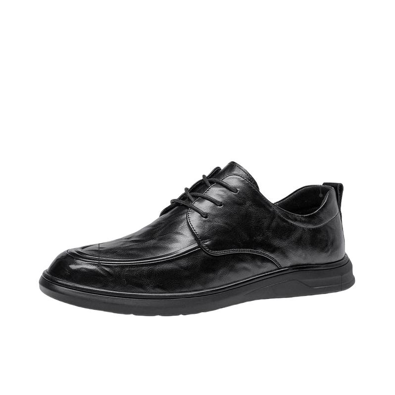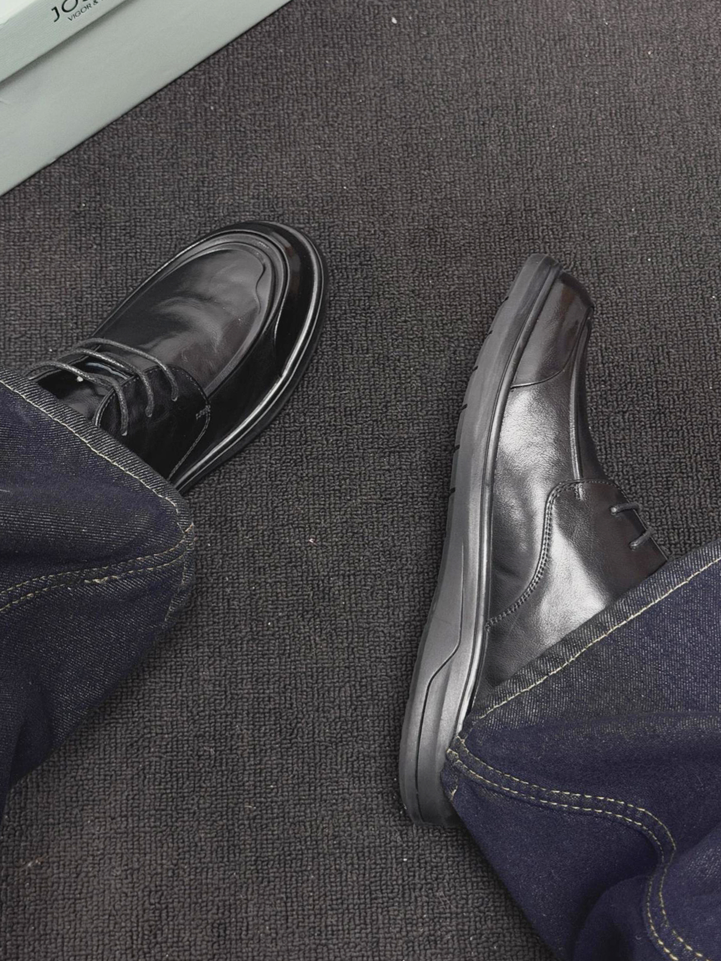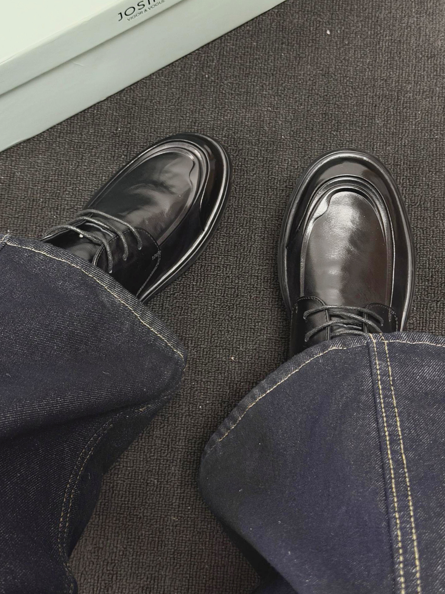 这双鞋最绝的是亮面黑皮线条利落,搭藏青直筒牛仔裤,日常通勤都自带沉稳氛围感。 换身衣服又是另一种感觉,配深灰西裤赴商务会面,搭卡其工装裤逛老巷也随性有层次。