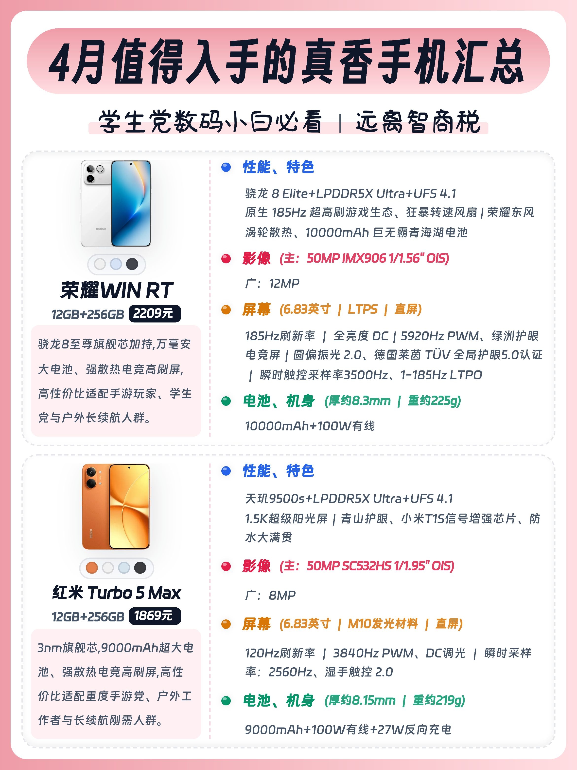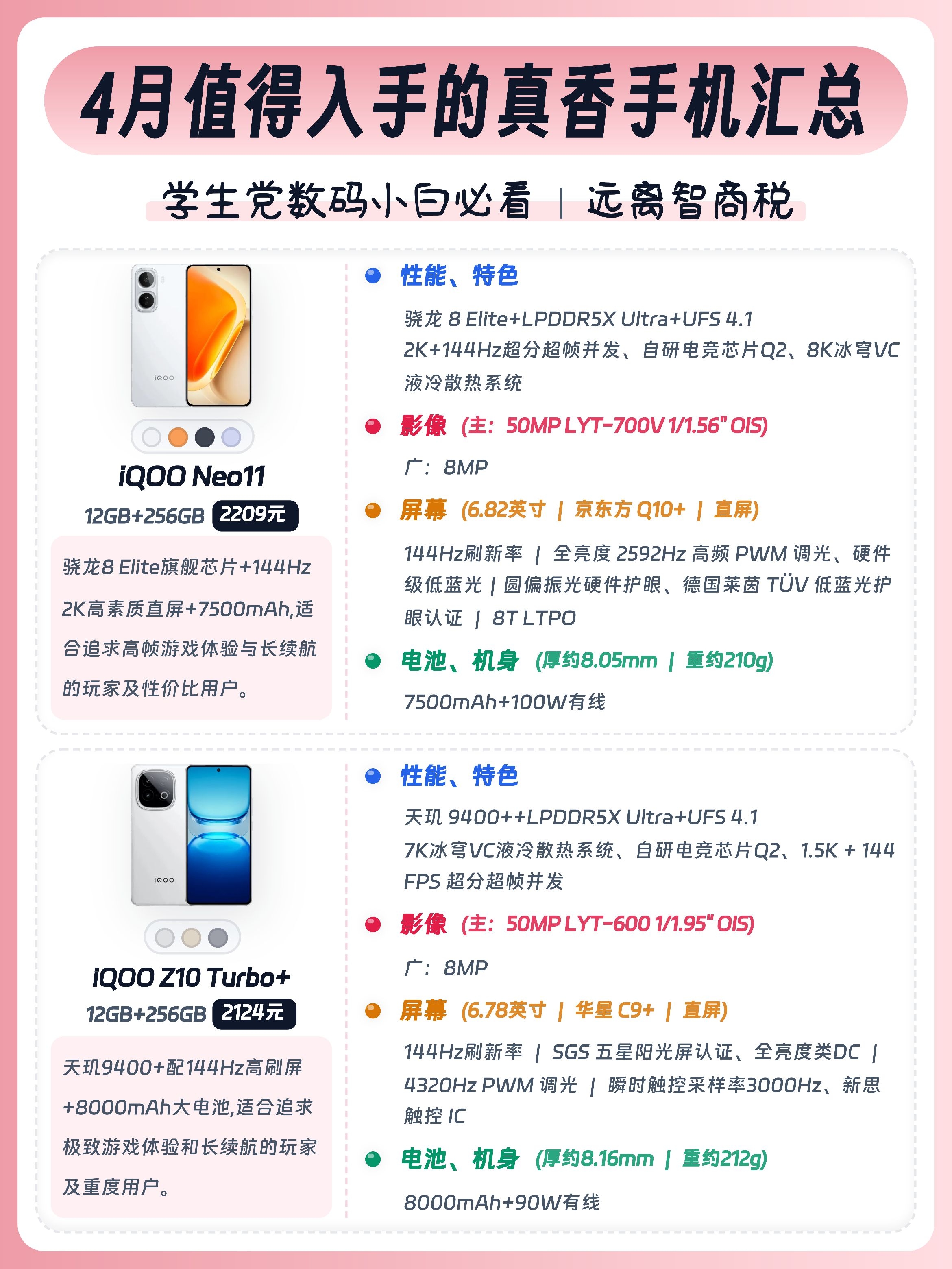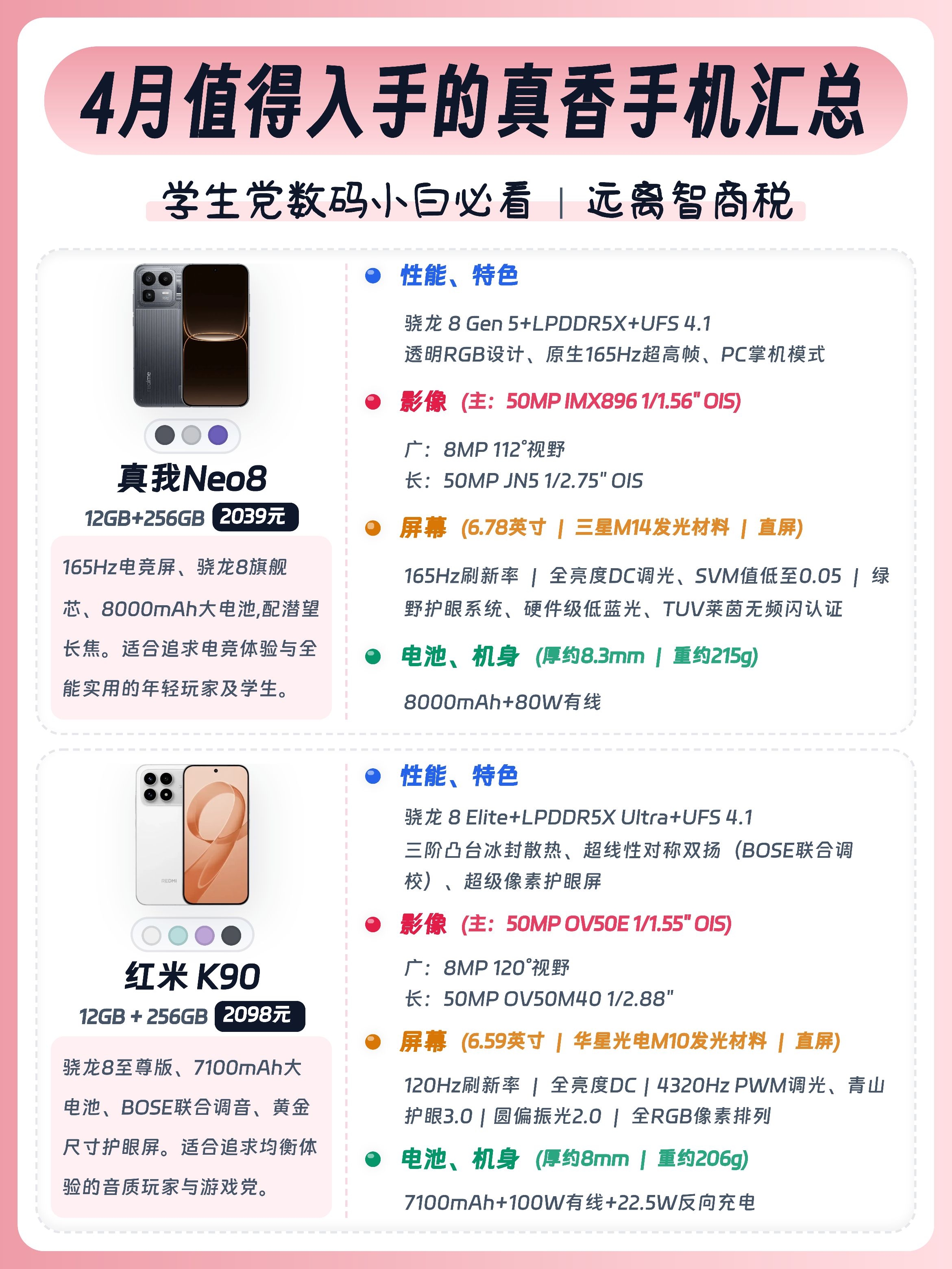 学生党/上班族/数码小白换手机别瞎选!今天给大家整理了16款值得入手的手机,预算1k-4k全覆盖,大家按需求可以放心抄作业🙌 - ✅ 真我Neo8:骁龙8Gen5+潜望长焦,透明RGB潮酷外观,性能影像双在线。 ✅ 红米K90:7100mAh大电池+2K护眼屏。 ✅ 荣耀WIN:骁龙8至尊版+10000mAh电池,配置硬。 ✅ iQOO Neo11:骁龙8至尊版+电竞芯片Q2,144Hz高刷屏...