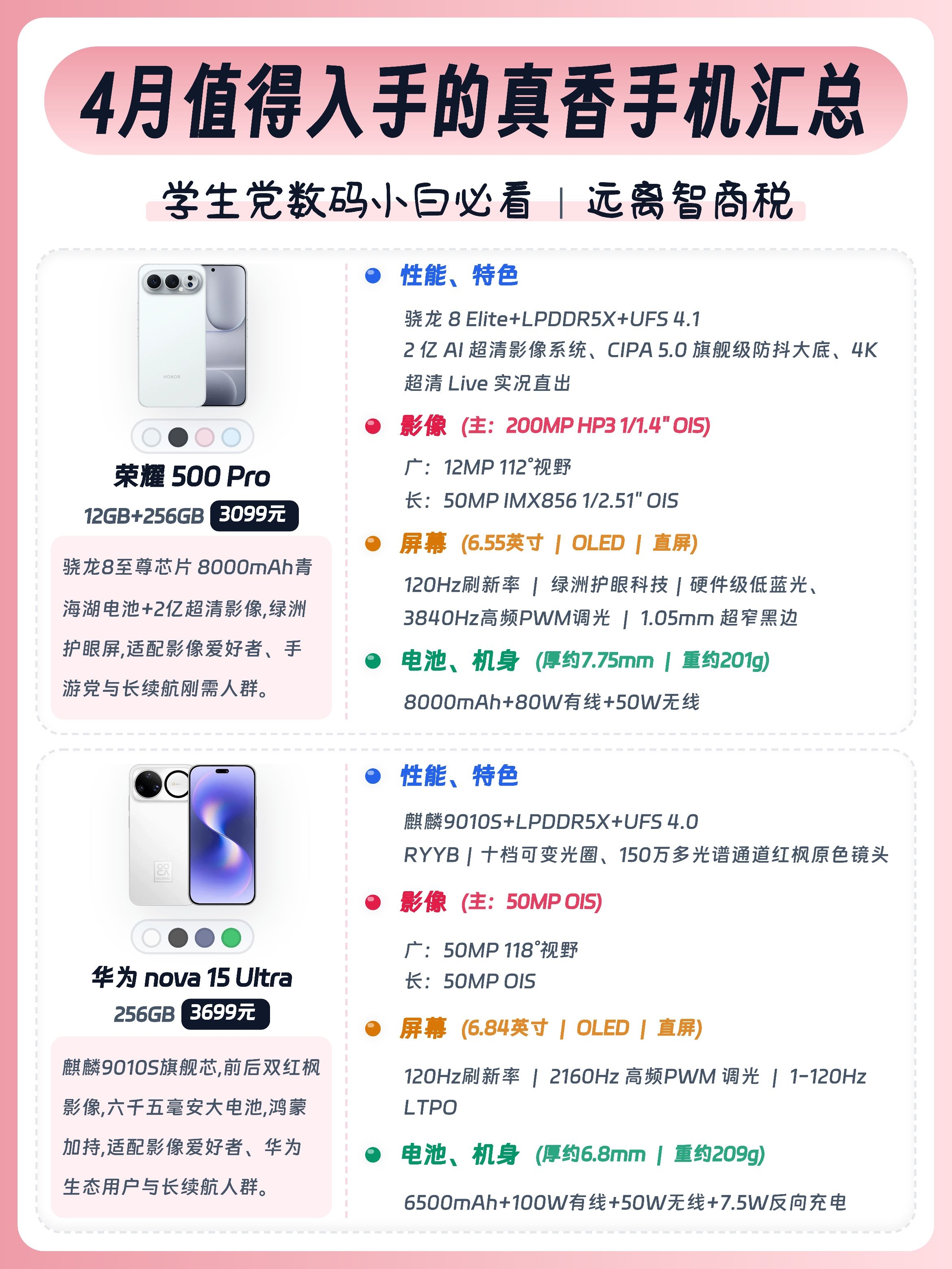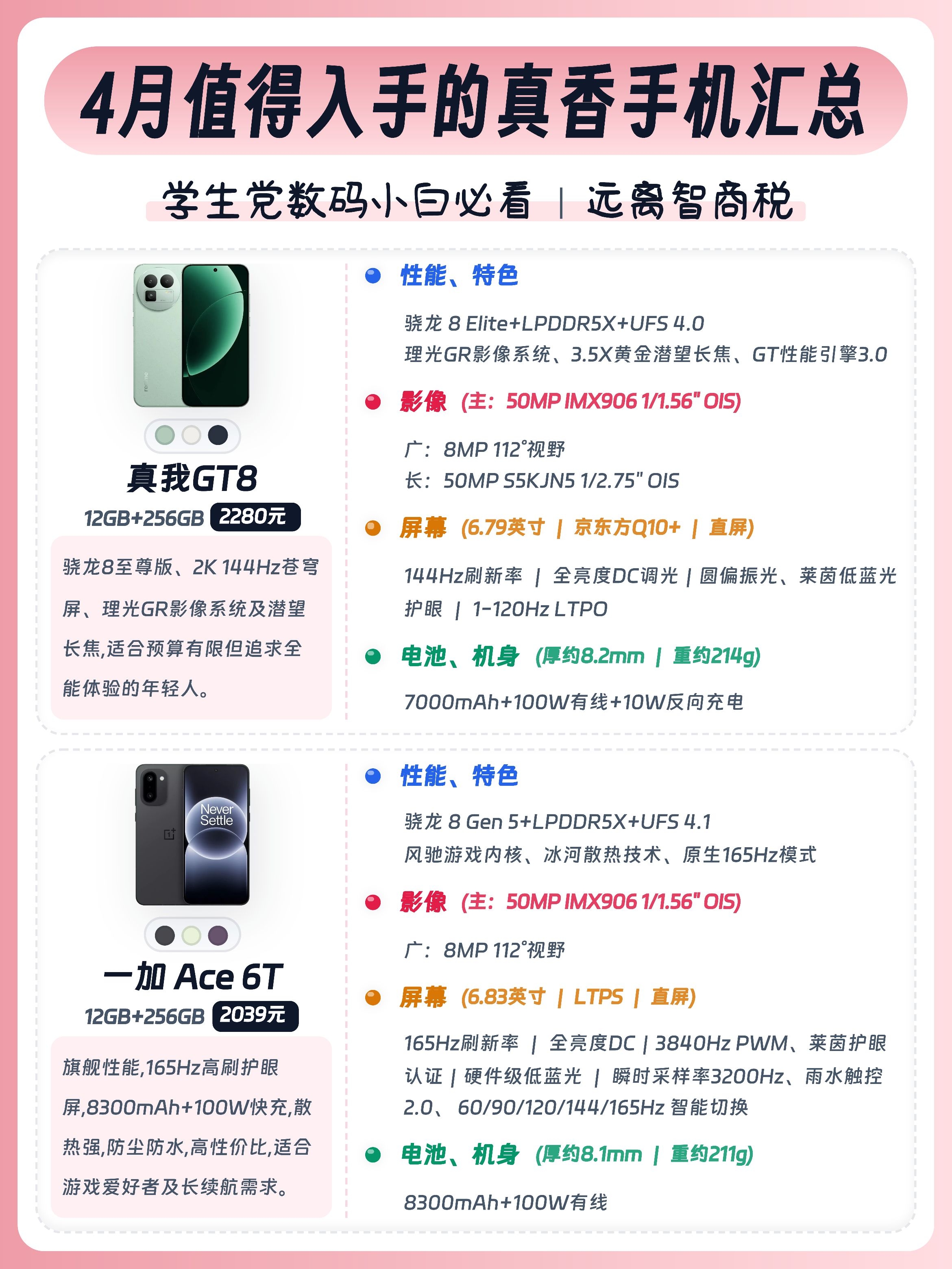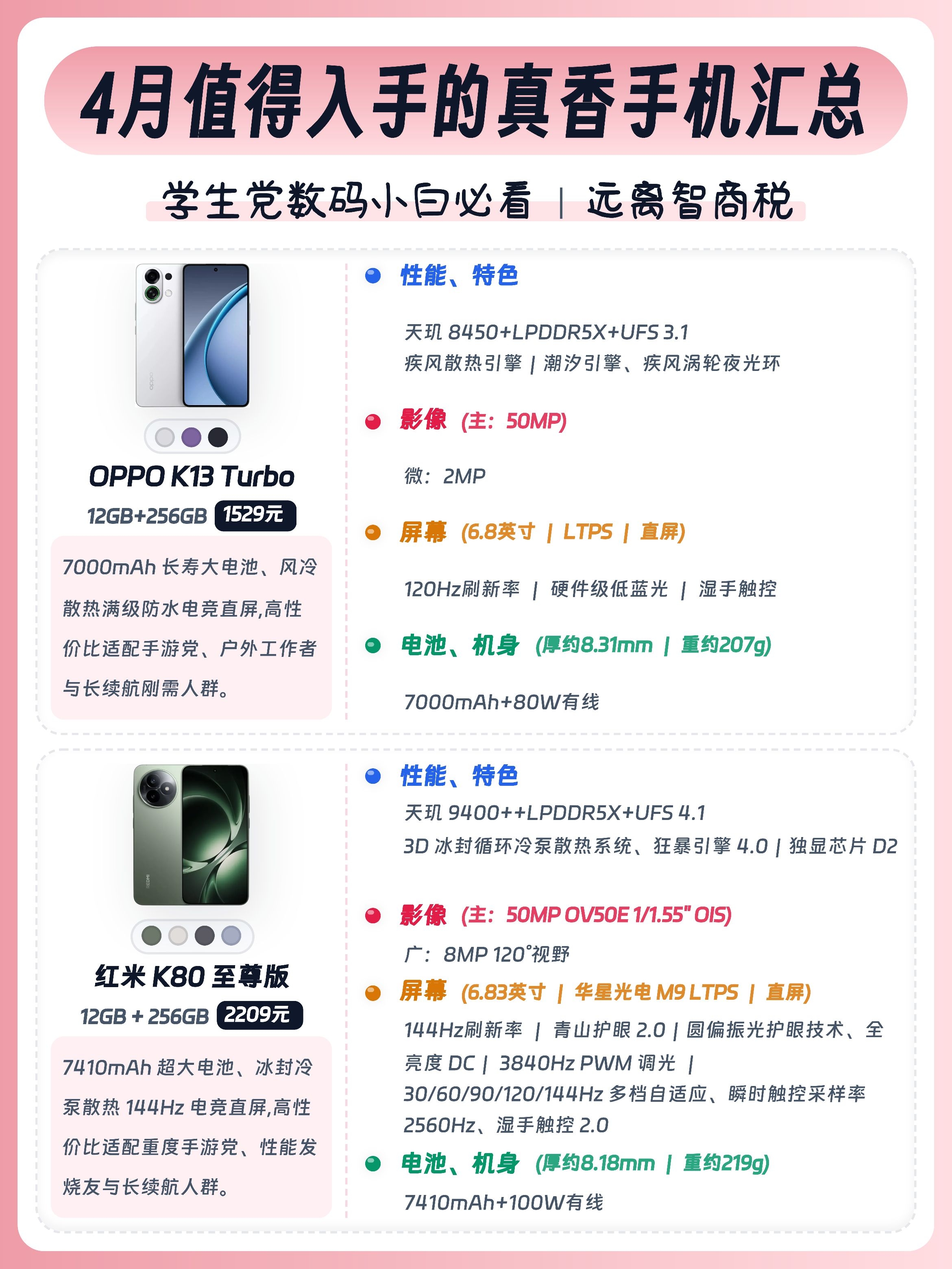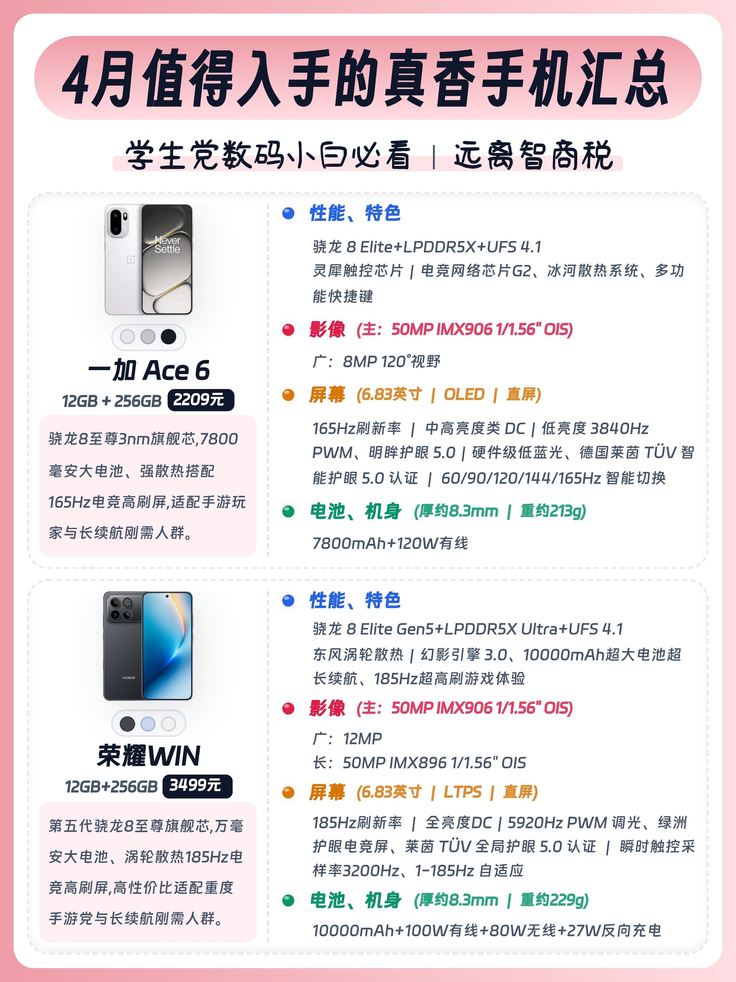 学生党/上班族/数码小白换手机别瞎选!今天给大家整理了16款值得入手的手机,预算1k-4k全覆盖,大家按需求可以放心抄作业🙌 - ✅ 真我Neo8:骁龙8Gen5+潜望长焦,透明RGB潮酷外观,性能影像双在线。 ✅ 红米K90:7100mAh大电池+2K护眼屏。 ✅ 荣耀WIN:骁龙8至尊版+10000mAh电池,配置硬。 ✅ iQOO Neo11:骁龙8至尊版+电竞芯片Q2,144Hz高刷屏...