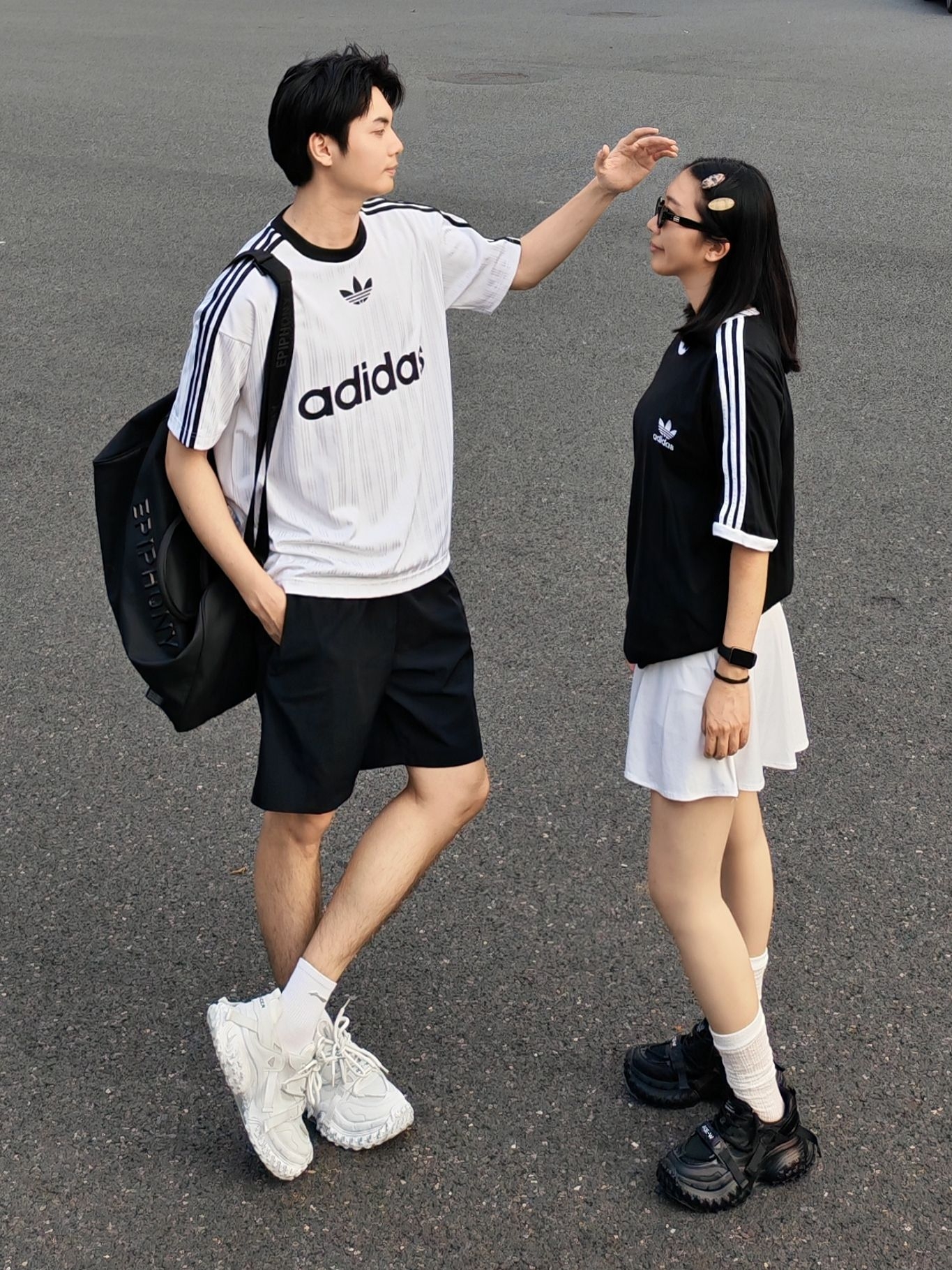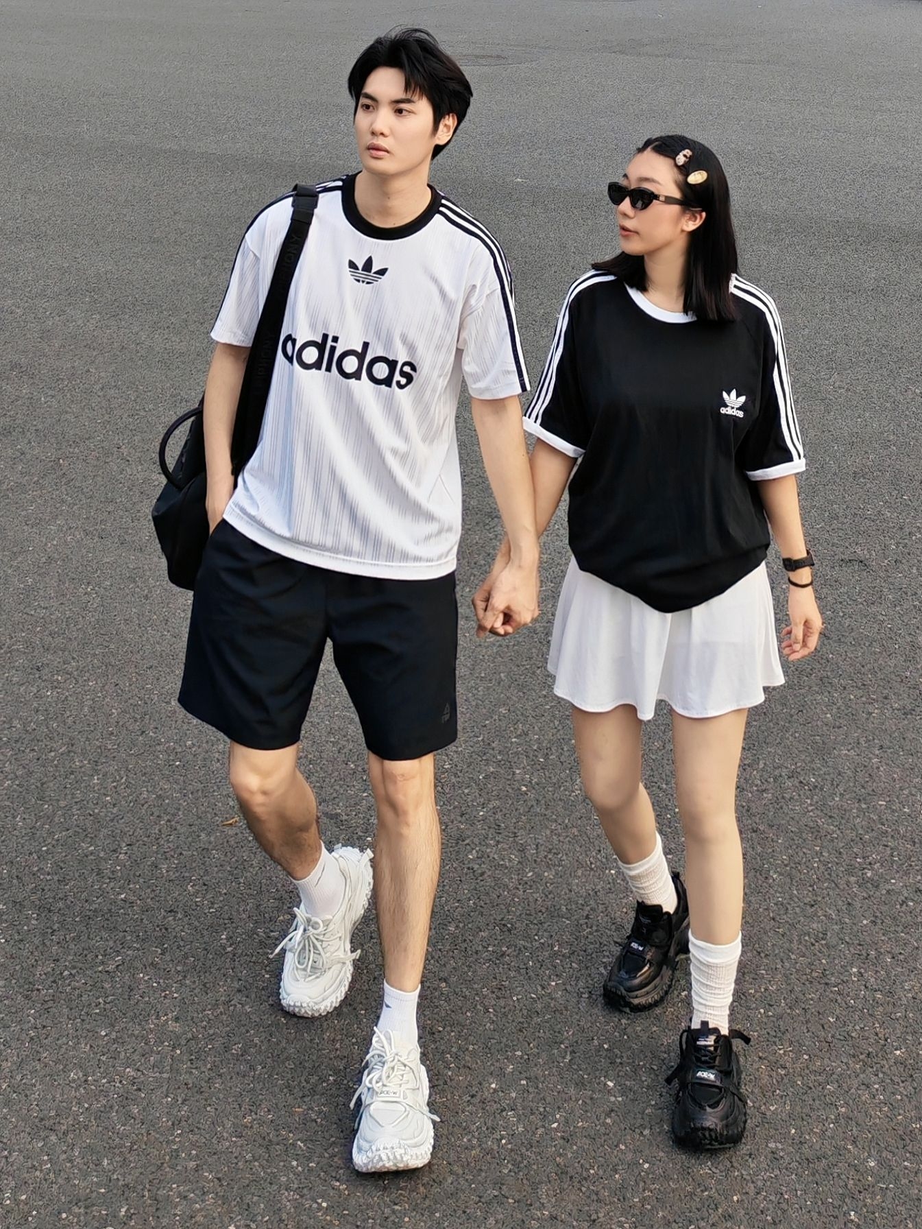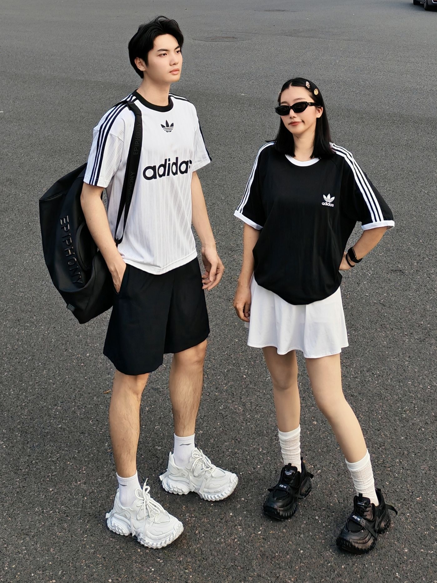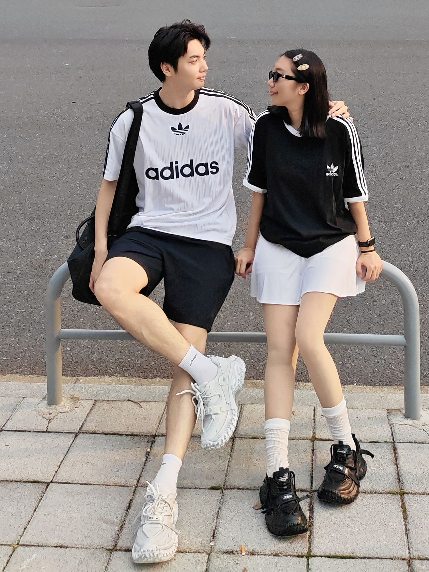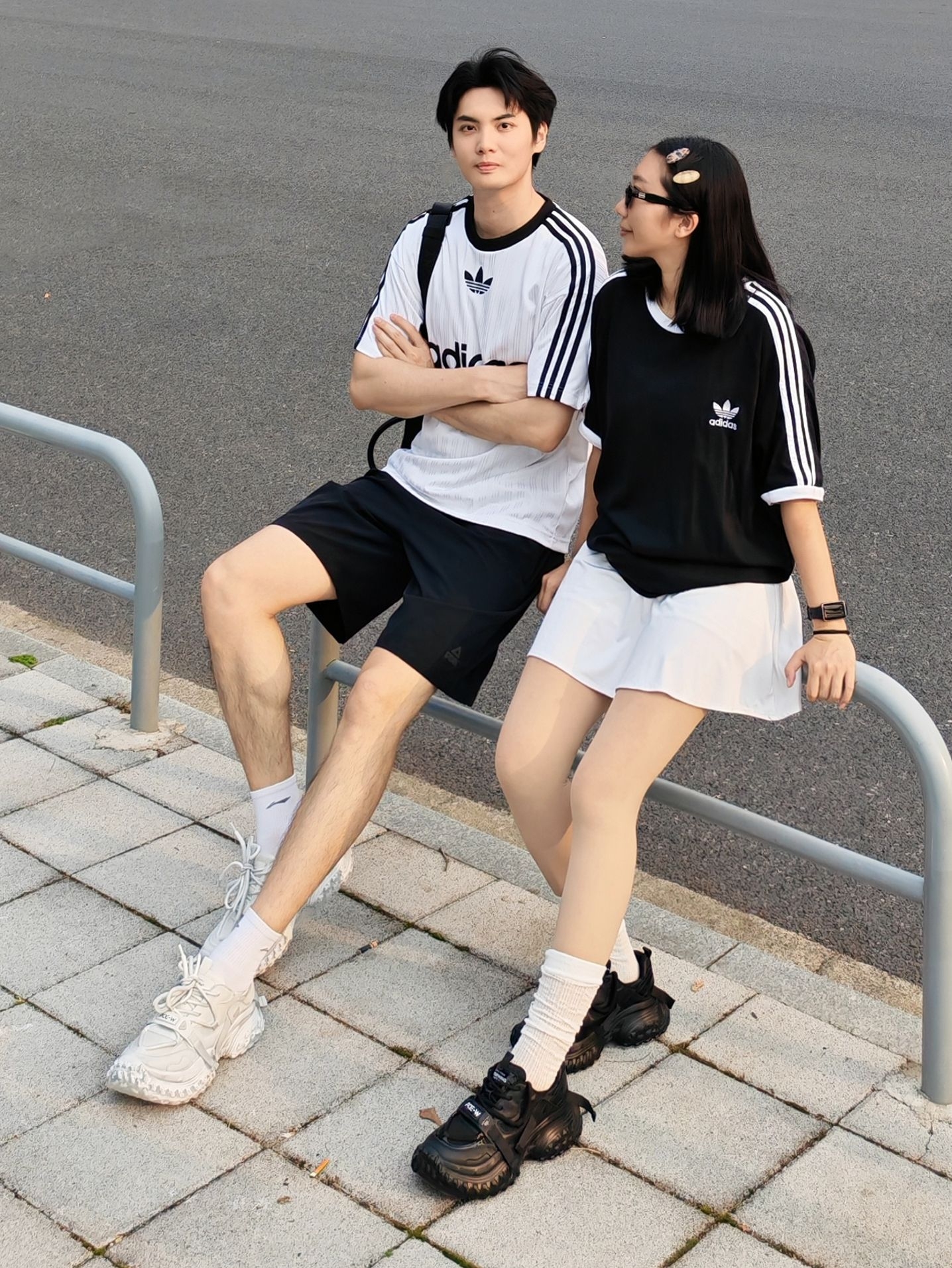 黑白经典配色永远不出错,运动休闲感直接拉满,日常出街、约会都超合适! 男生白阿迪条纹T+黑短裤,少年感拉满;女生黑阿迪T配白短裙,甜酷平衡。 鞋子一黑一白厚底老爹鞋,锯齿大底+利落鞋带设计,中筒白袜增加细节感,再用墨镜、发夹点缀,随性又出片。 日常约会、出街都舒服自在,运动感氛围直接拉满~