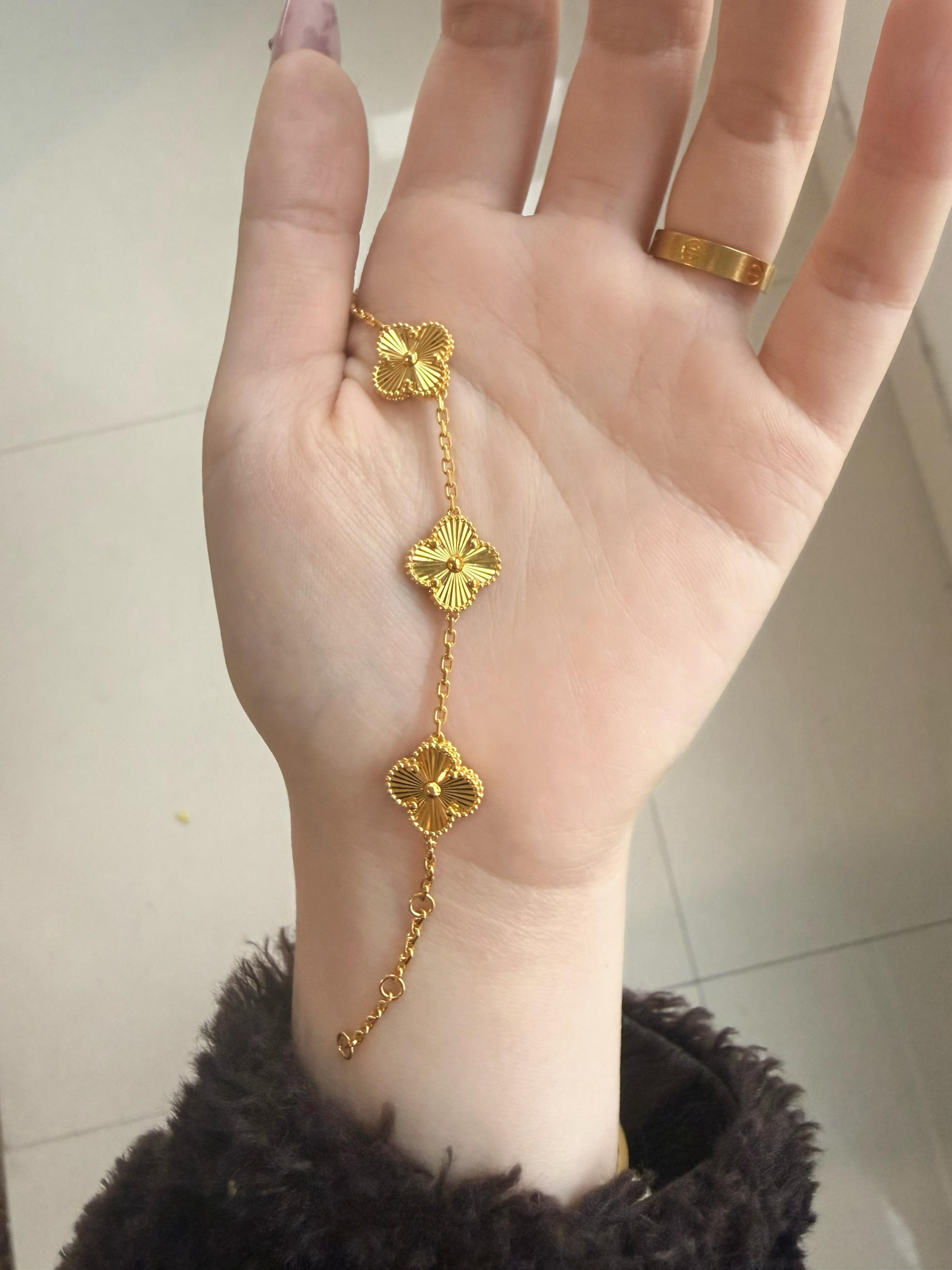 谁懂啊家人们 这四叶草黄金手链真的美到心巴 足金质感超绝 巨显白显细 链长可调节 日常戴完全不硌手 也可以叠戴 精致感满满 通勤约会都能戴 戴上直接幸福感拉满 富贵感拿捏 你们黄金首饰都怎么搭?