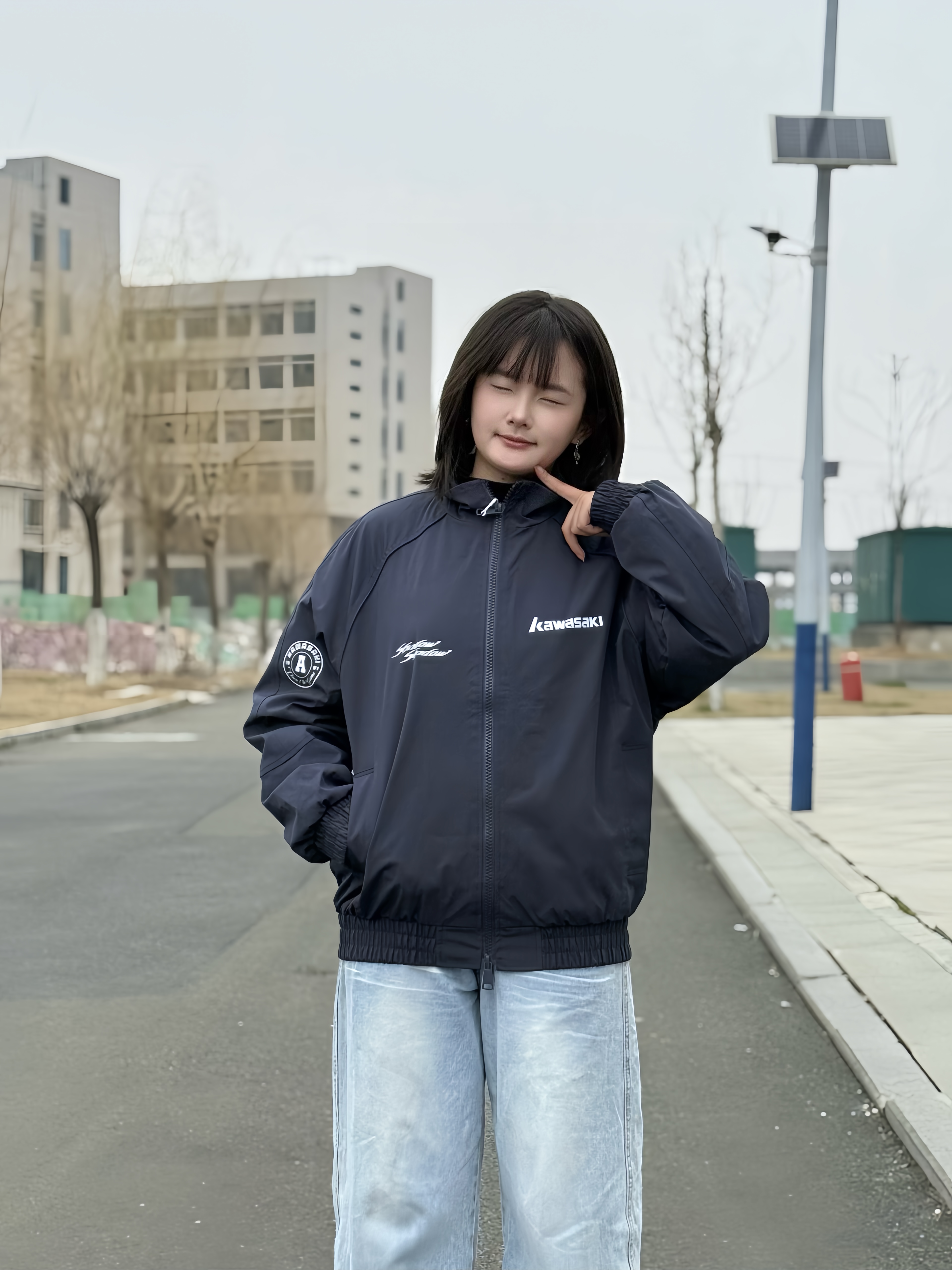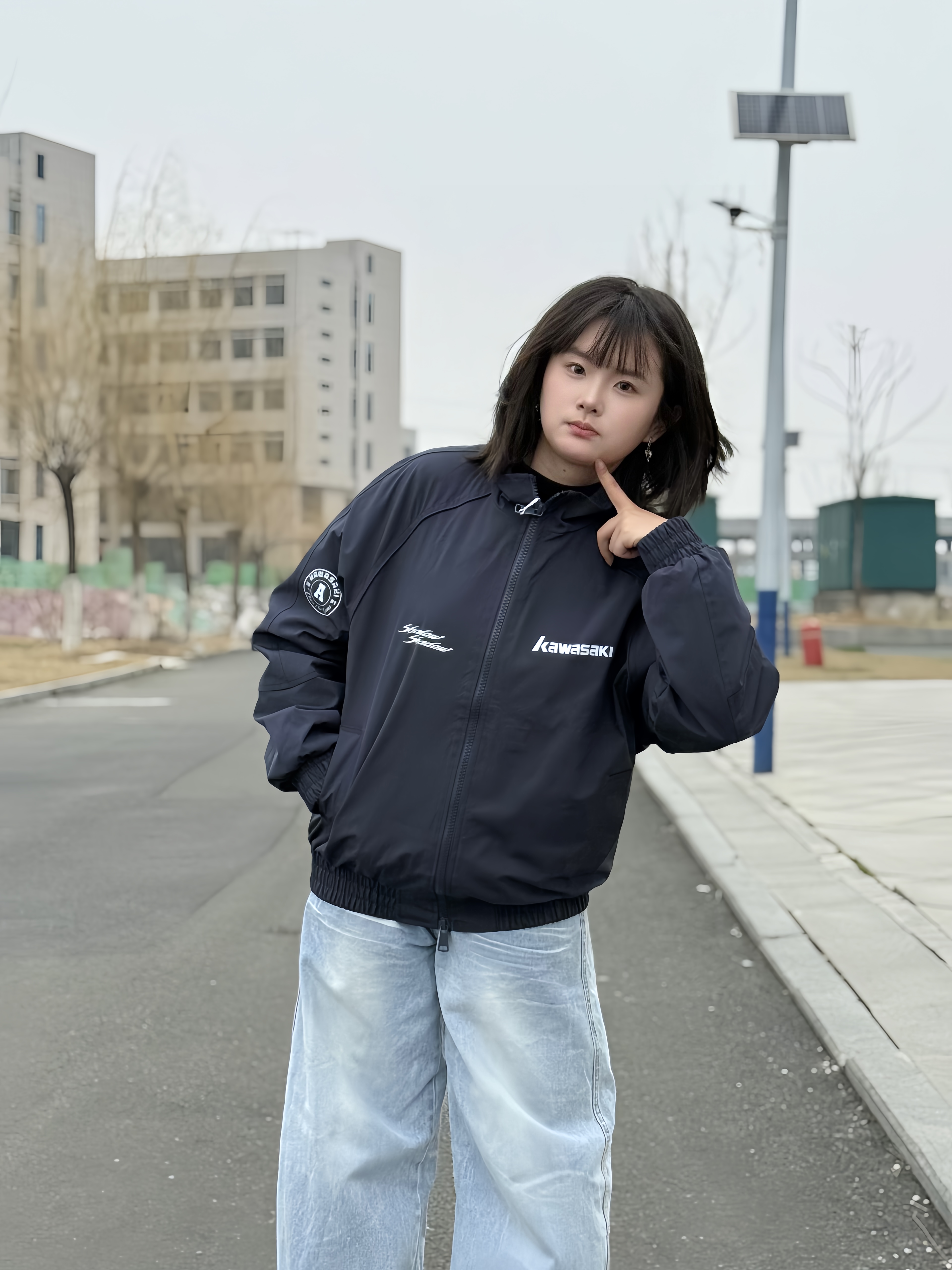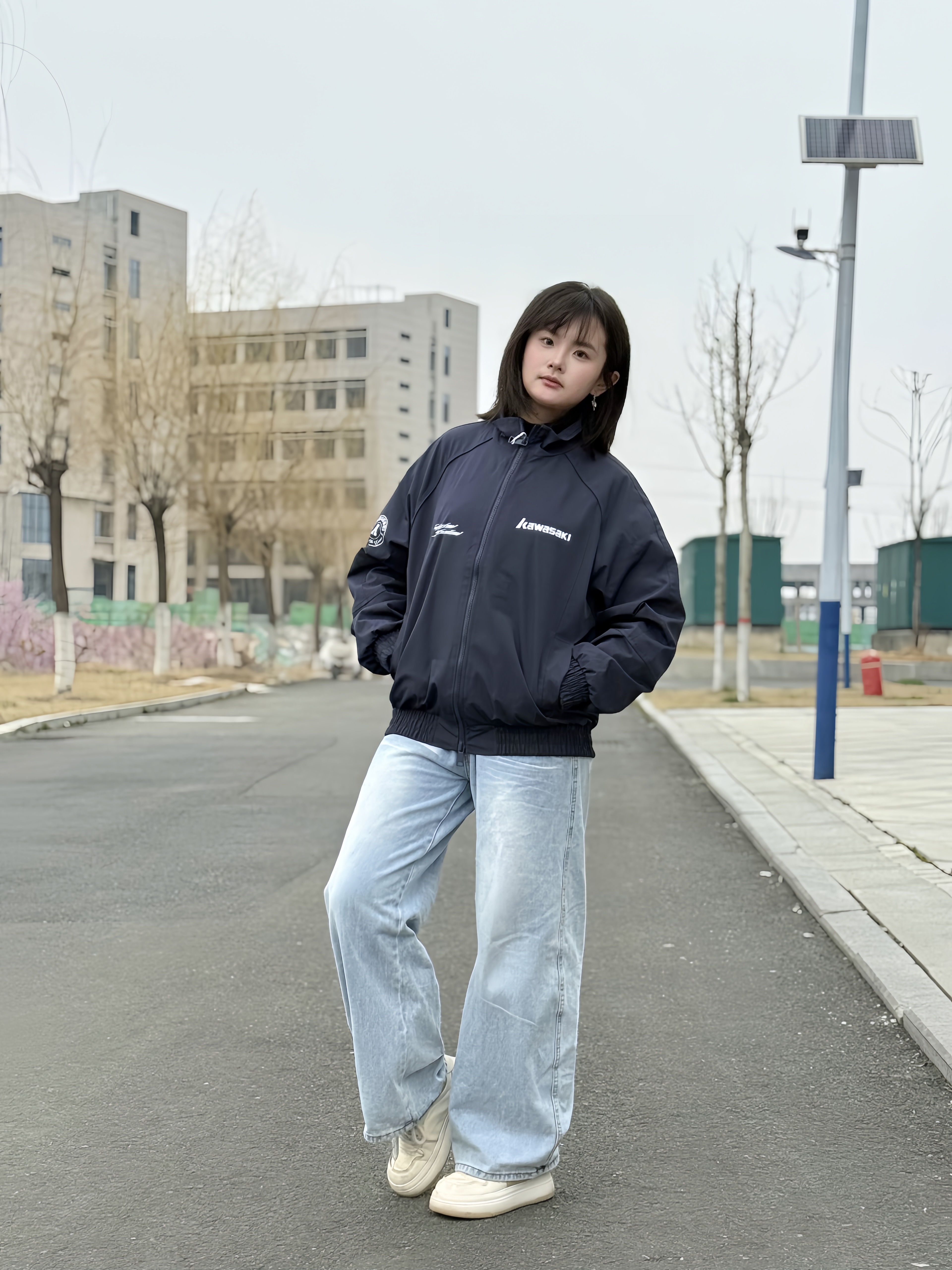 藏青外套搭配浅蓝牛仔裤,风格休闲随性。宽松版型穿着舒适,不挑身材,适合日常出街和校园通勤。整体简约耐看,是一款好搭又实用的基础款。