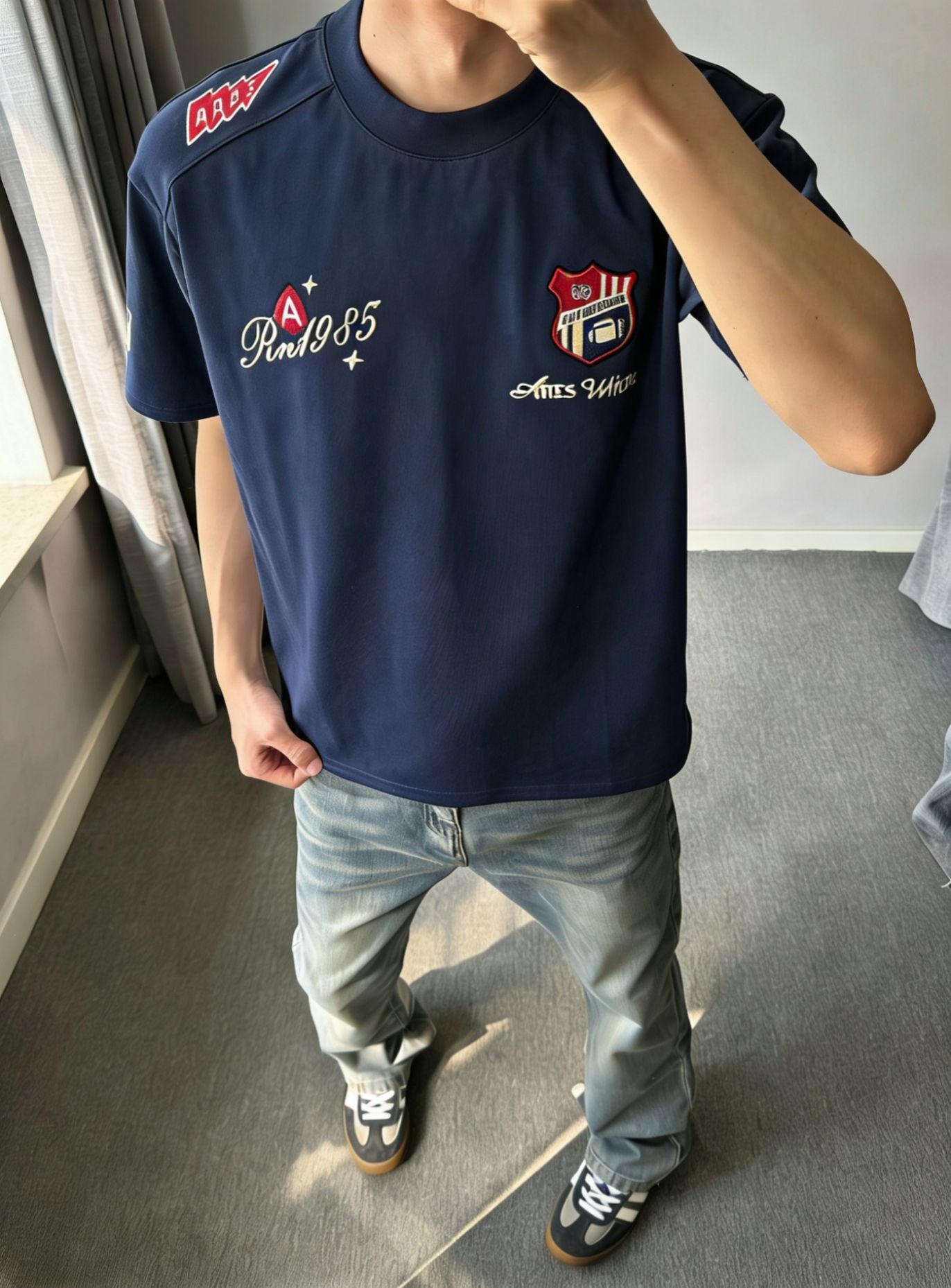 藏青刺绣短袖搭配浅灰微喇牛仔裤,脚踩经典德训鞋,美式复古高街风,利落干净,随性又显利落身形。