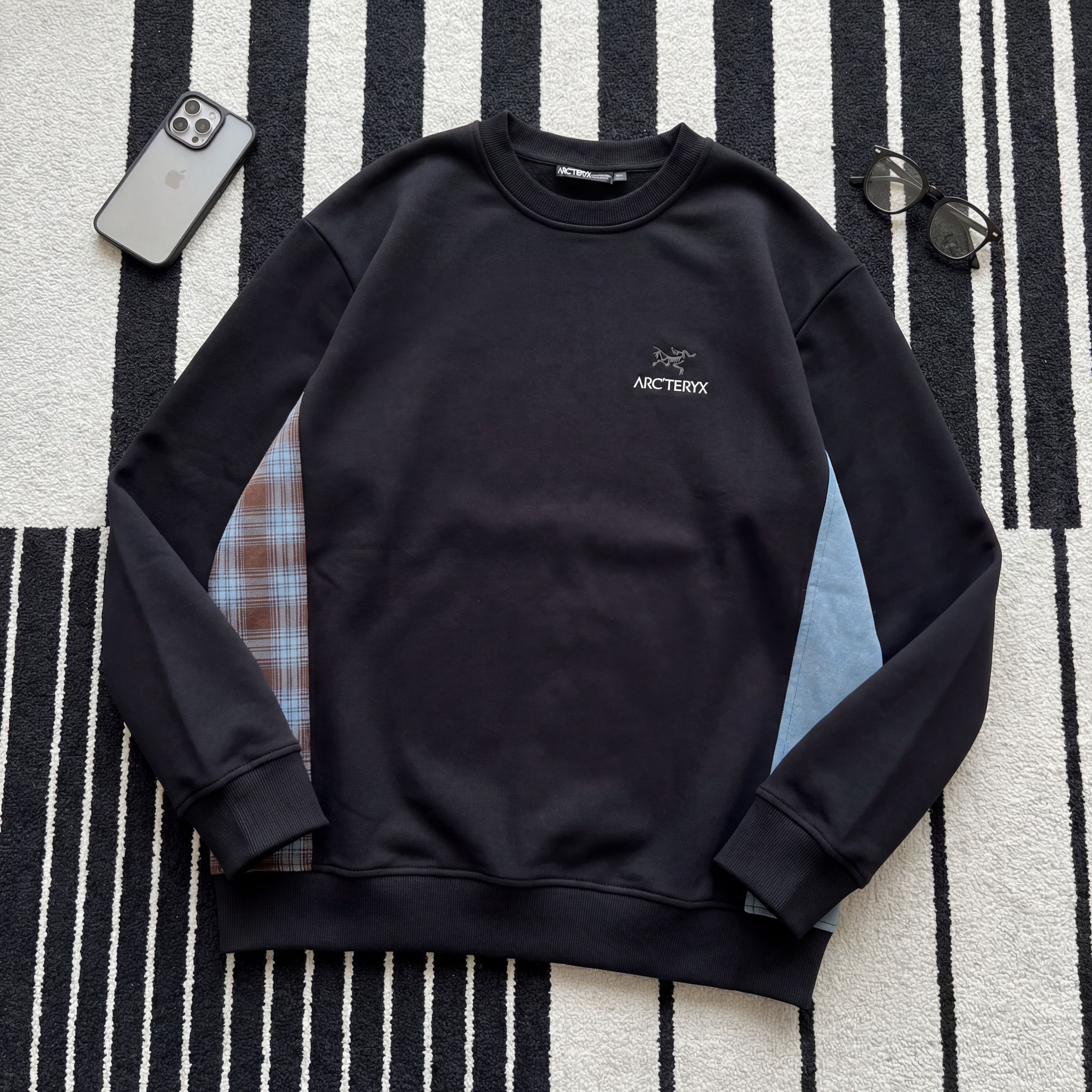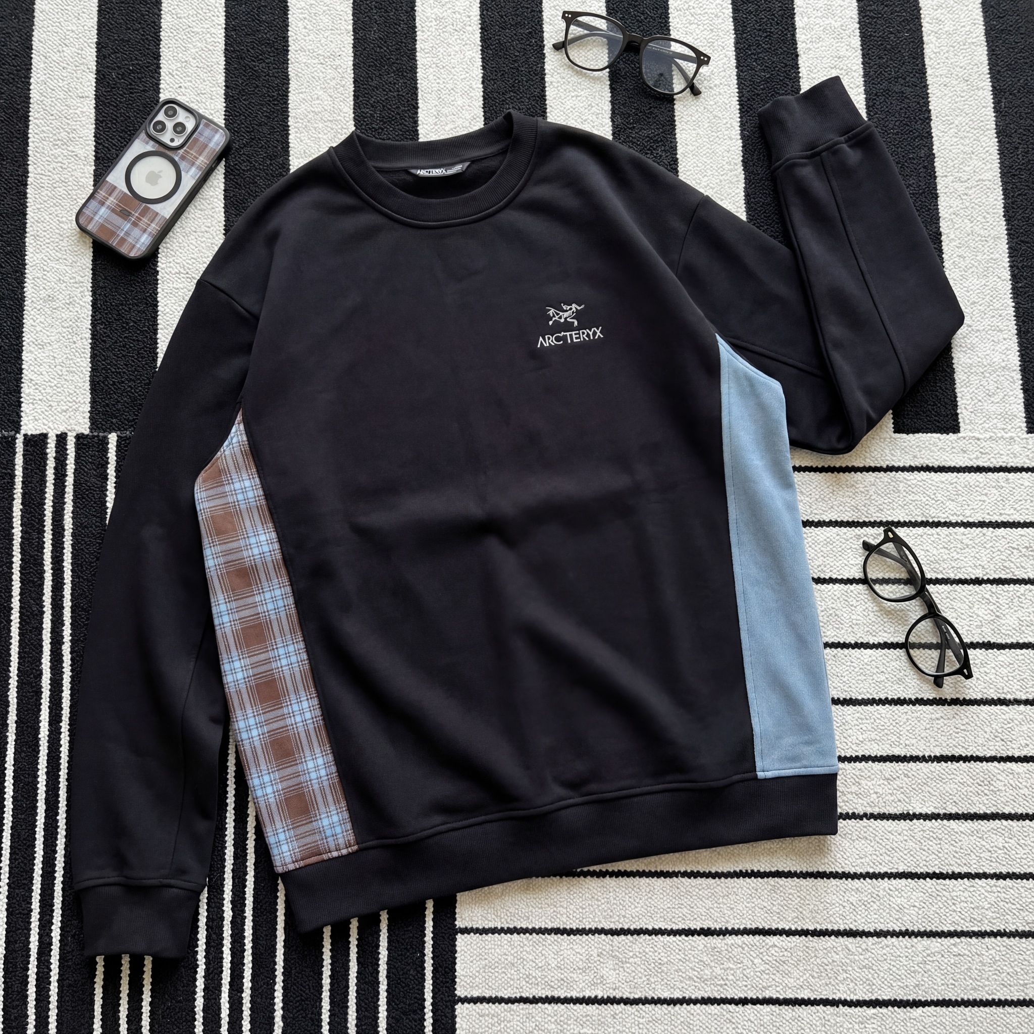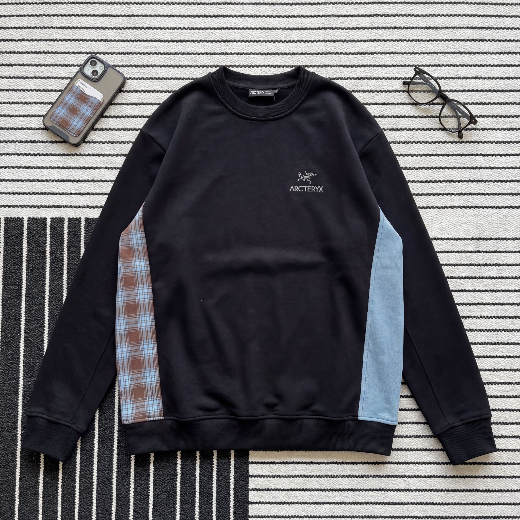 最近沉迷这件不对称拼接卫衣,黑色抓绒面料偏挺括,不是软塌塌的那种,上身很有轮廓感,春秋单穿、叠穿外套都很顶。 左右两边的拼接设计太戳我了:一边是蓝棕格纹,带着复古美式那味儿;一边是浅蓝麂皮感面料,摸起来有颗粒感,两种材质撞在黑色衣身上,视觉冲击力拉满,又不会太杂乱。 胸口小logo低调不抢戏,配工装裤、阔腿裤都很炸,走路带风的街头感直接拉满,日常出街、逛展都合适,属于越看越上头的个性款。