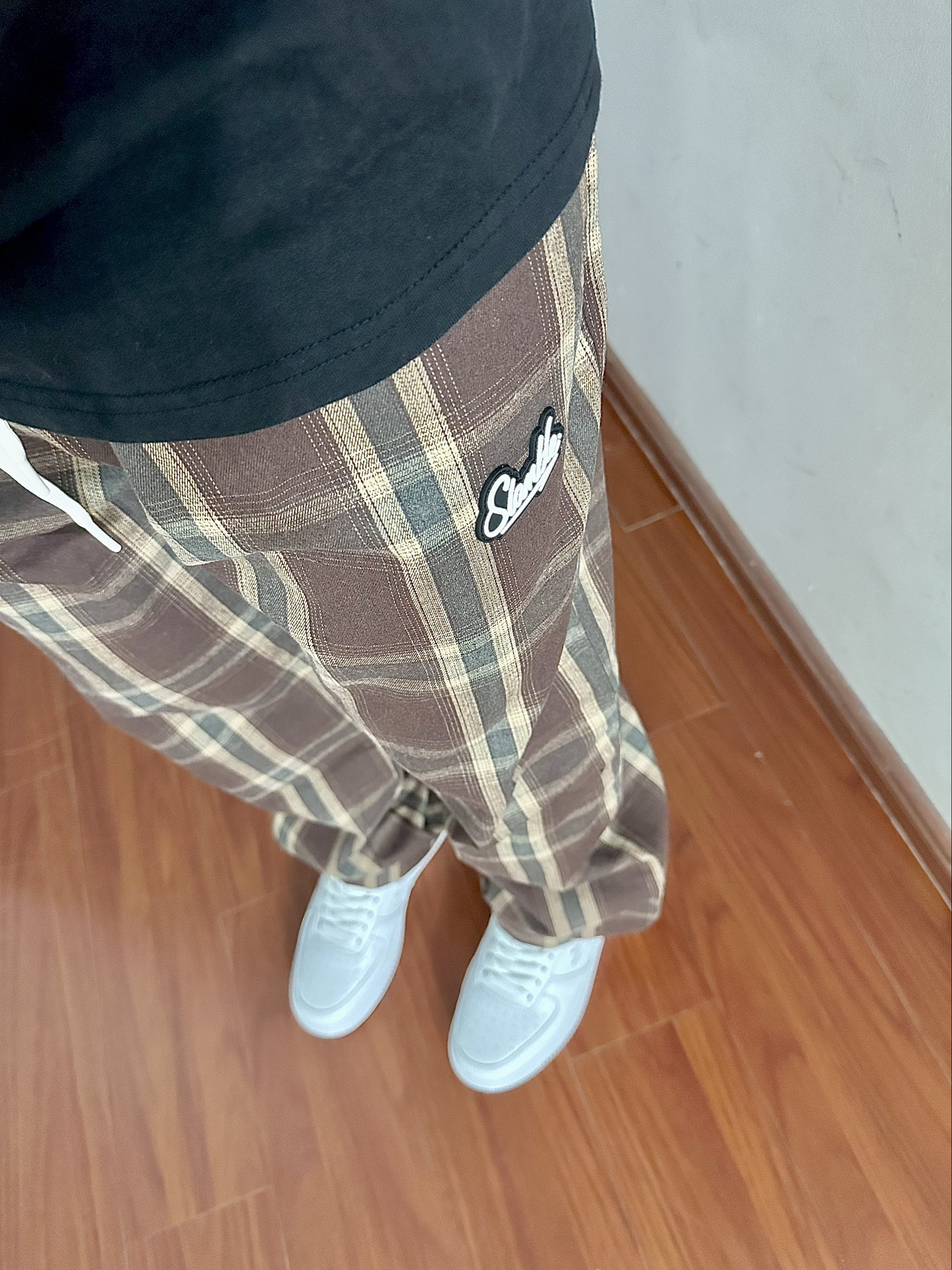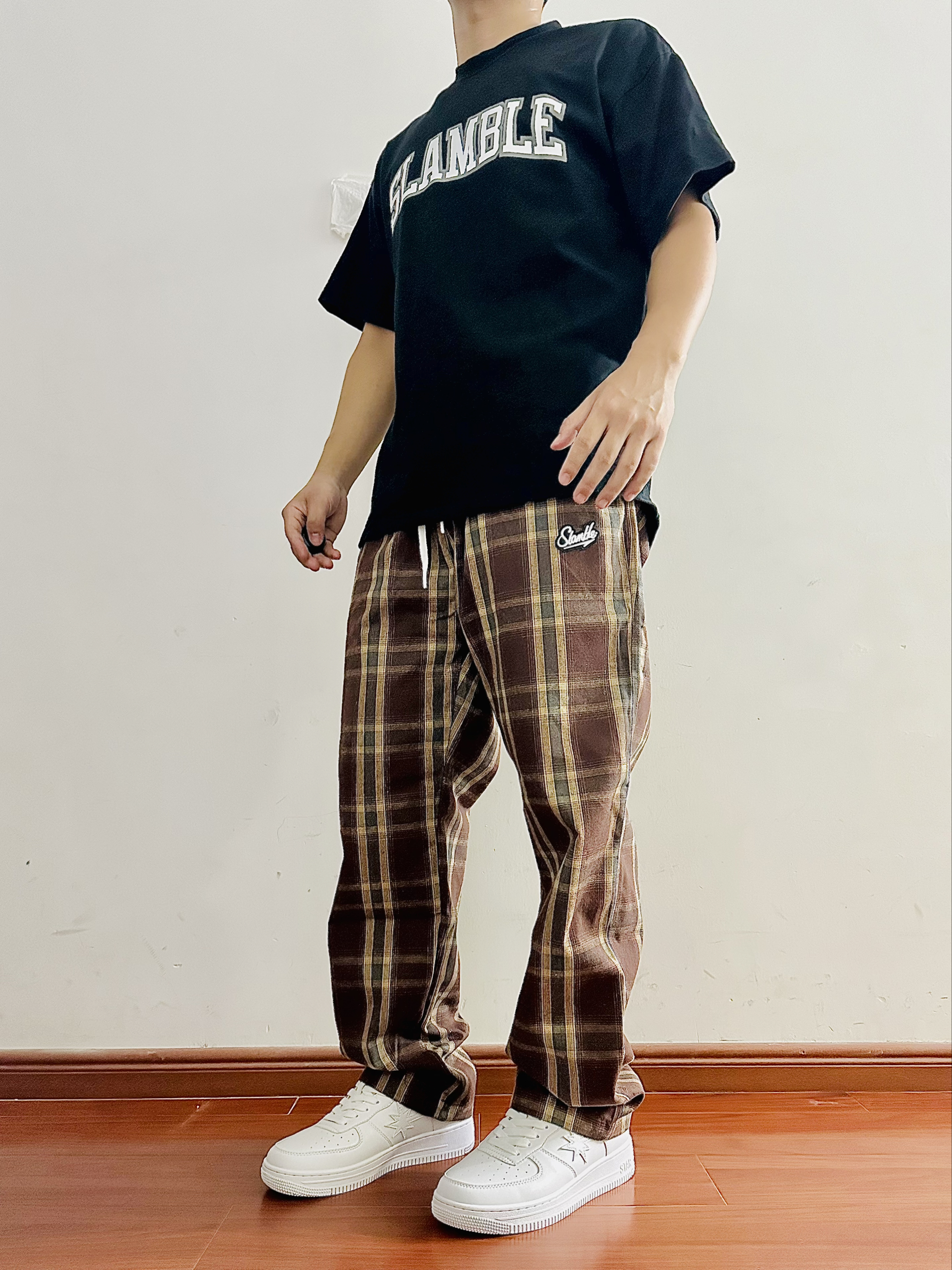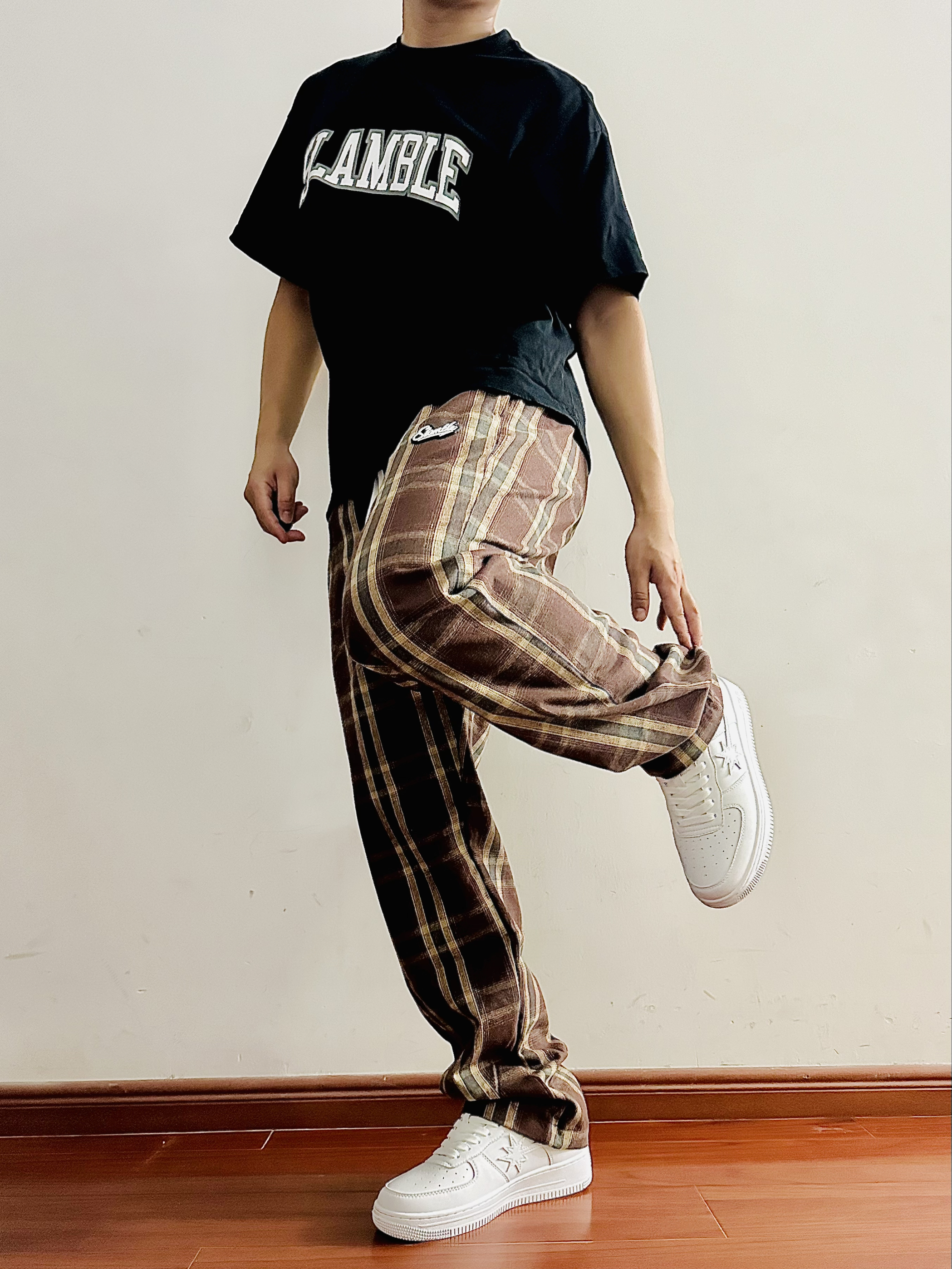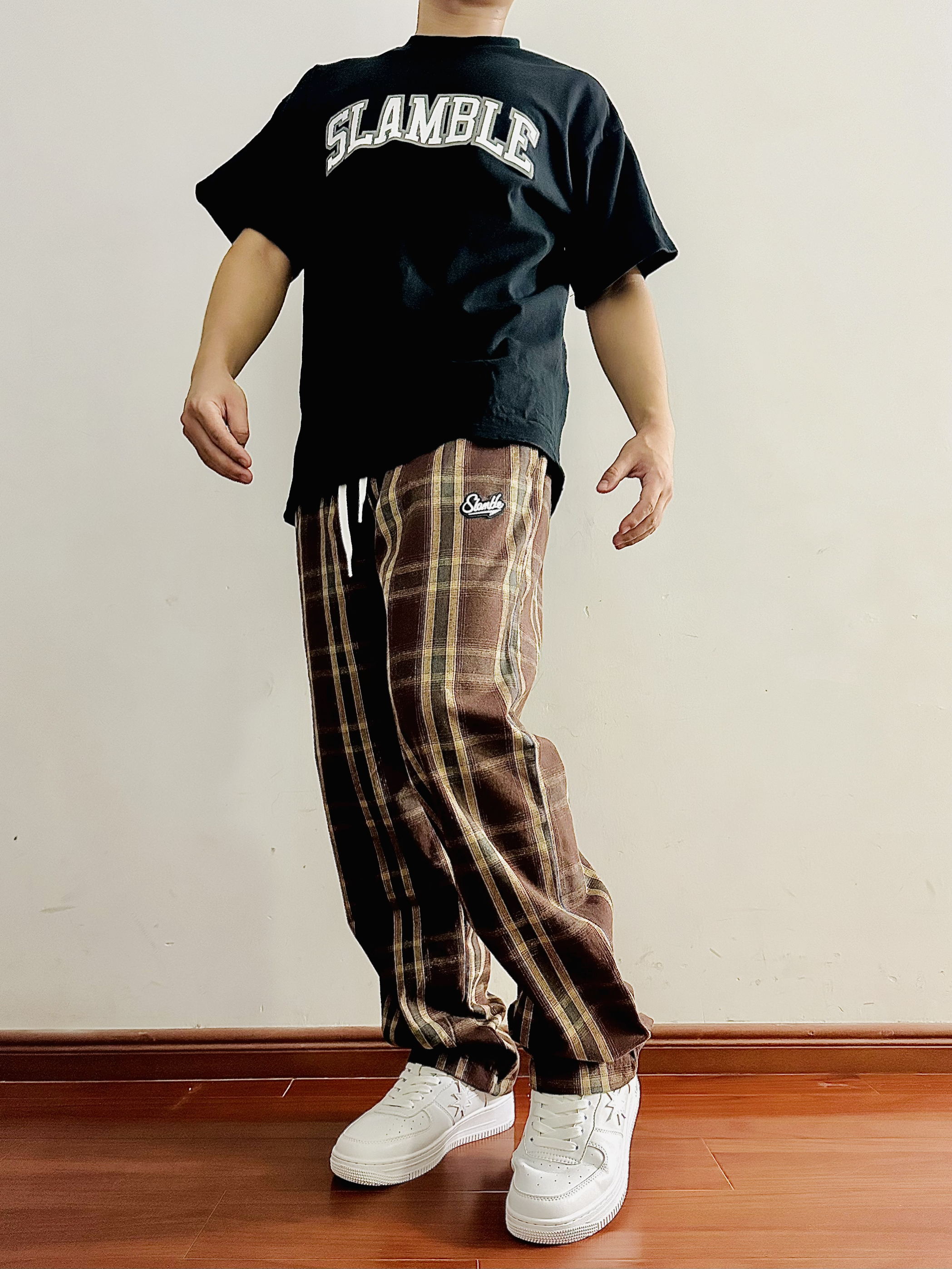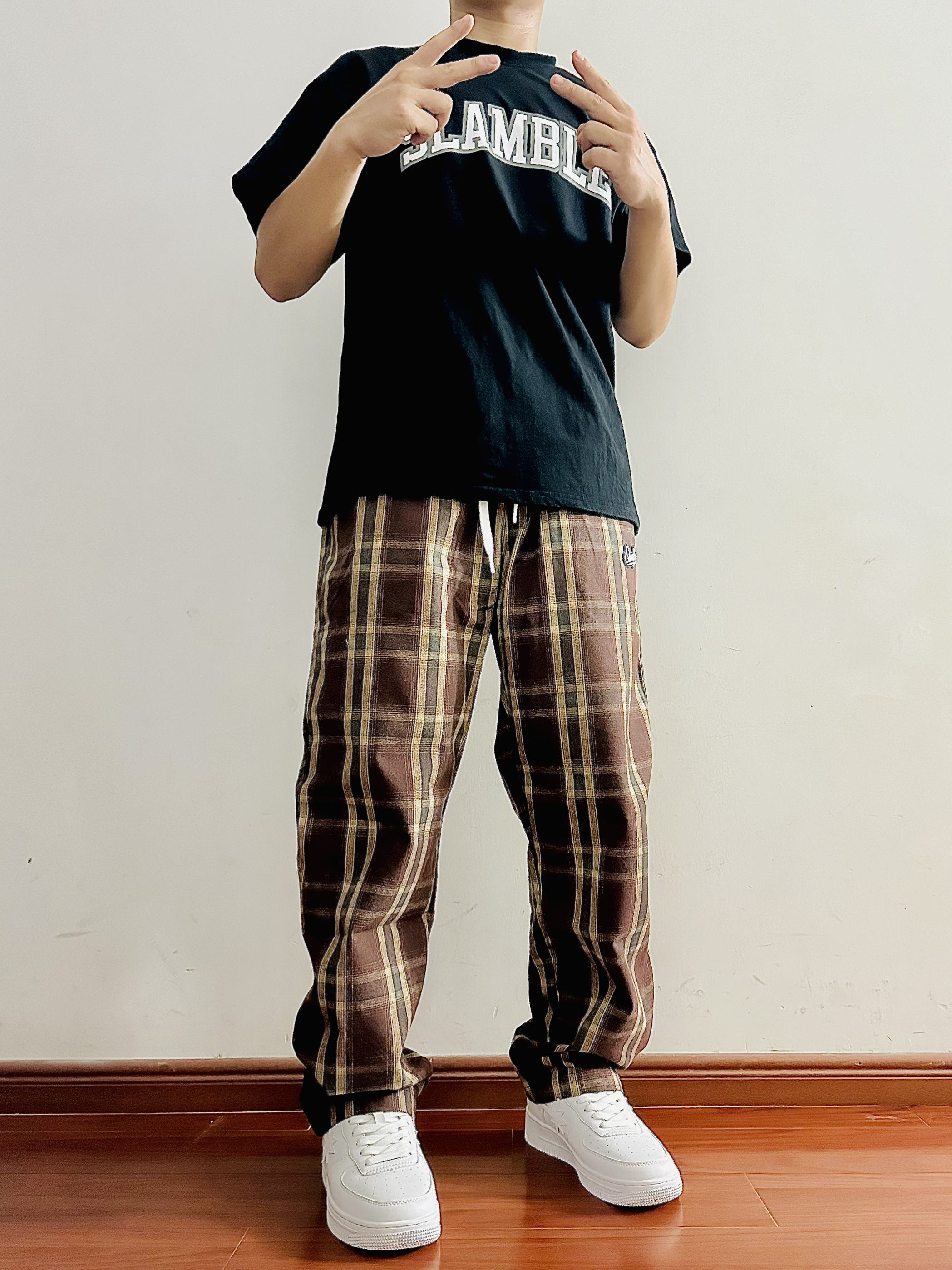 今日穿搭分享 黑色印花短袖➕棕色格子长裤➕白色板鞋 👖: slamble 裤子宽松直筒的版型 上身效果不错很舒服 面料材质比较重磅 硬挺有型不松垮😙 颜色是偏浅棕色 有点美式复古风格 日常还是打球穿 都很不错💯 尺码推荐:170 65㎏ 选择尺码:M码