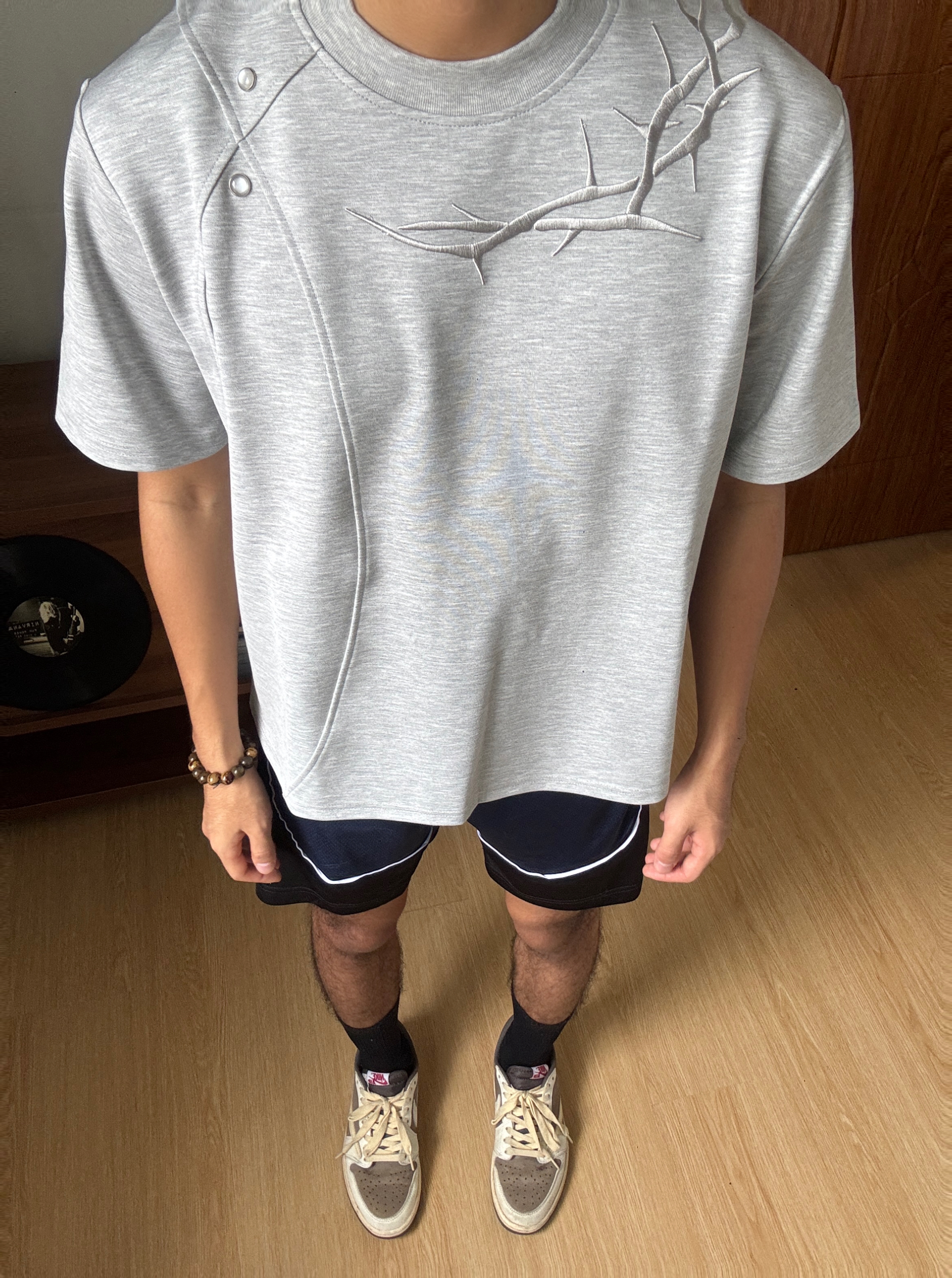 浅灰肌理感T恤带着利落的线条与闪电压纹,低调又有设计感。拼色运动短裤+黑袜旧球鞋,把复古街头感拉满,随性又耐穿。 不用刻意凹造型,也能在松弛里藏着少年气,是听着黑胶、逛着老街都适配的舒服穿搭,慵懒又自在。
