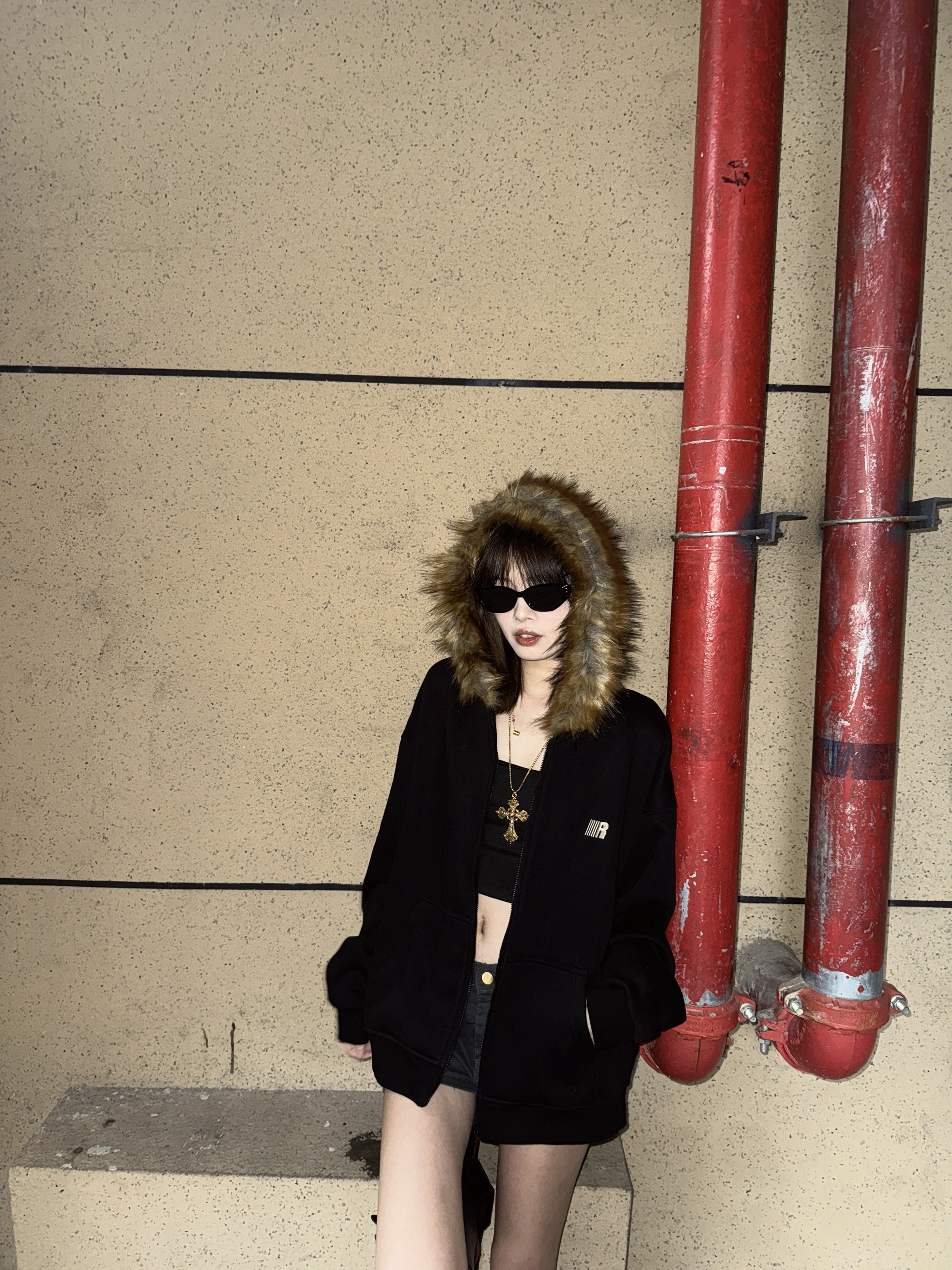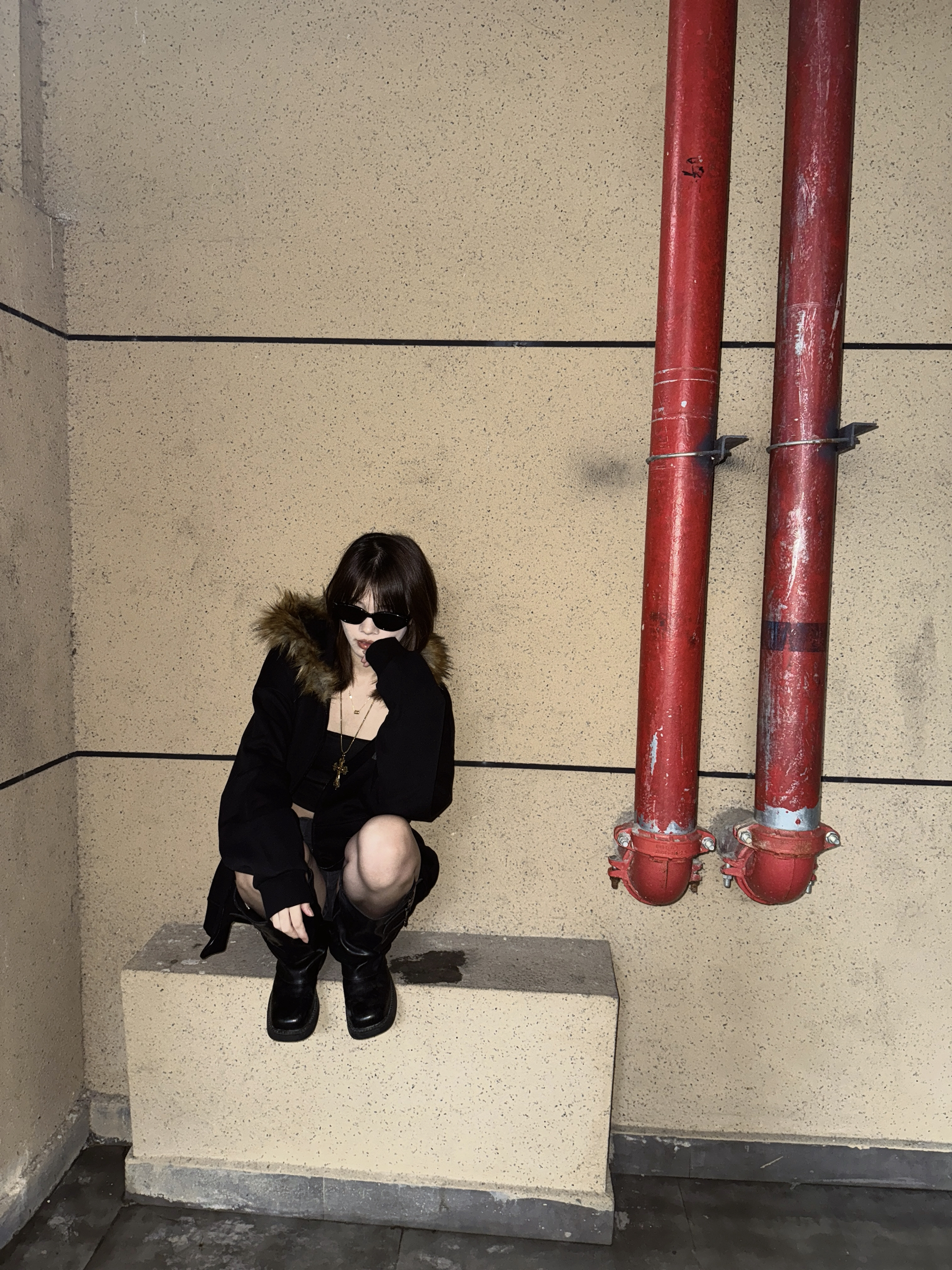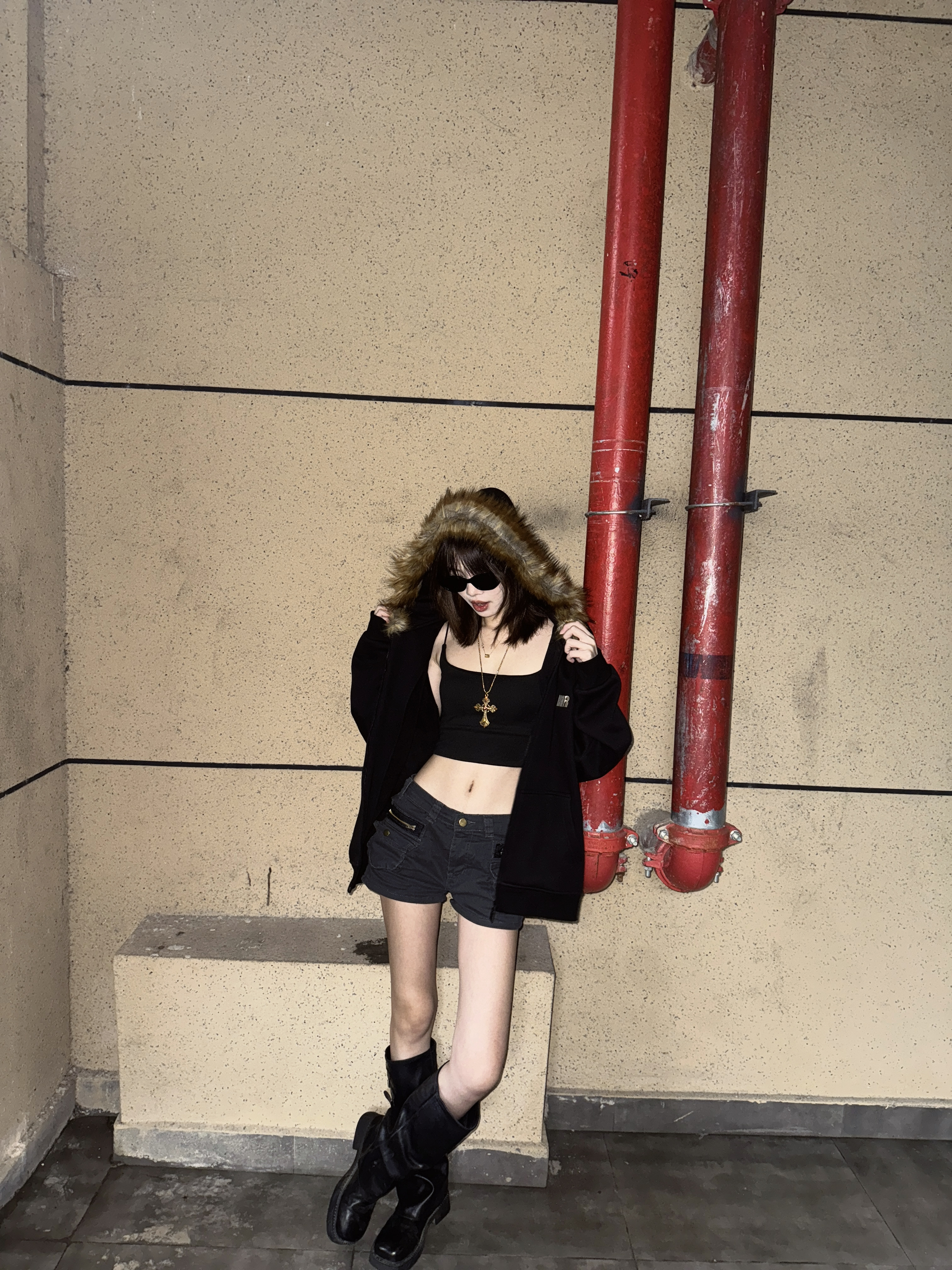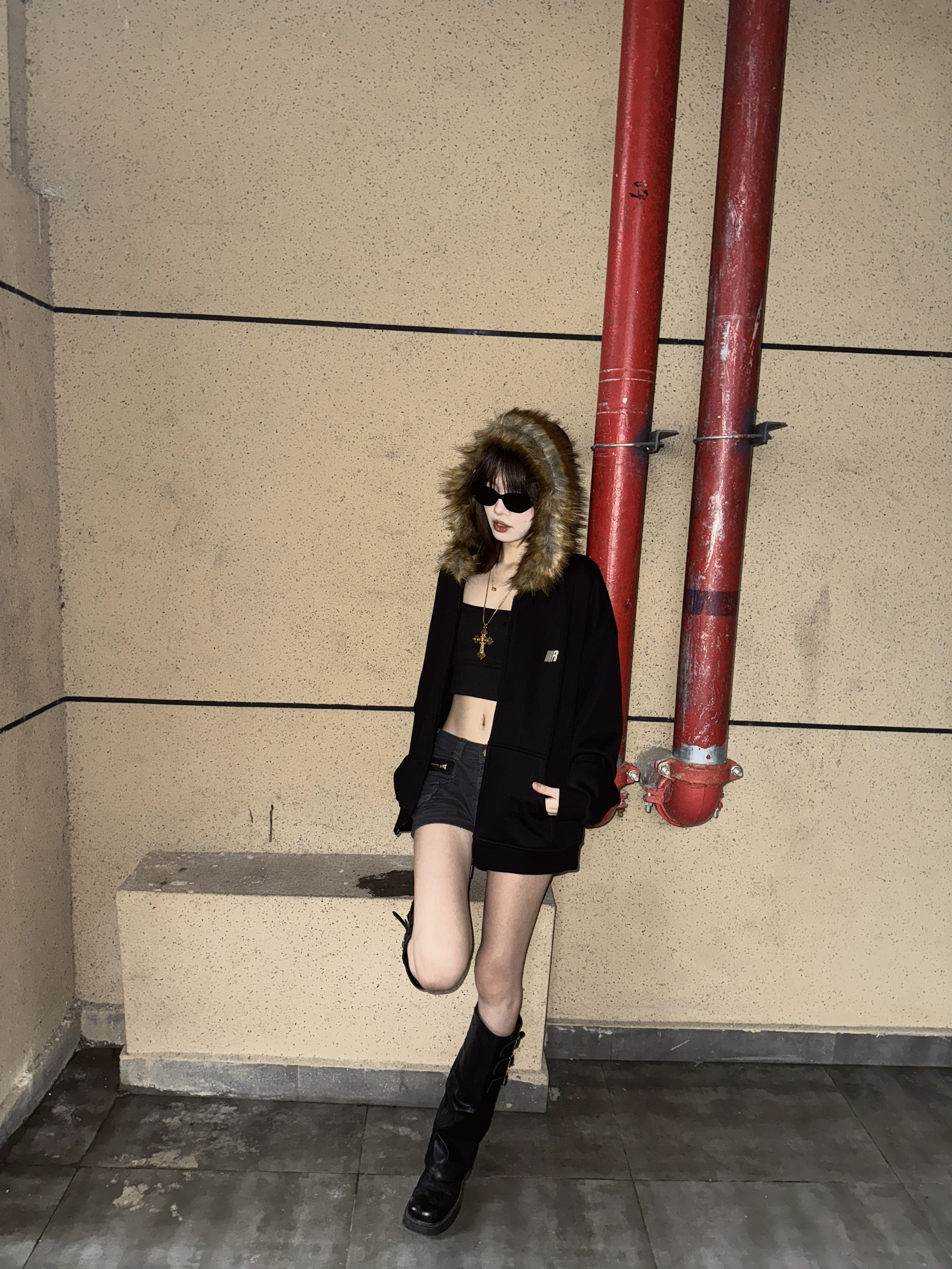 毛领连帽衫|短款内搭|高腰热裤|厚底长靴 甜酷平衡,显高显瘦,拽姐感拉满 工业风背景+all black穿搭,出片率100% 喜欢这种又冷又飒的感觉,谁懂!