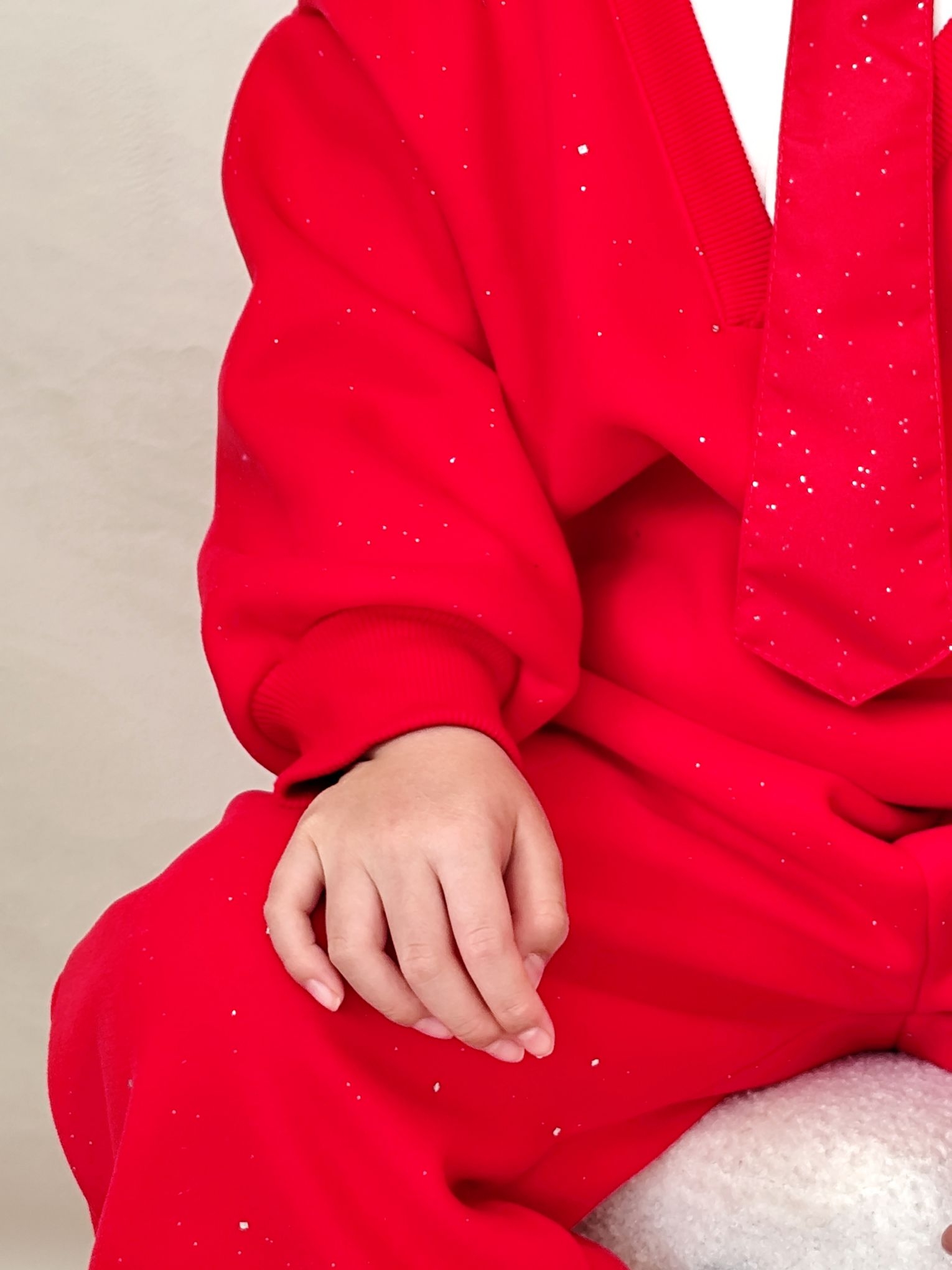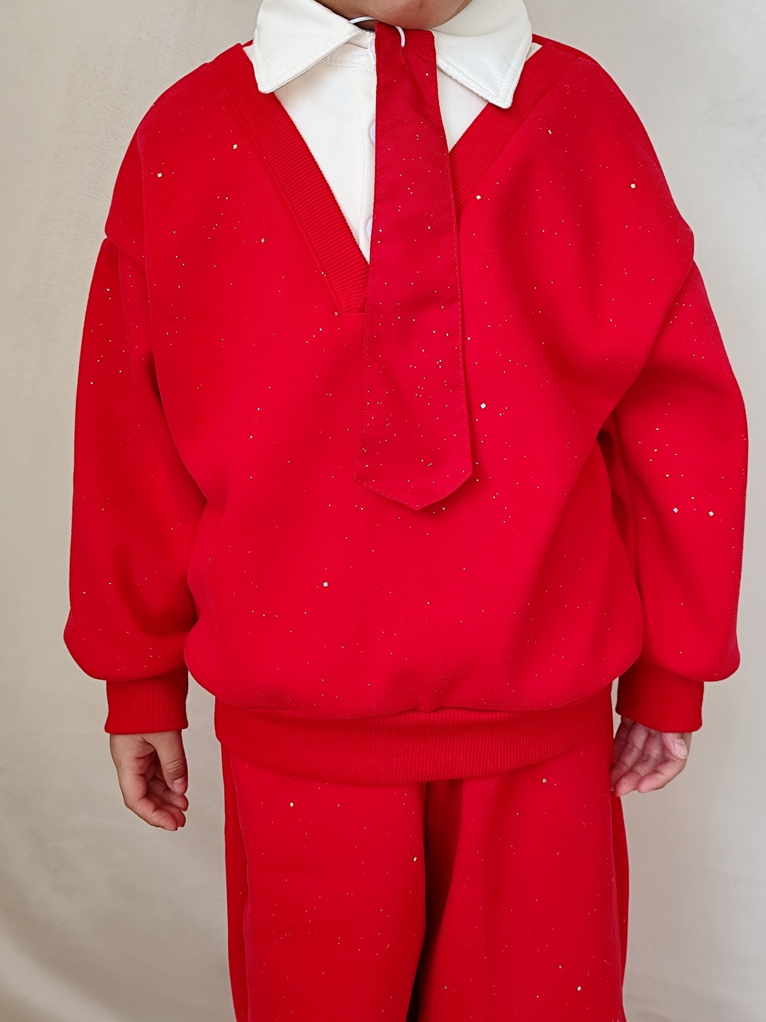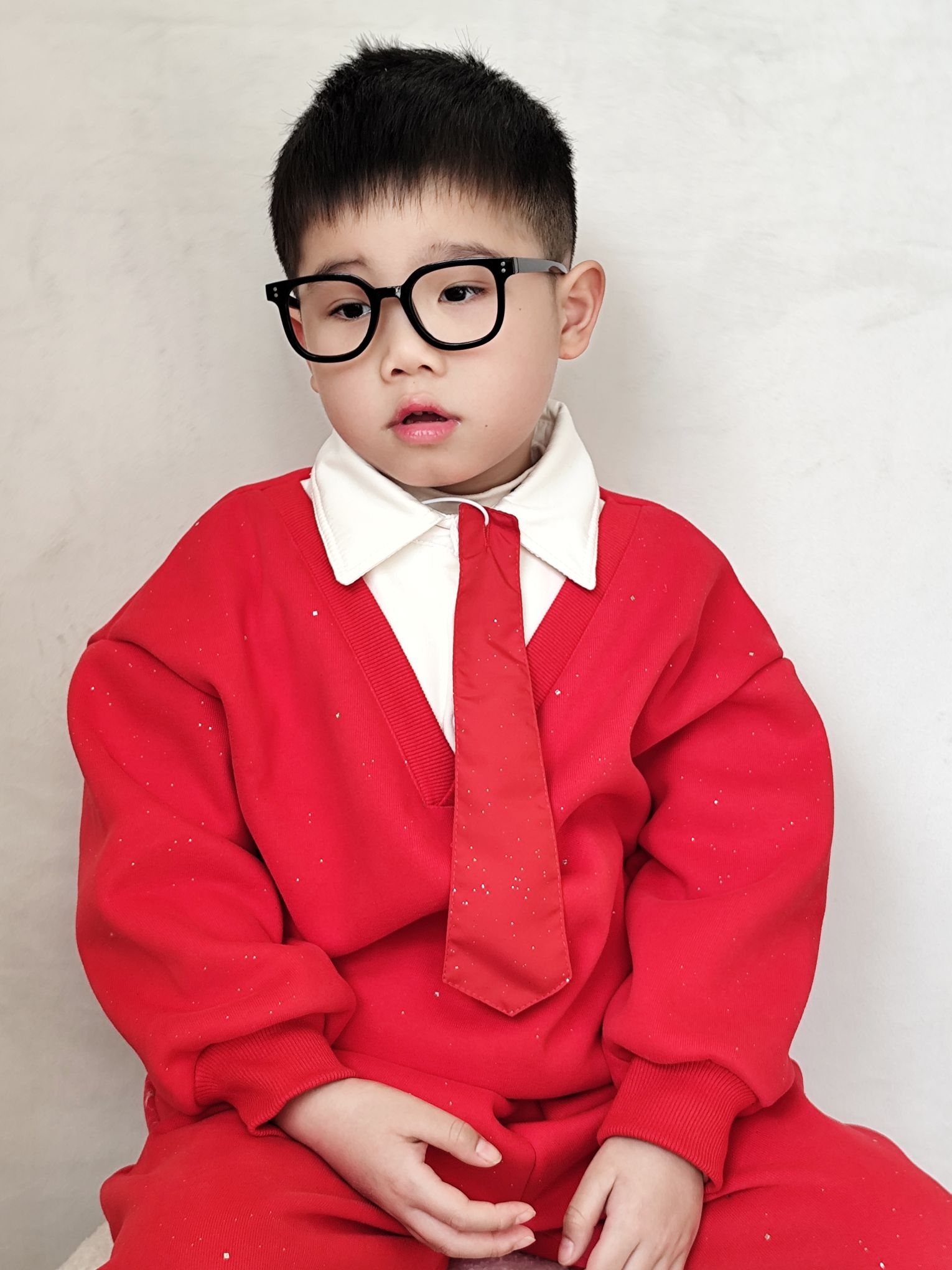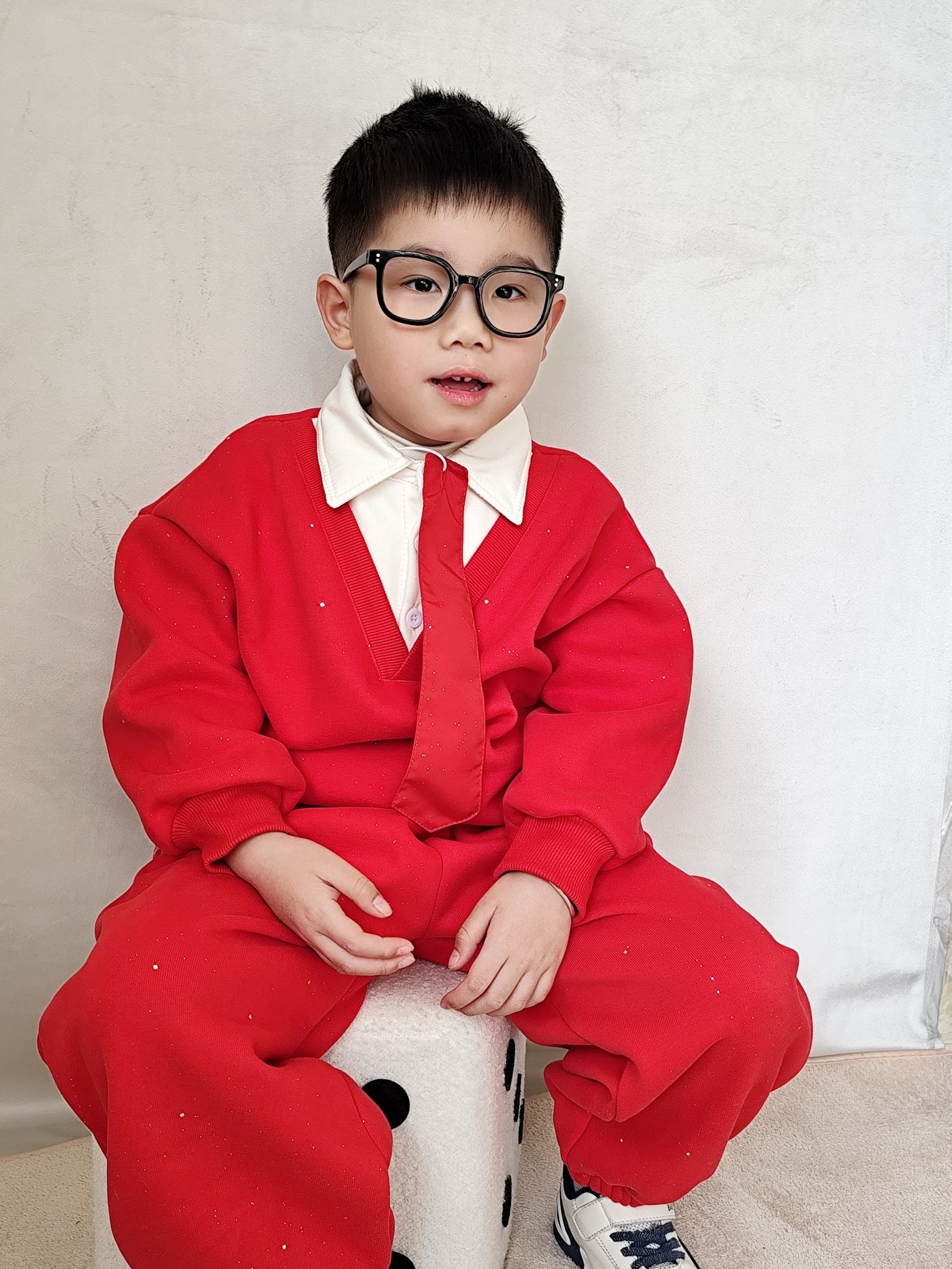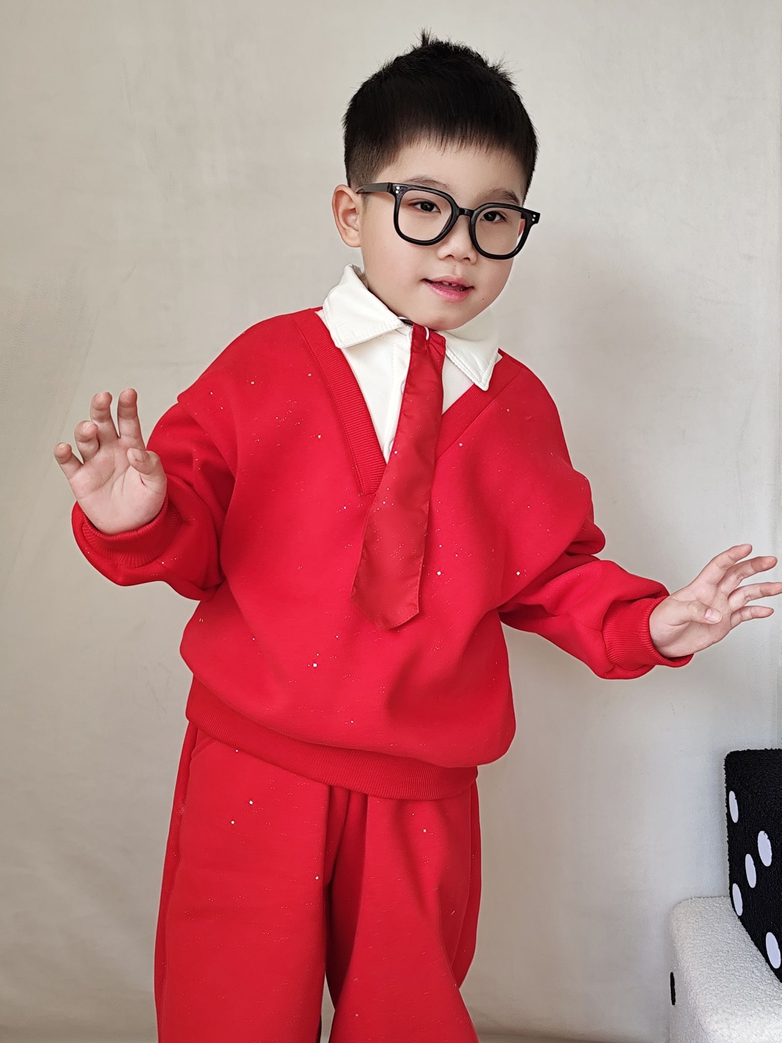 👦🏻 宸宝身高120cm,体重23kg,穿120码刚好合身~这套红色细闪V领套装+假领领带真的太戳我了! - 面料感受:加薄绒的卫衣面料,摸起来软fufu的,内里是细腻的绒,早春穿不冷,室内也不会闷汗,弹力也够,娃跑跳完全不受限。 - 设计细节:自带细闪的红色面料,阳光下会有细碎的光泽感,特别显白又喜庆!假领+领带的设计是点睛之笔,不用额外搭配,一秒变身小绅士,拍照巨出片。 - 穿着体验:宸宝自己...