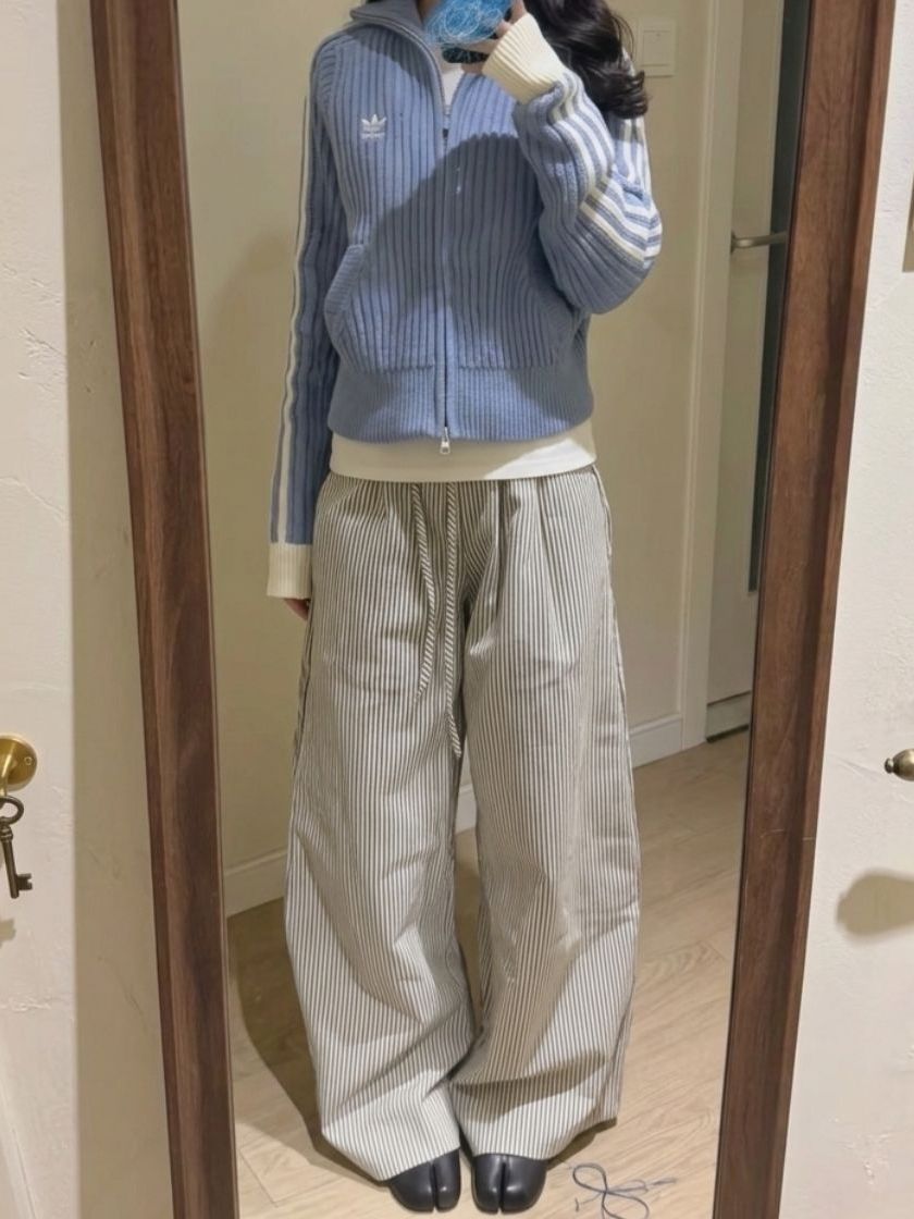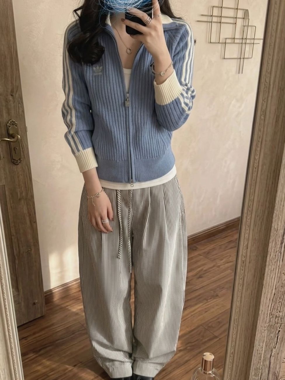 终于入手吴艳妮同款阿迪开衫! 修身版型巨显腰细,蓝白配色超显白 搭条纹阔腿裤,慵懒又时髦 学生党、打工人都能冲的百搭套装