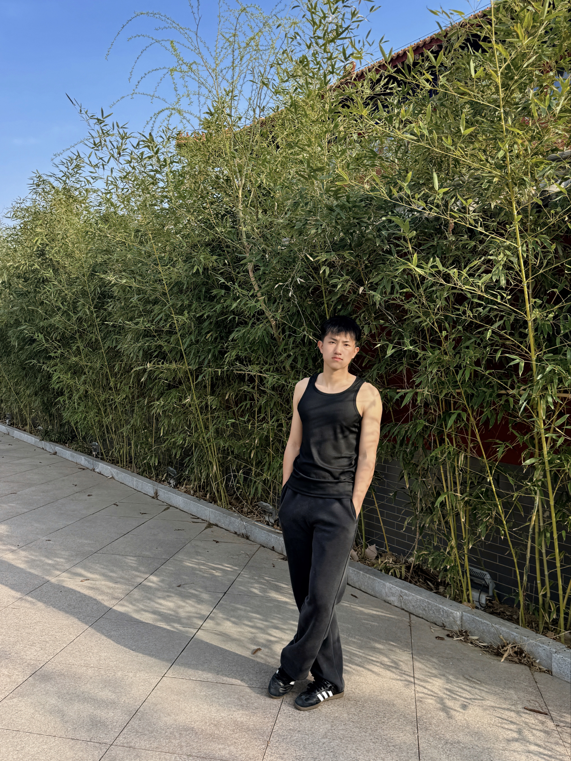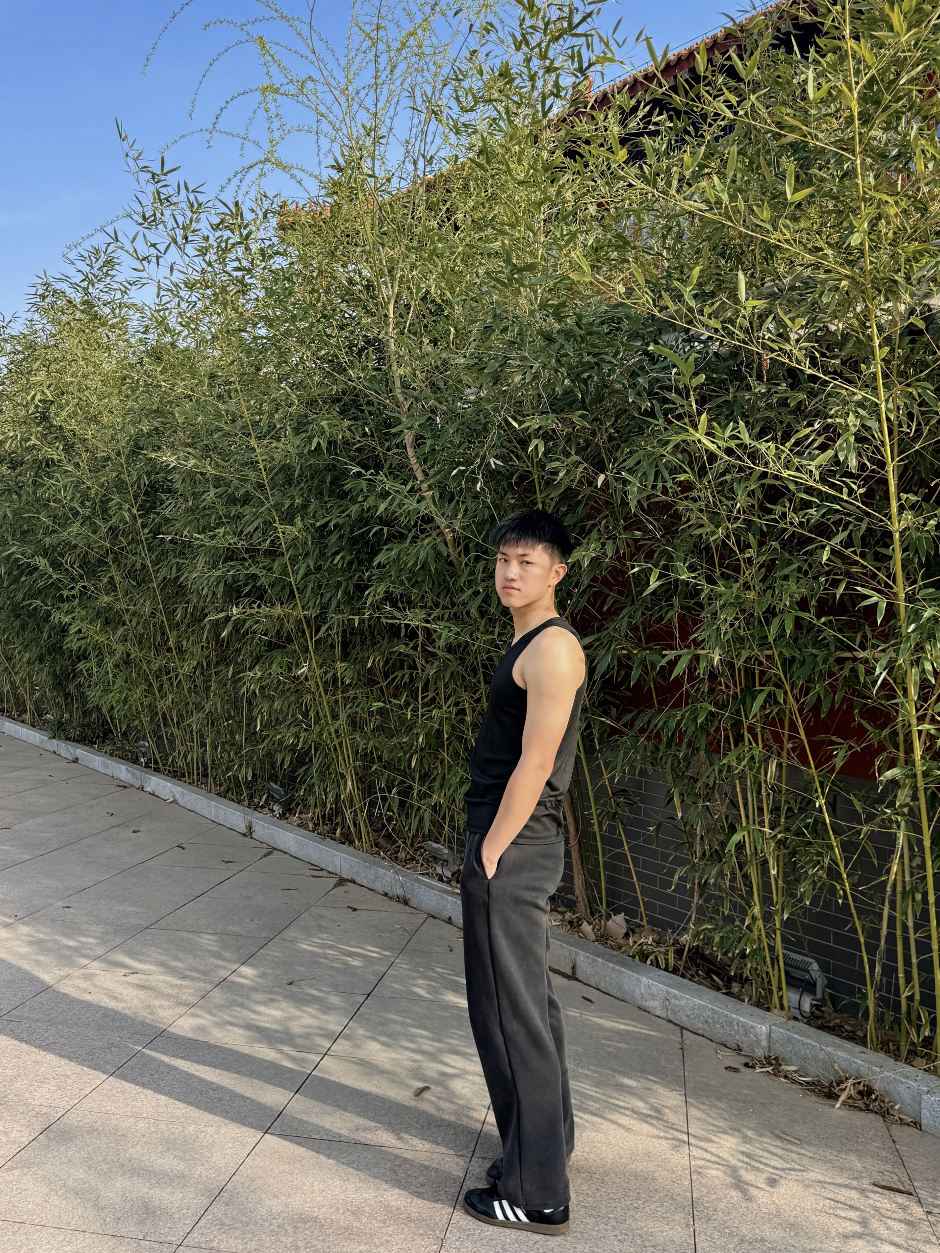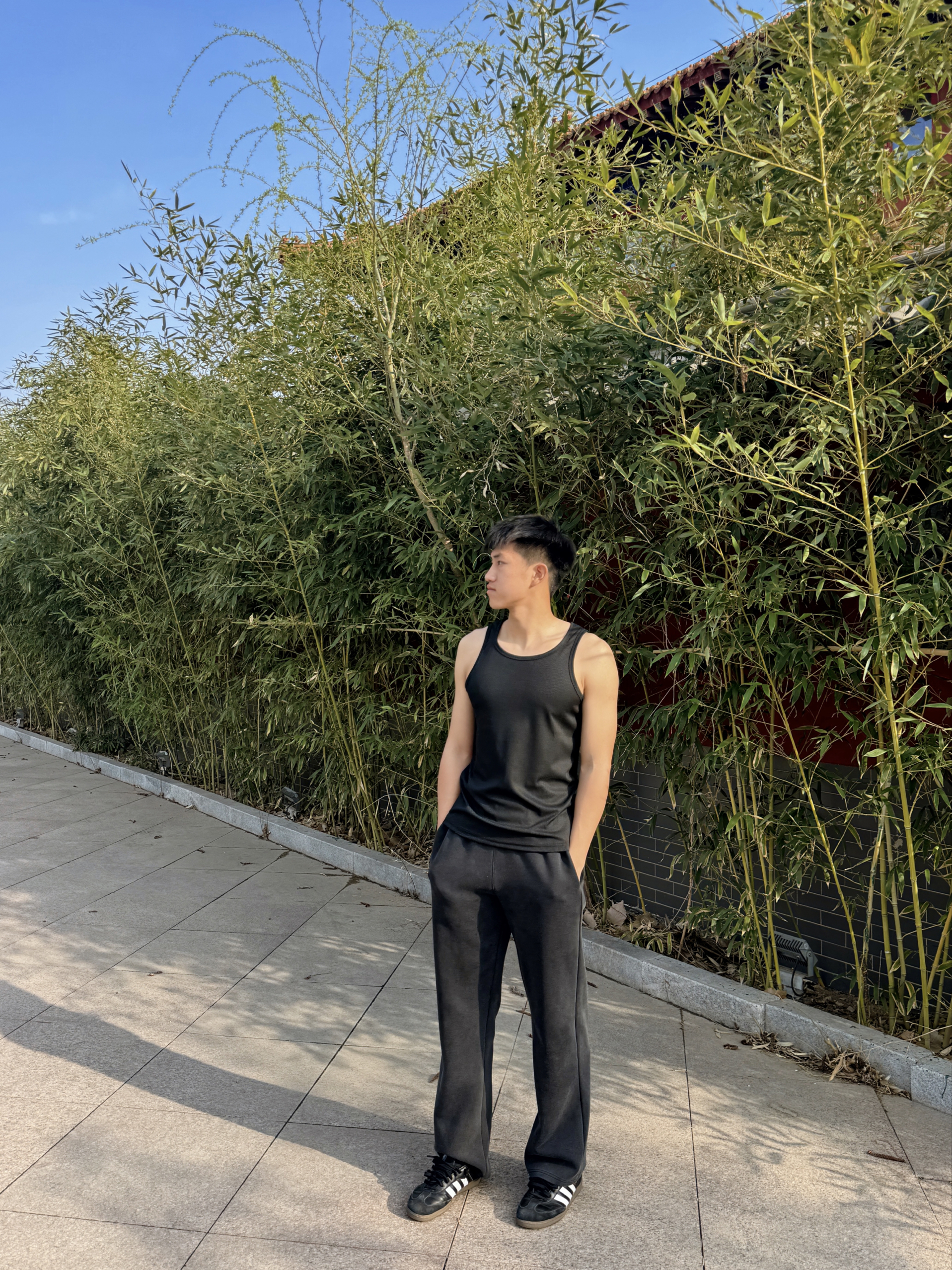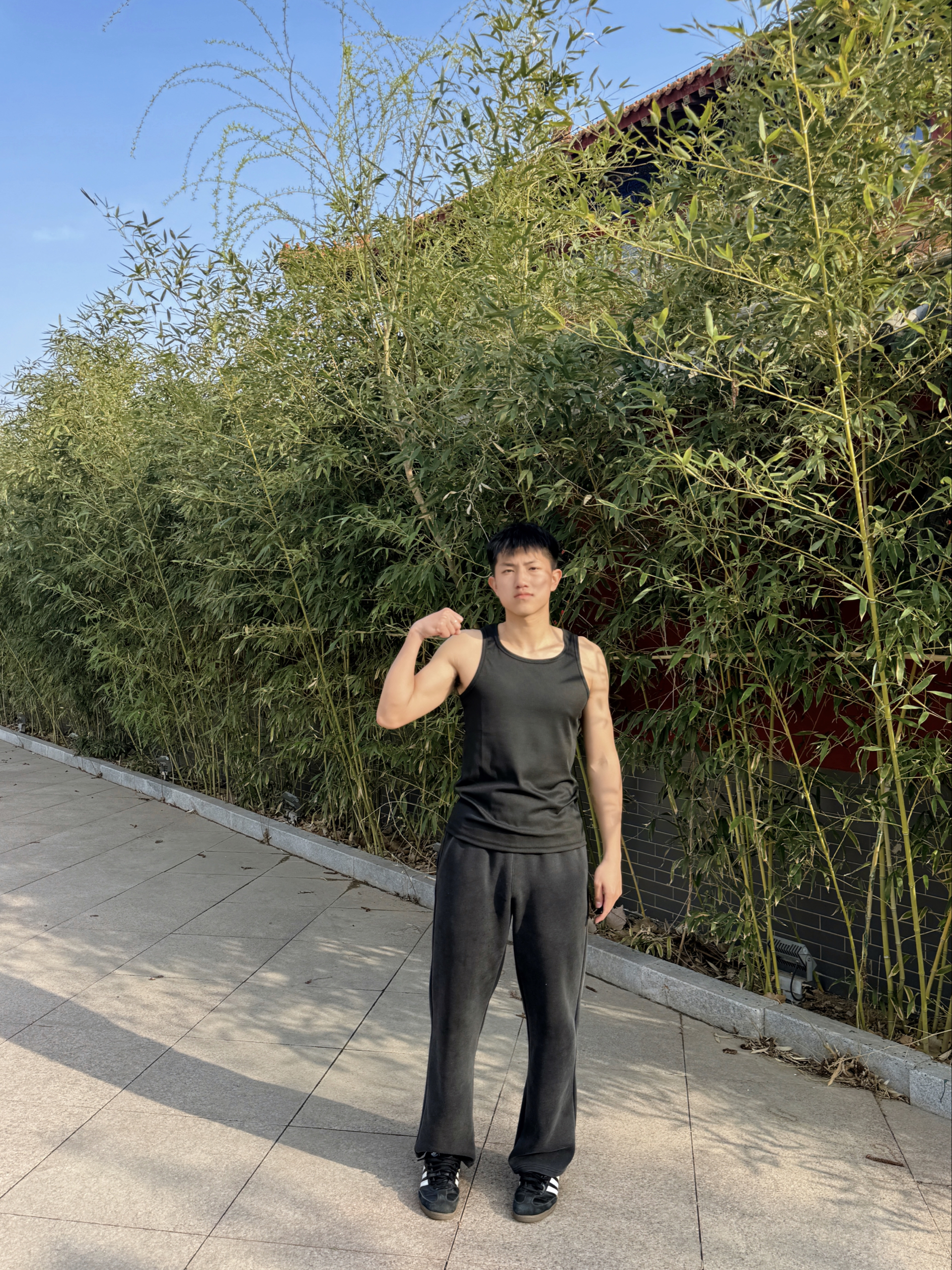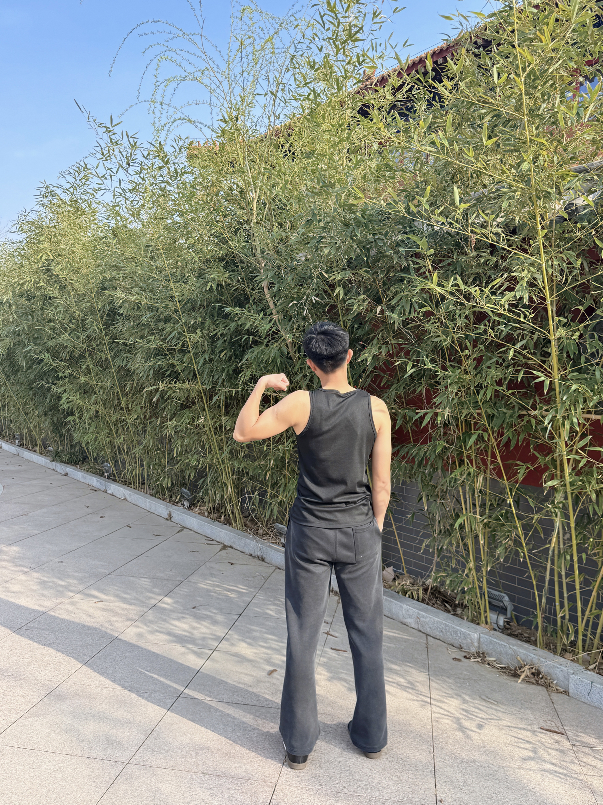 兄弟们~谁懂啊~最近挖到一套超适合健身穿搭的宝藏单品,必须来给大家种草啦🌿 就是这个黑色无袖背心+灰色束脚运动裤的组合,真的太戳我们健身人的心啦❤️ 先说说这件背心,面料软软糯糯的但完全不透肉,弹力超大!我平时练手臂做动作的时候,完全不会觉得束缚,抬手转身都超自在~而且这种简约的黑色真的巨显瘦,我这种有点肌肉线条的男生穿起来,肩宽一下子就出来了,健身完拍照超有氛围感📸 搭配的这条灰色运动裤也超绝...