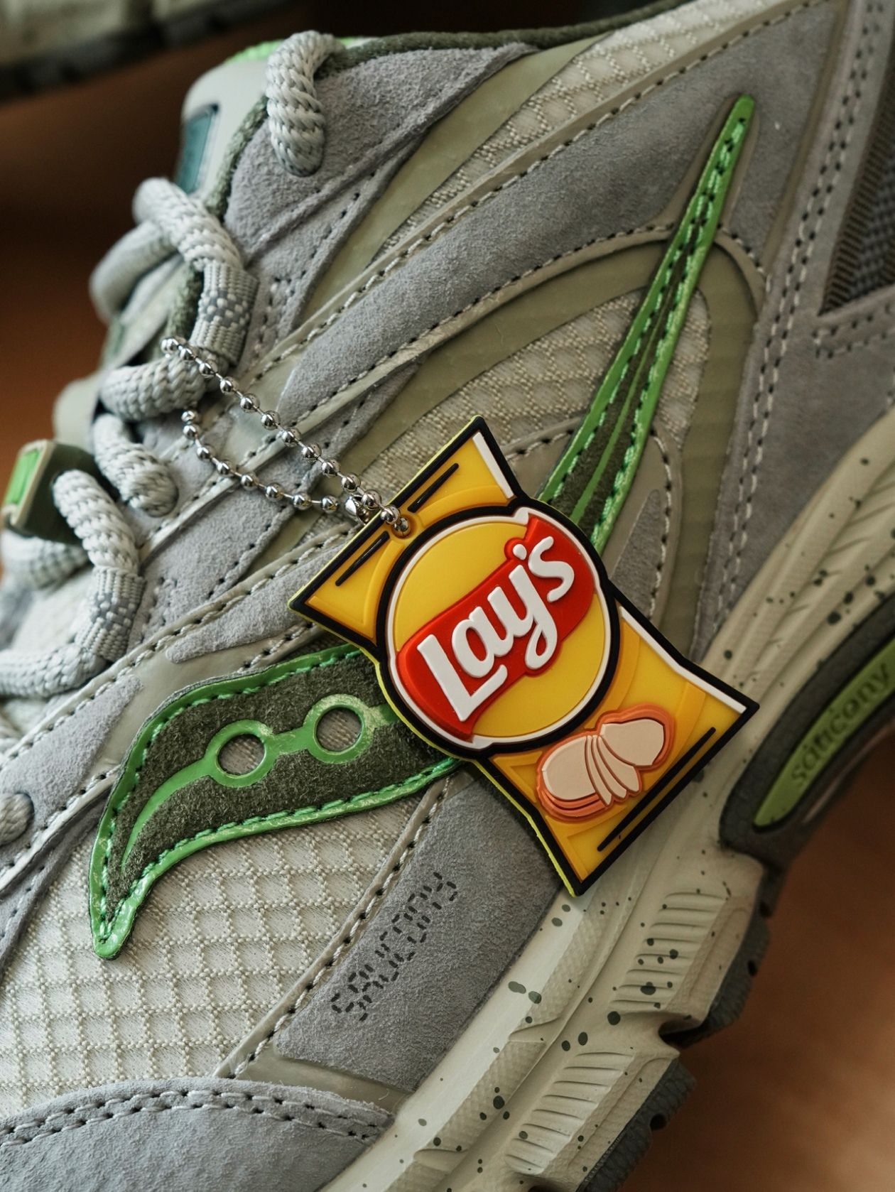 鞋狗当吃货的快乐再来分享一次!😂 上周开箱了原味的乐事联名 今天和朋友们一起来看看第二弹吧🙋🏻 乐事 x Saucony Cohesion 2K 换了鞋型也换了“口味” 海苔味当然得用灰绿色呈现咯🏖️ 没想到中底的泼墨细节还还原出了海苔碎的感觉 真没谁的鞋能够做到上脚自带食欲buff啦😂