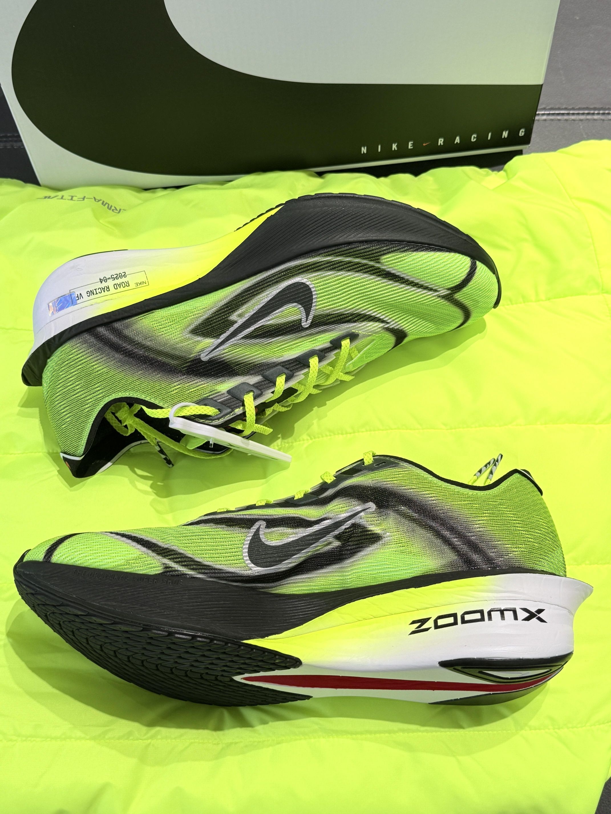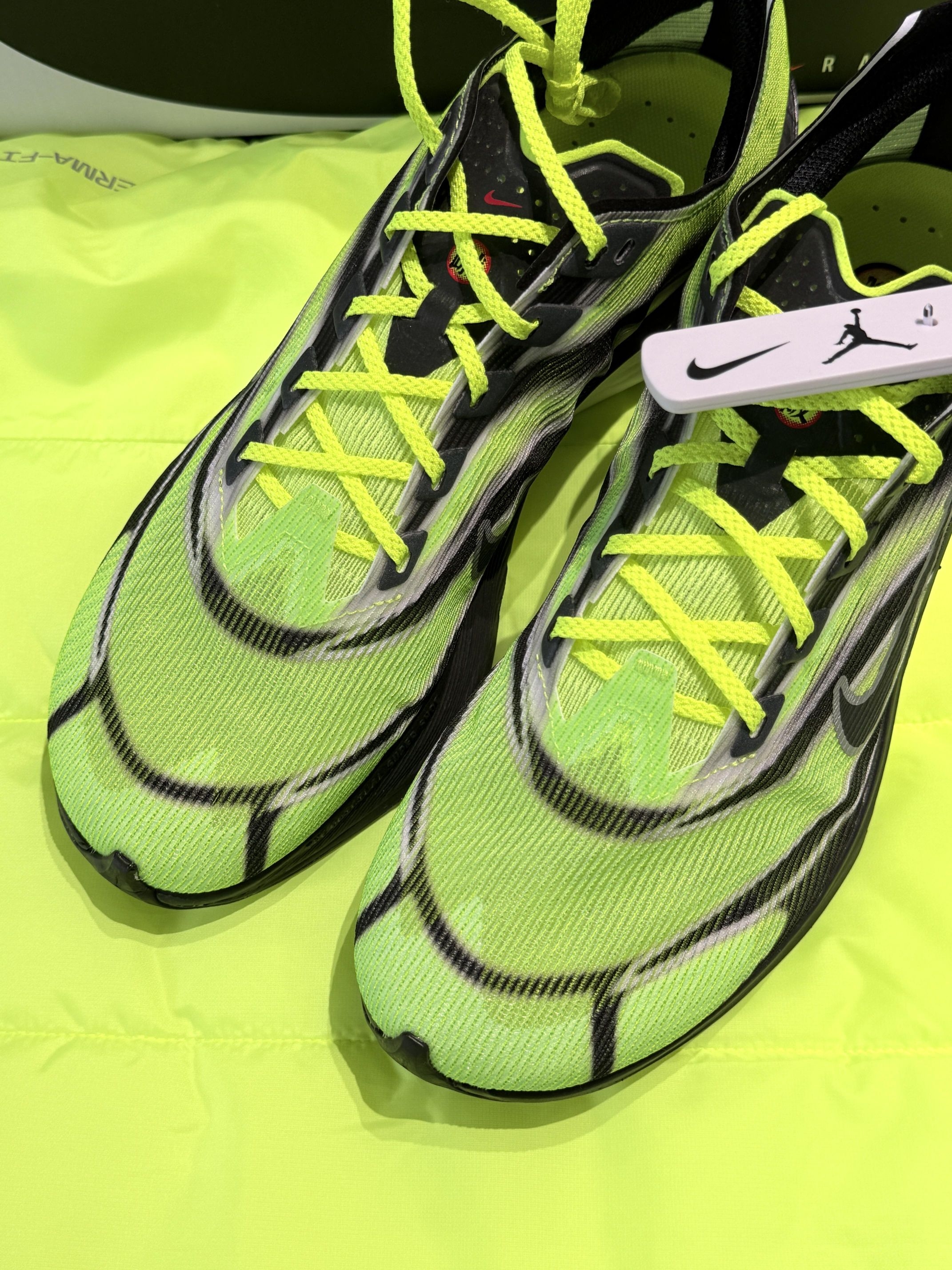 鞋跟的部落风格火焰纹源自2002年Zoom Streak Spectrum Plus,当年这双"火焰鞋"曾见证日本跑者在驿传赛道上的辉煌。如今这抹青绿底色搭配黑色线条的设计,既呼应90年代初代Air Streak Ekiden的复古质感,又以锐利线条勾勒出速度感,仿佛将箱根山间的疾风凝固在鞋面上。 🚀科技革新:最轻一代Vaporfly的竞速哲学 作为系列历史上最轻的一代(42.5码仅169克),
