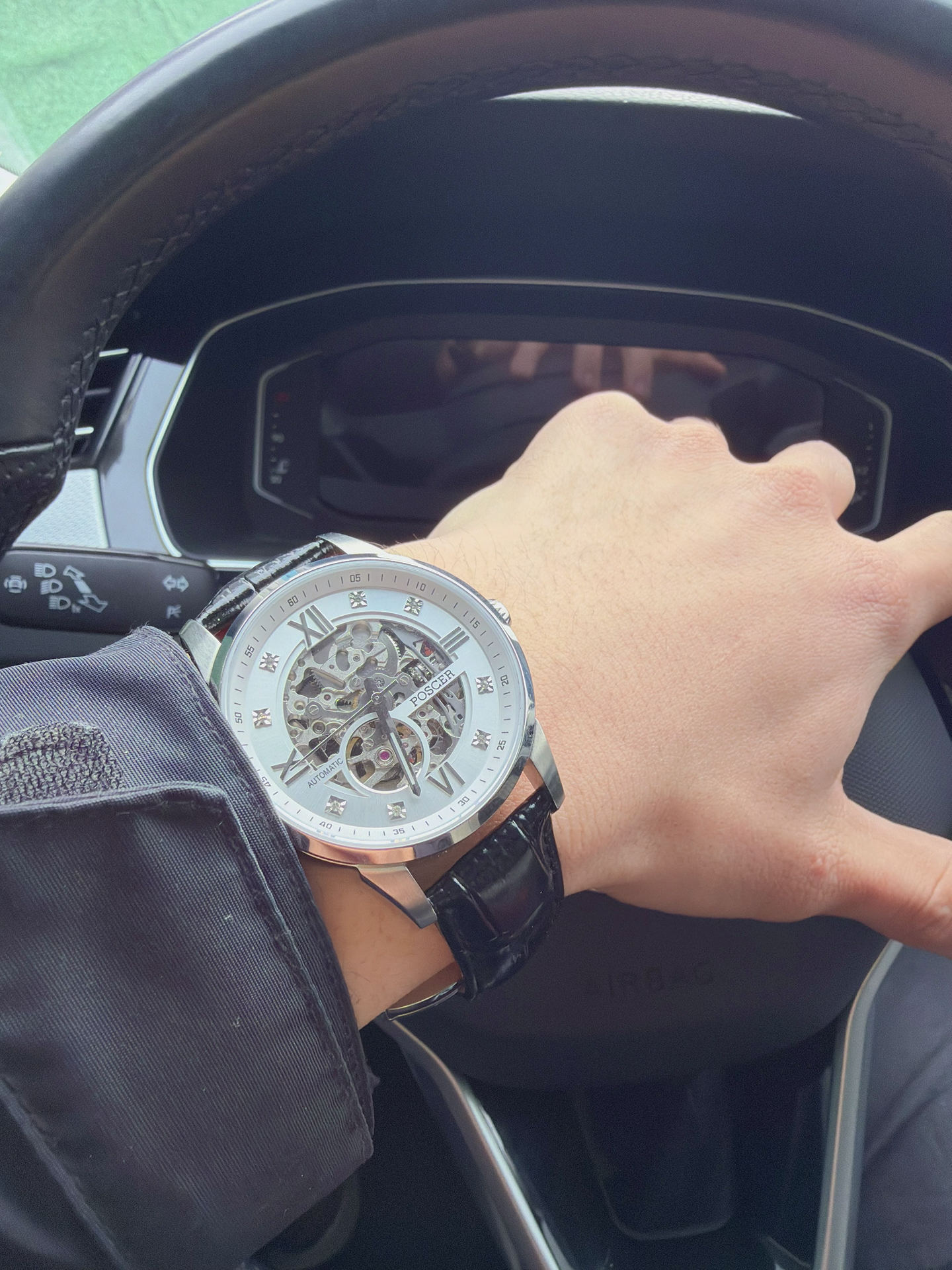 你还真别说 唯诺其家的介块表是有点东西 多边形表盘还蛮有个性滴 内部的设计也是肉眼可见的用心 星辰图案搭配背透设计 真的是又飒又酷 随手一拍都很有质感~