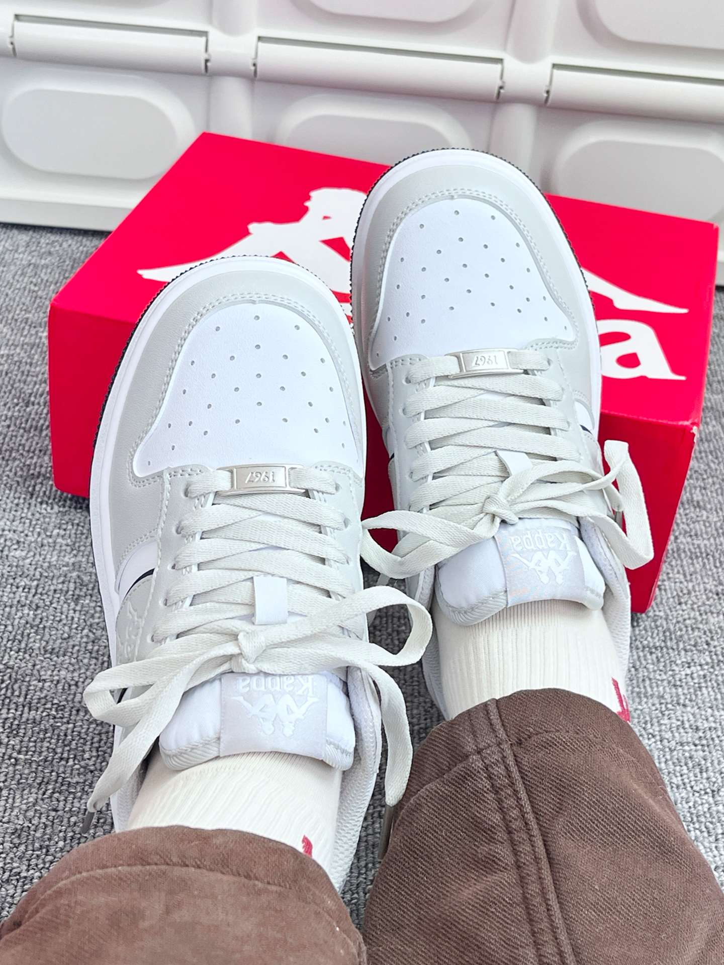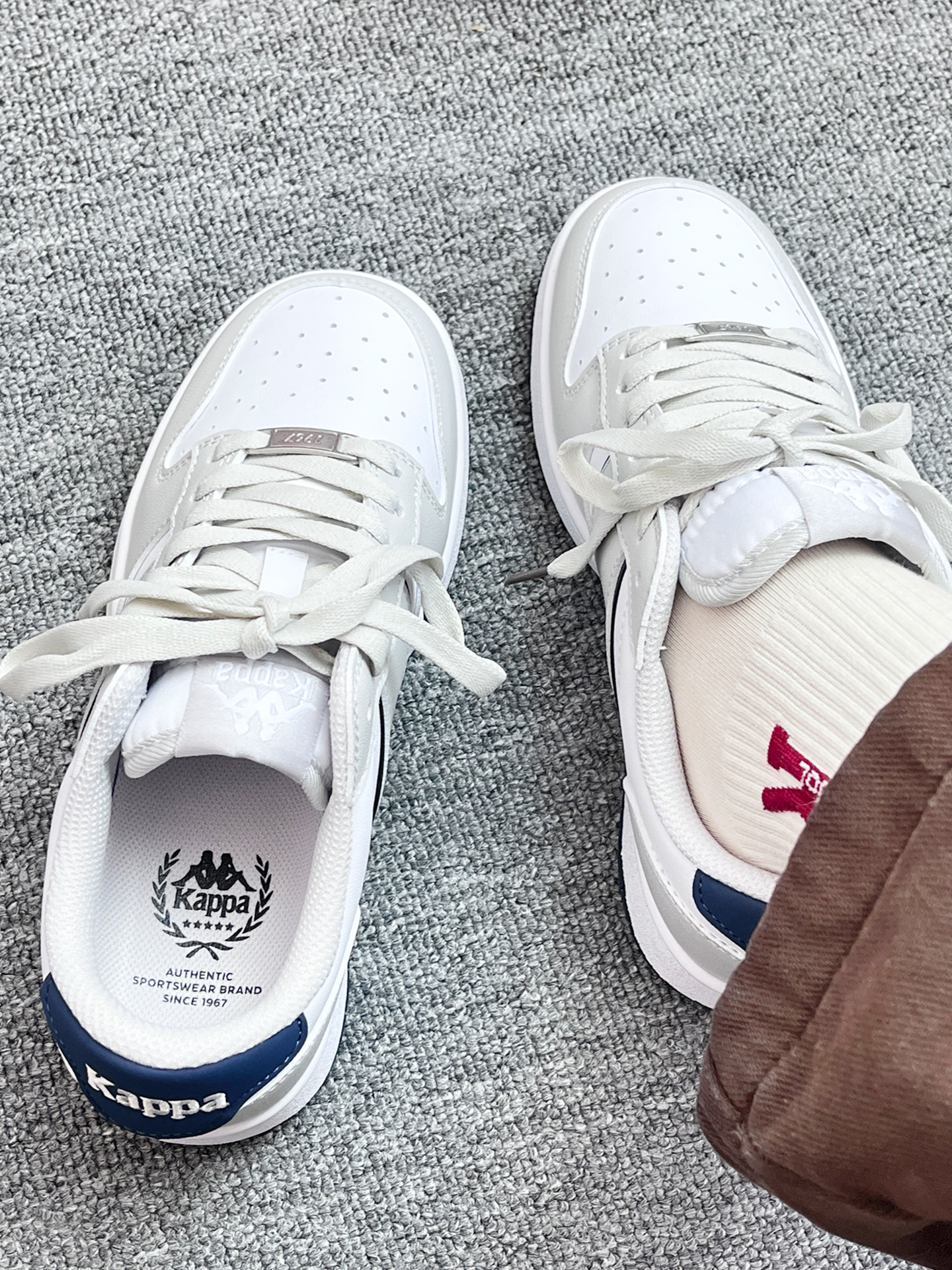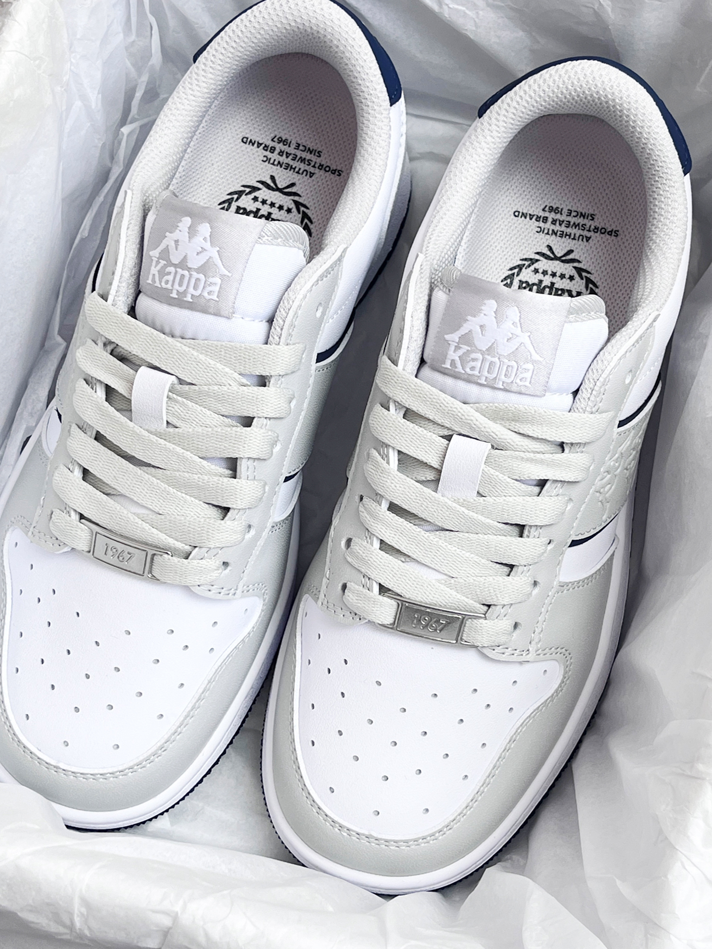 这双 Kappa 灰白撞色板鞋质感清新,荔枝纹皮革拼接藏蓝包边,鞋底还藏着笑脸小彩蛋,搭直筒牛仔裤打造随性休闲感。 通勤配垂感西裤干练利落😊,约会搭碎花半裙甜酷交织💙,逛街配束脚卫裤随性洒脱,适配多种日常场景。 偏爱的清新日常款搭配,搭配同色系发圈,整体氛围更协调柔和。