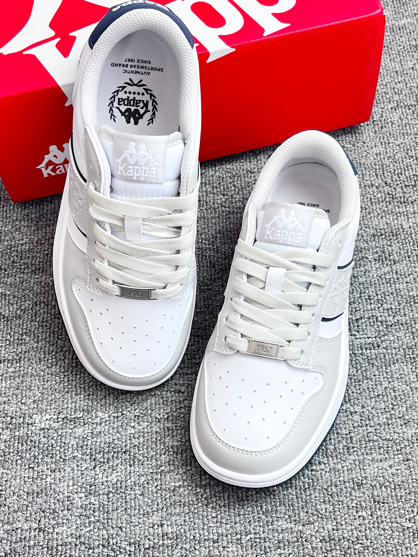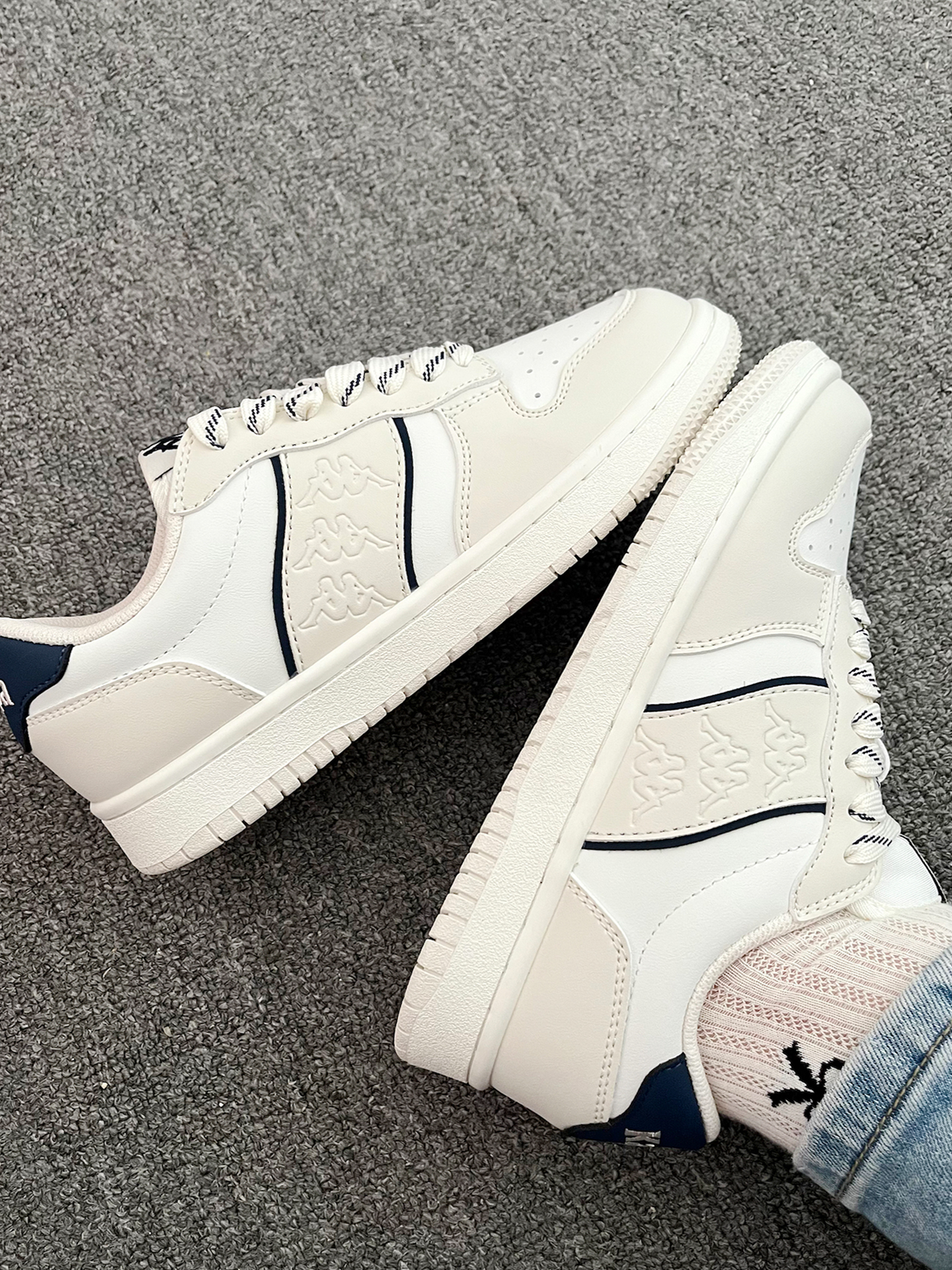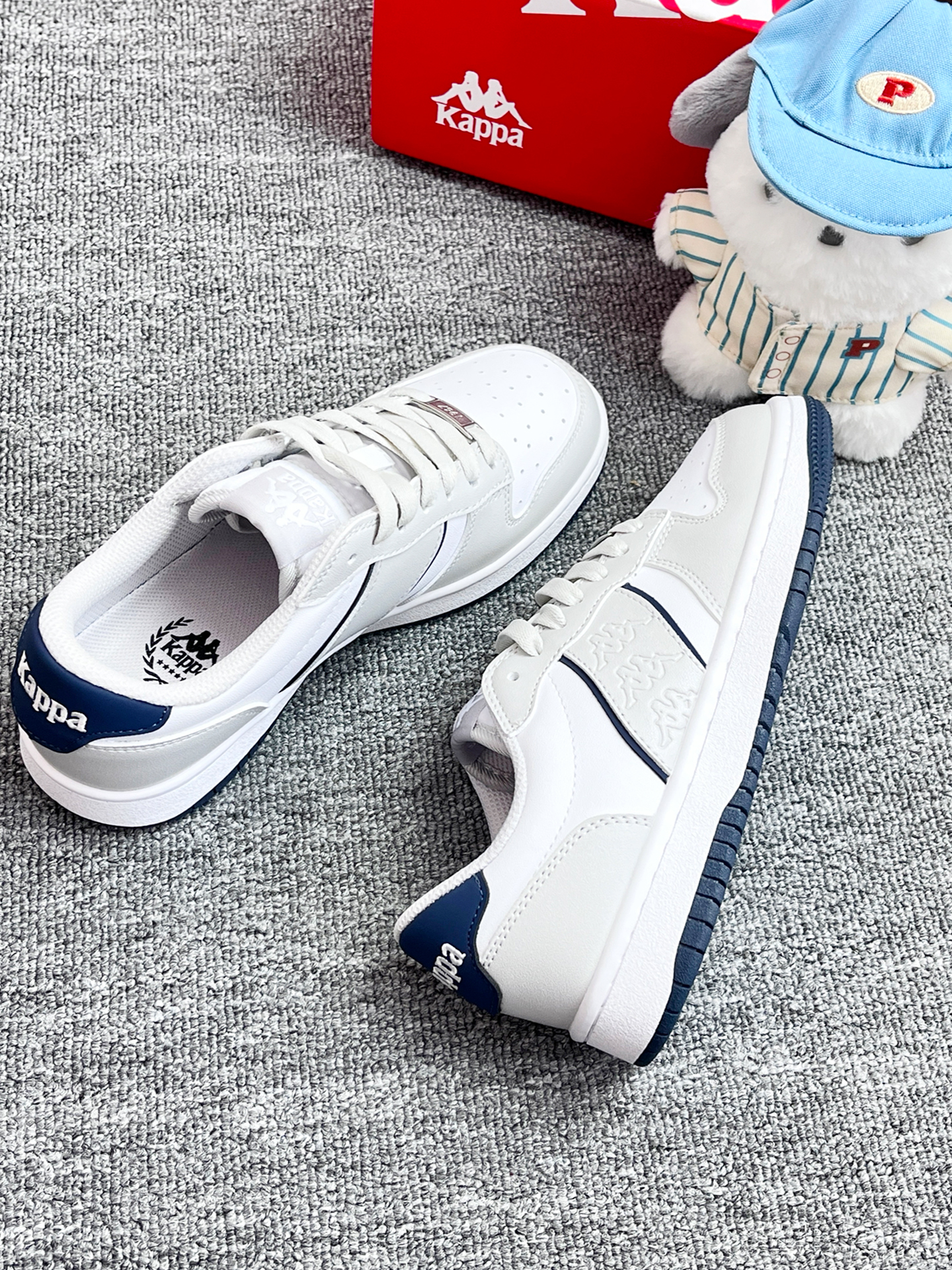 这双 Kappa 灰白撞色板鞋质感清新,荔枝纹皮革拼接藏蓝包边,鞋底还藏着笑脸小彩蛋,搭直筒牛仔裤打造随性休闲感。 通勤配垂感西裤干练利落😊,约会搭碎花半裙甜酷交织💙,逛街配束脚卫裤随性洒脱,适配多种日常场景。 偏爱的清新日常款搭配,搭配同色系发圈,整体氛围更协调柔和。