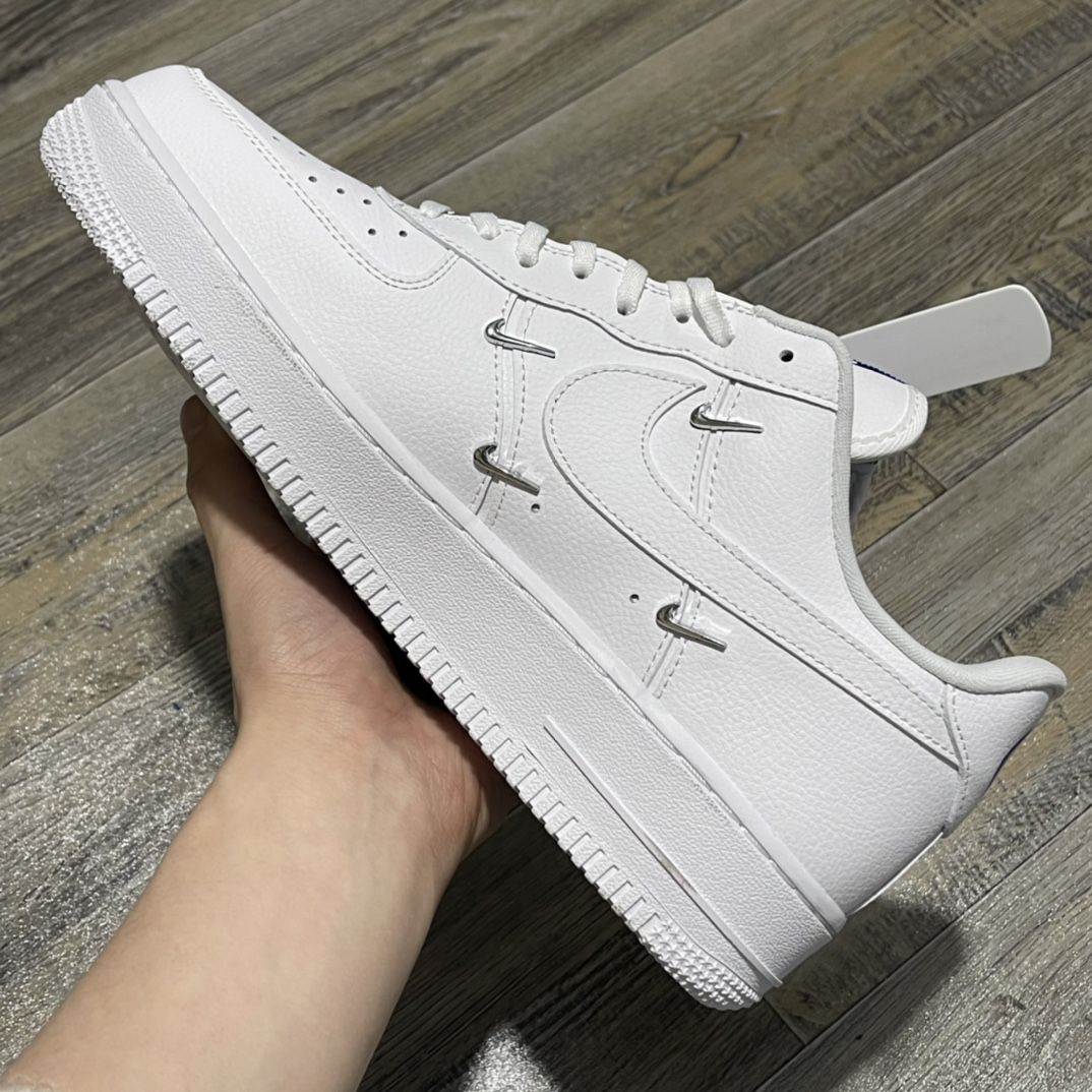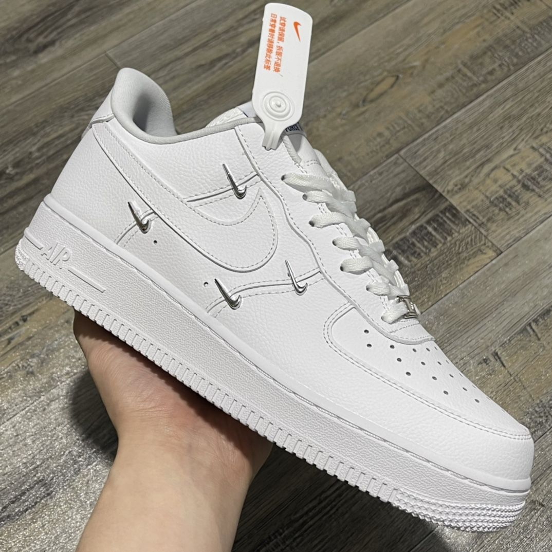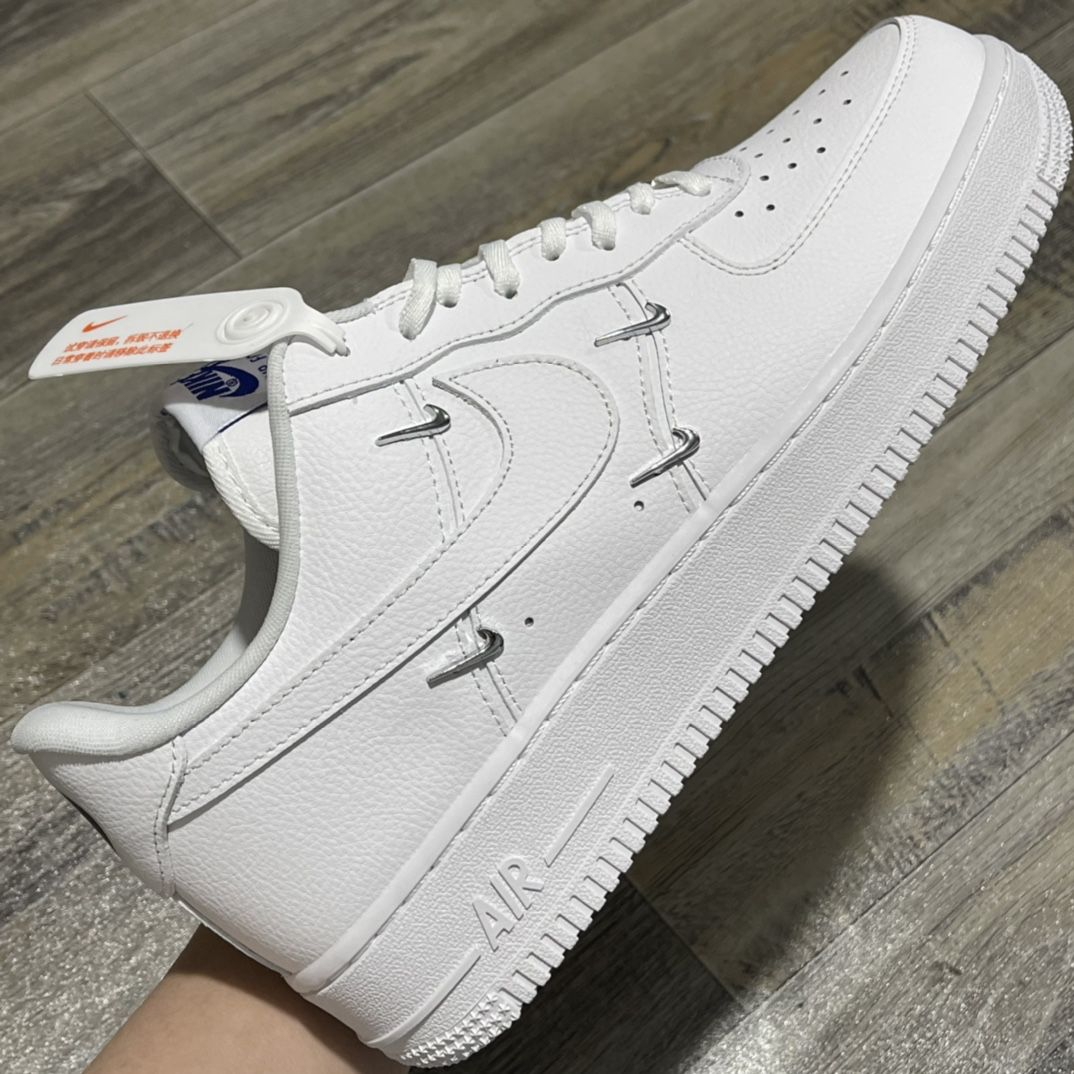 这双Air Force 1在经典纯白基础上做了全新升级,侧边多枚银色小勾点缀,打破单调感,低调又有辨识度,瞬间区别于普通款,穿搭层次感直接拉满。 荔枝纹皮革鞋面质感扎实,耐穿不易皱,经典Air气垫中底脚感软糯,日常通勤、出街走路都不累脚。纯白底色百搭不挑人,搭配牛仔裤、工装裤、运动裤都能轻松驾驭,学生党和潮人都能hold住。 细节做工精致,银色小勾立体饱满,鞋舌蓝标还原经典,防伪扣和吊牌齐...
