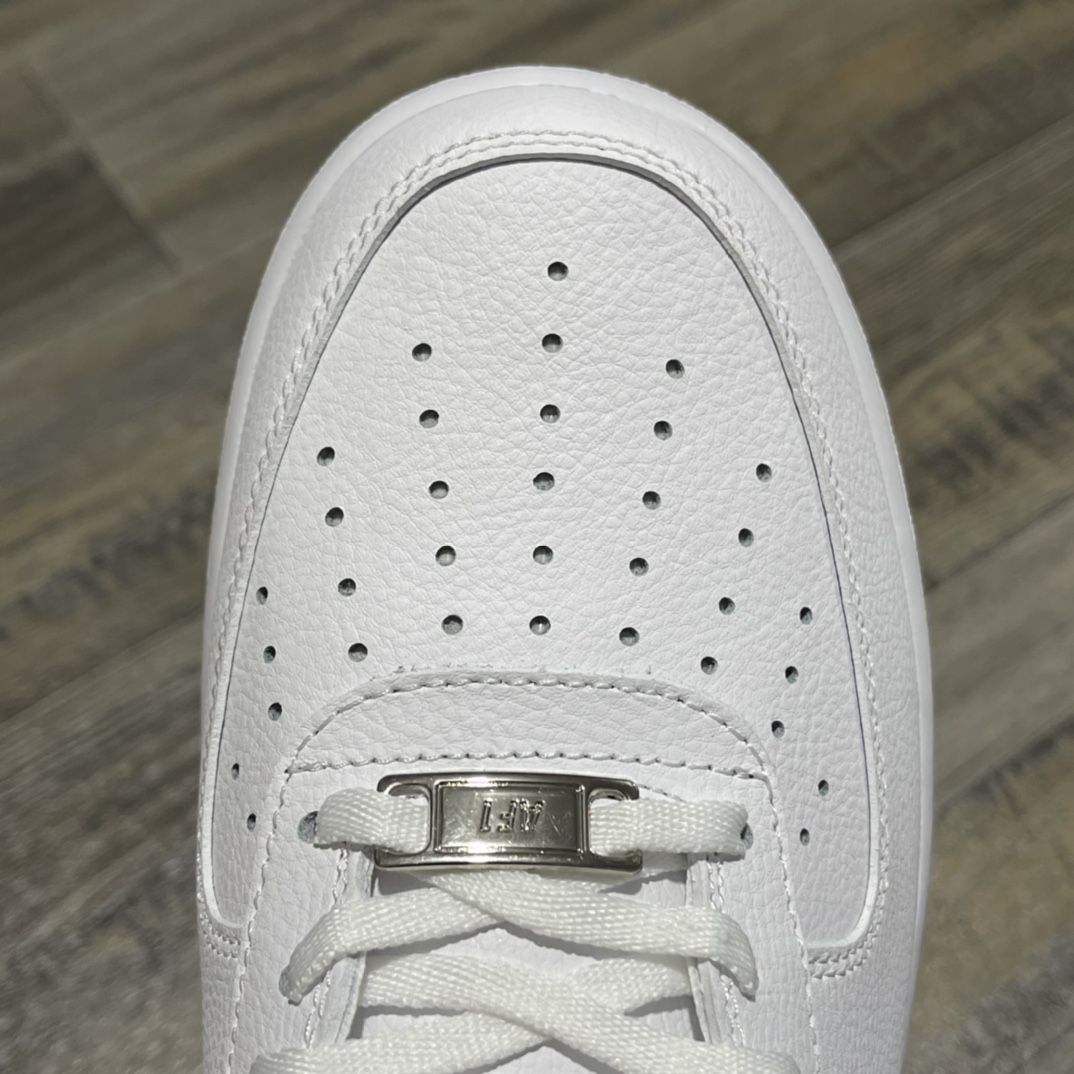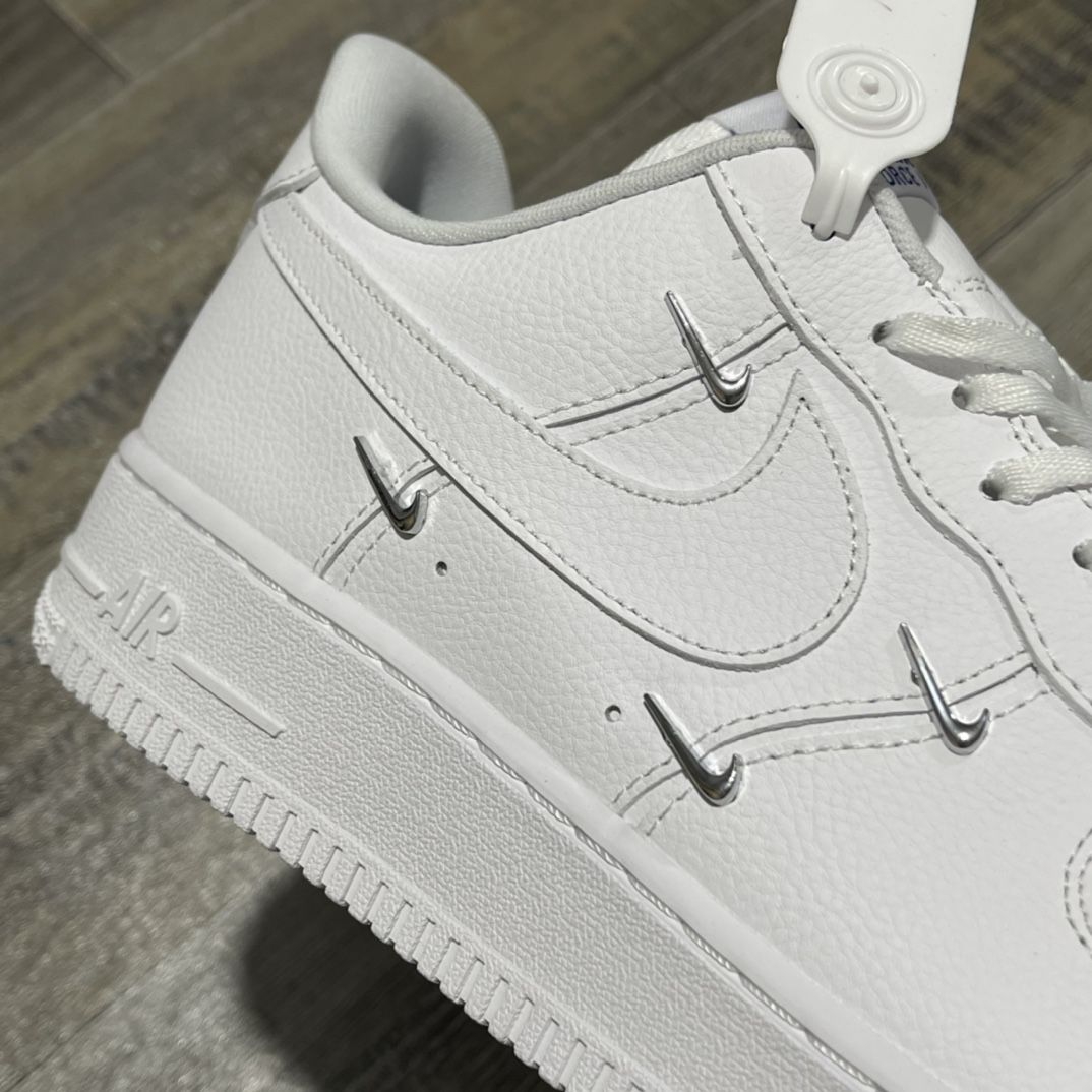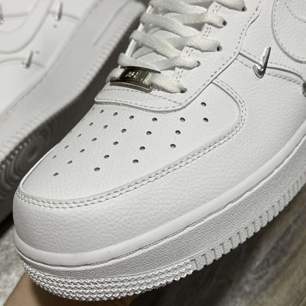 这双Air Force 1在经典纯白基础上做了全新升级,侧边多枚银色小勾点缀,打破单调感,低调又有辨识度,瞬间区别于普通款,穿搭层次感直接拉满。 荔枝纹皮革鞋面质感扎实,耐穿不易皱,经典Air气垫中底脚感软糯,日常通勤、出街走路都不累脚。纯白底色百搭不挑人,搭配牛仔裤、工装裤、运动裤都能轻松驾驭,学生党和潮人都能hold住。 细节做工精致,银色小勾立体饱满,鞋舌蓝标还原经典,防伪扣和吊牌齐...