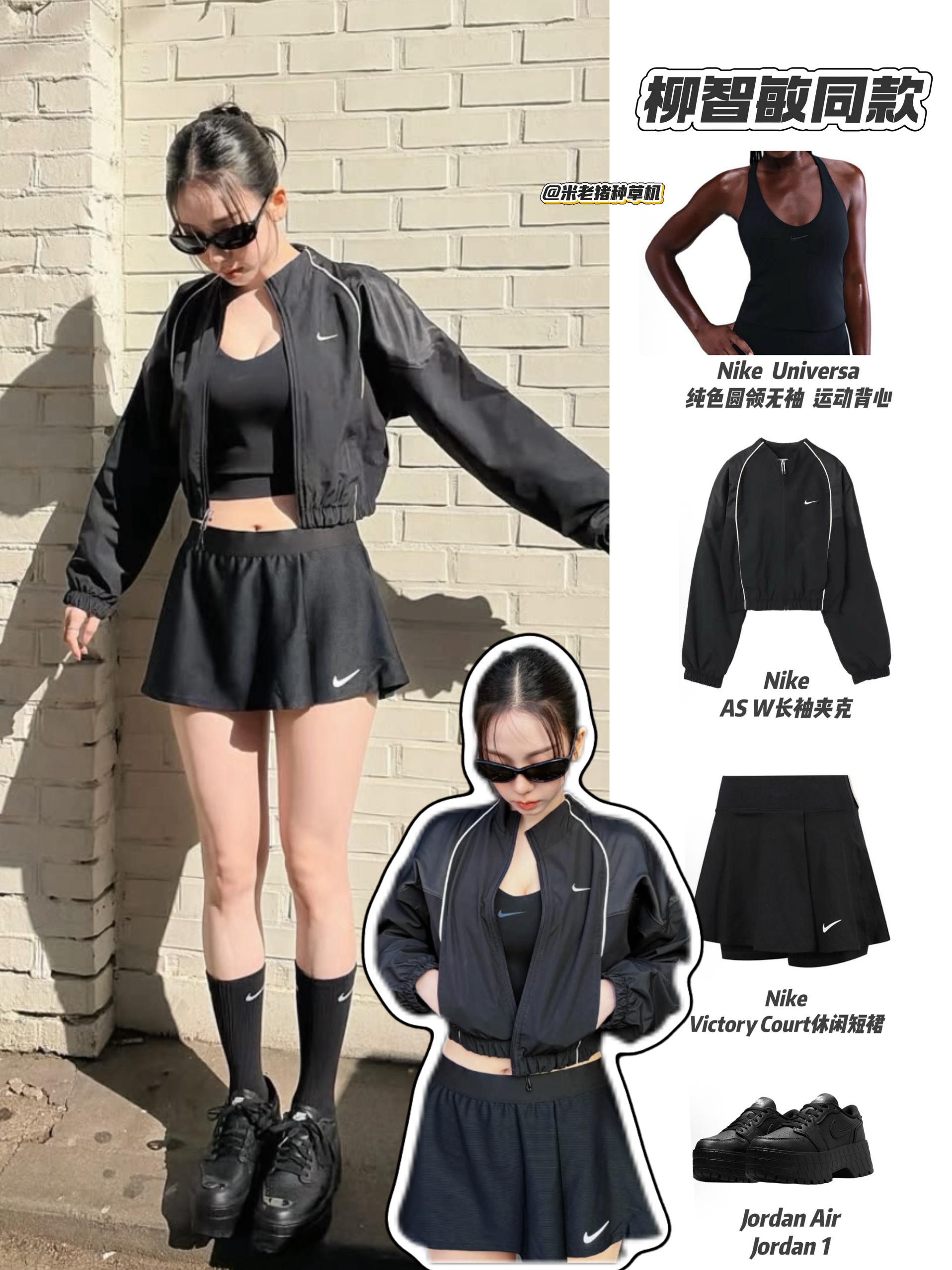 这套柳智敏同款运动风穿搭太飒了✨ 全黑配色酷感拉满,短款夹克+运动背心露出腰线,利落又显活力,下装的裙裤设计兼顾灵动与安全感,厚底鞋悄悄增高还能平衡甜酷感,整体休闲又不失精致感,日常出街或轻运动都适配,是活力感满满的美式街头风范本。