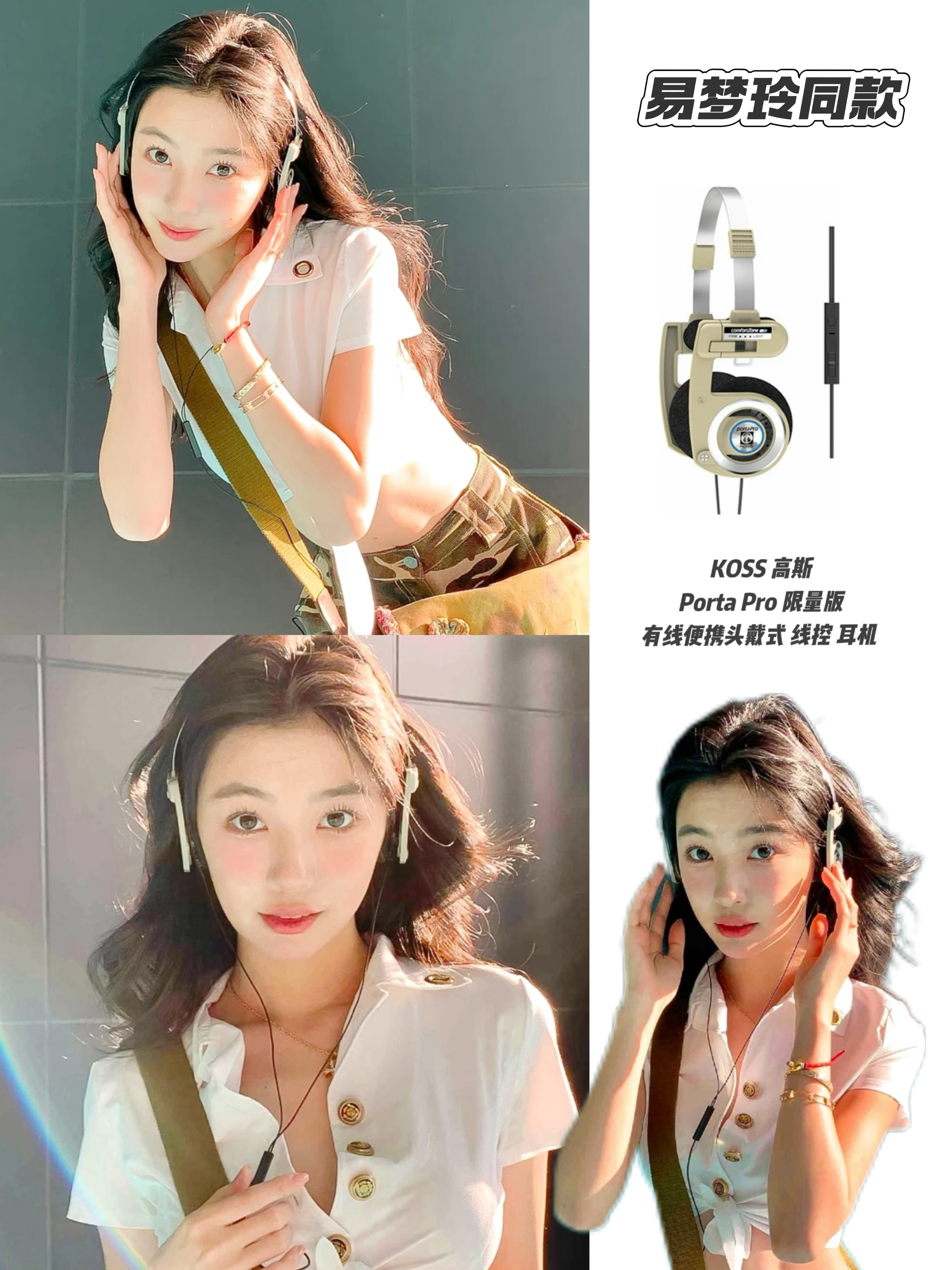 易梦玲这套look把Y2K复古感拉满了! 白色短款扭结衬衫露腰又俏皮,搭配迷彩下装甜酷平衡~ 最吸睛的是易梦玲同款KOSS高斯头戴耳机,浅卡其色复古又百搭,金属质感和线控设计瞬间梦回千禧年,随便一拍都是美式复古辣妹感,氛围感直接拉满!