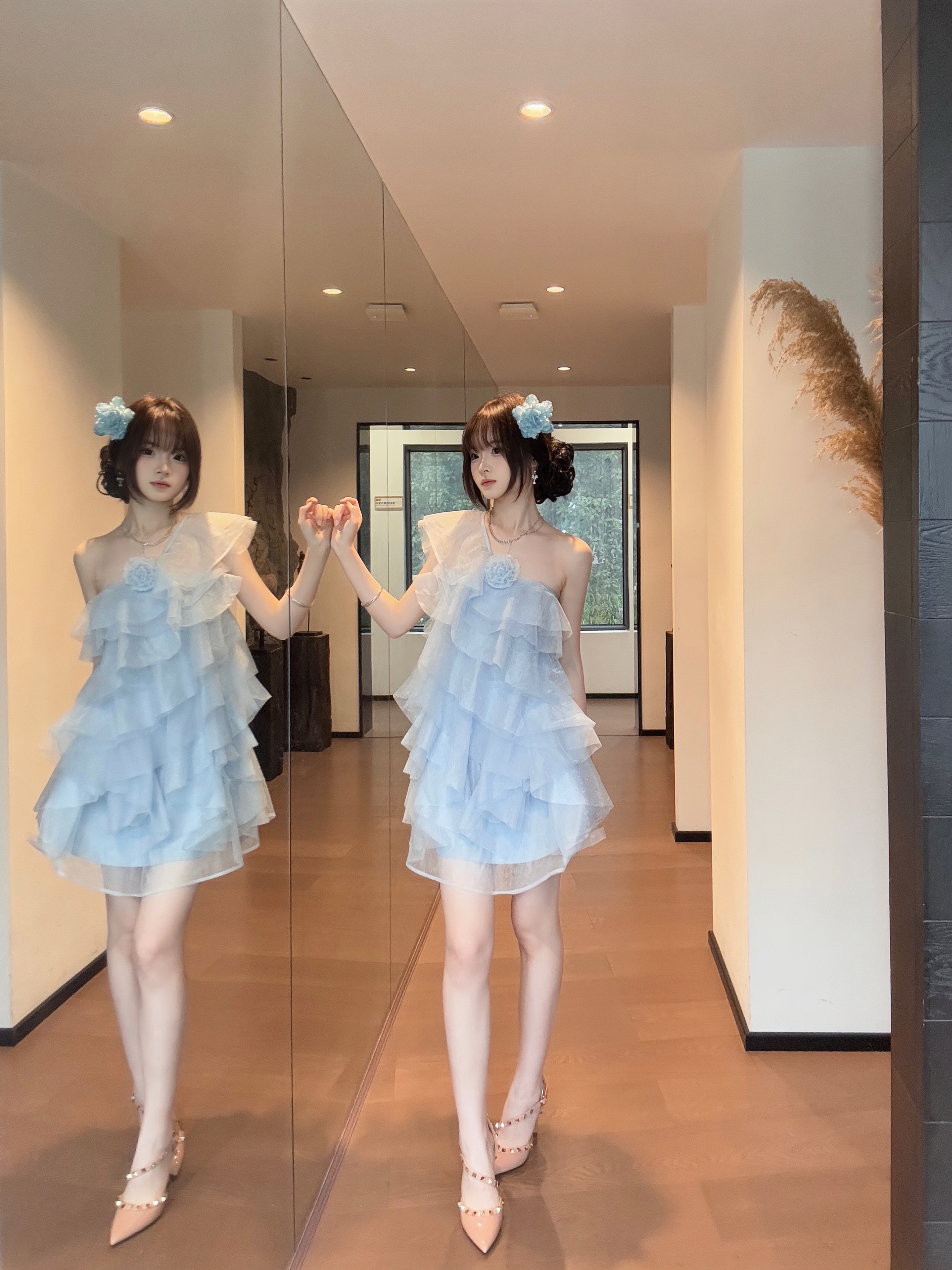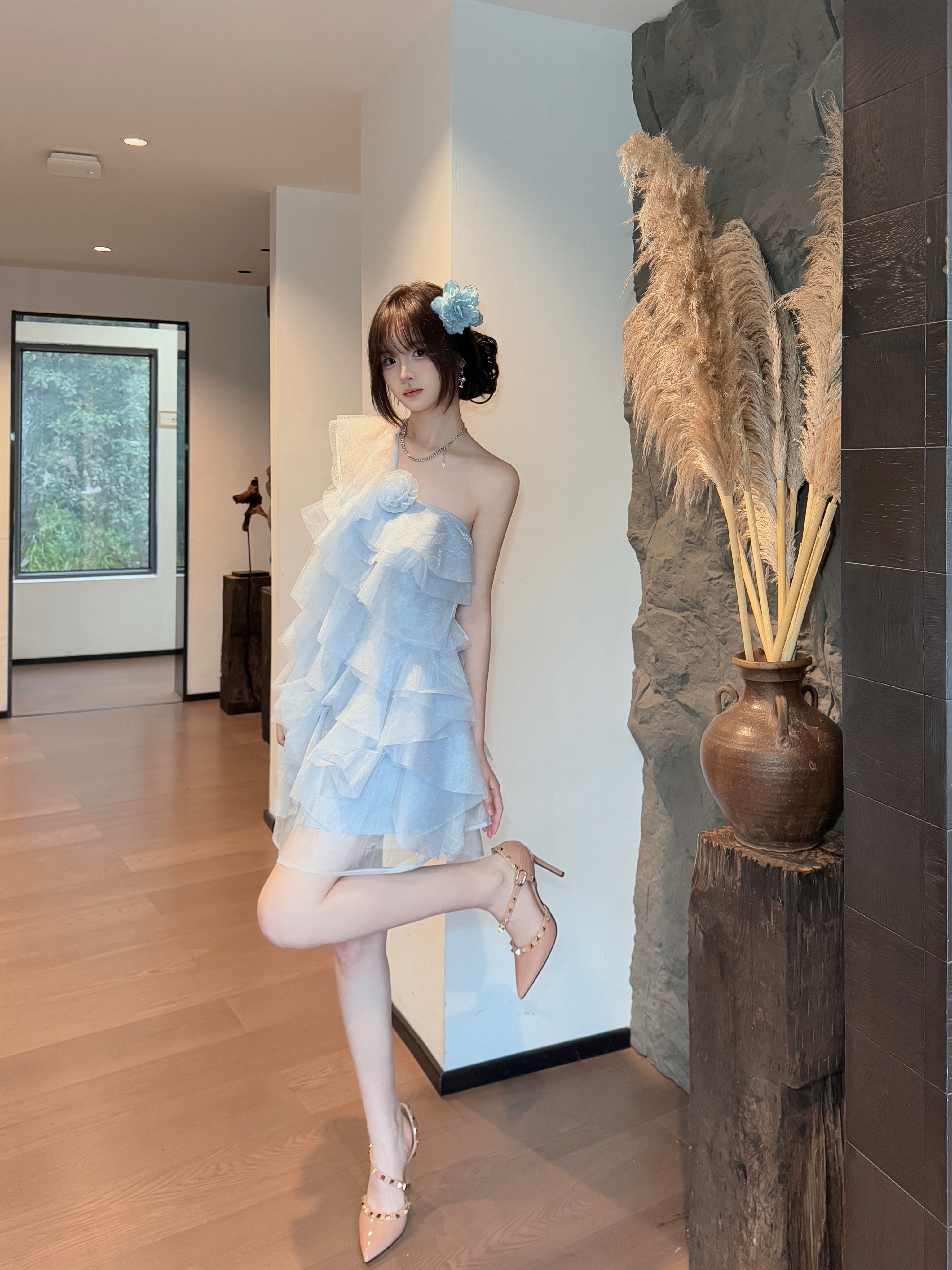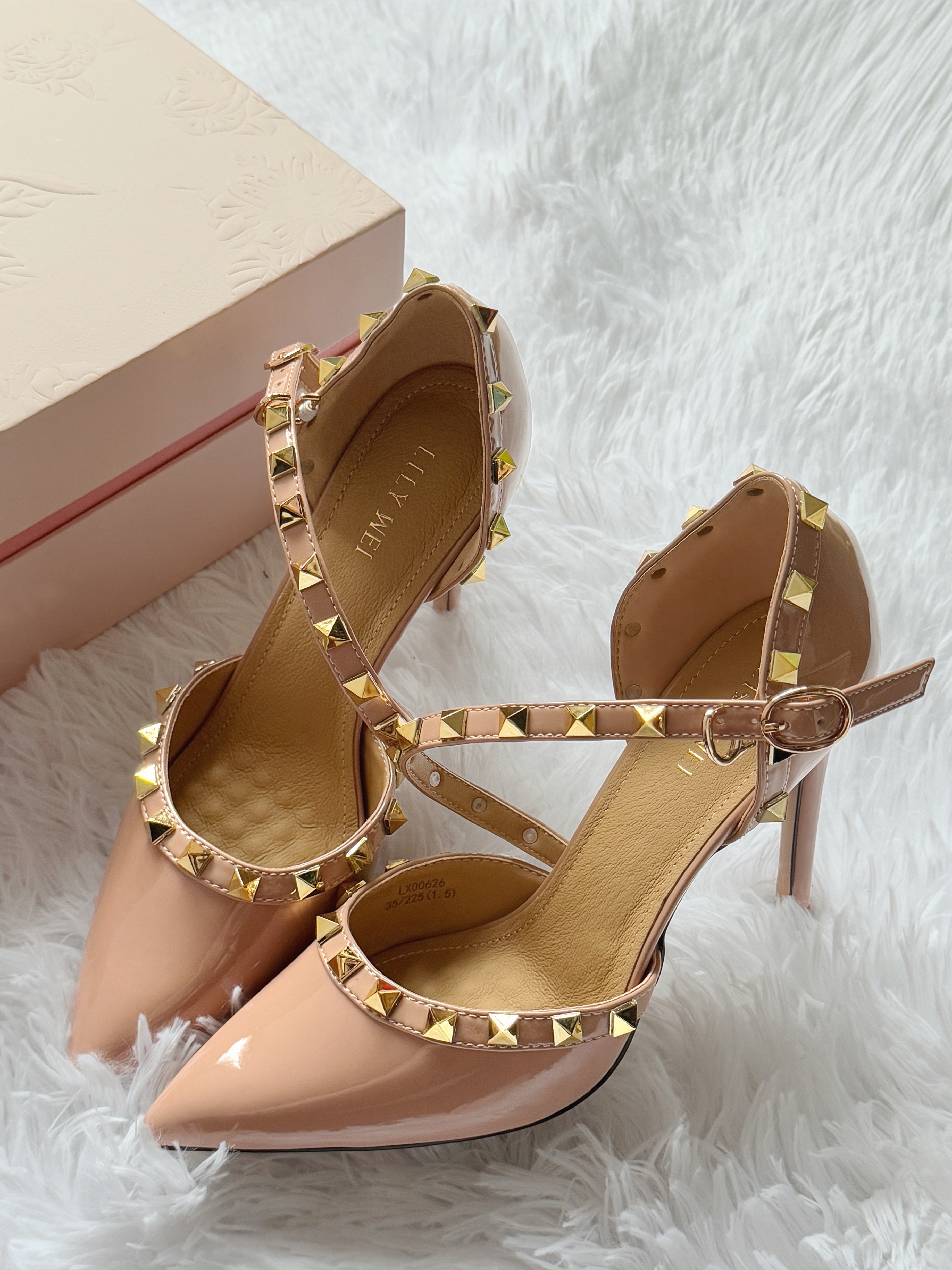 这双 Lily Wei 裸粉铆钉高跟鞋👠太懂女生啦! 尺码也很齐全友好✨31-44码都有✅ 跟高也是可以根据自己的需求选择的哦👻~ 后跟搭配了乳胶☁️小枕头不磨脚💖 前掌有做珍珠🧋垫脚的设计🎨 上脚柔软🎀稳当、久走不累脚~ 建议💦按日常尺码选 搭配浅蓝纱裙👗温柔又精致🌸 约会、成年礼👑都超合适~