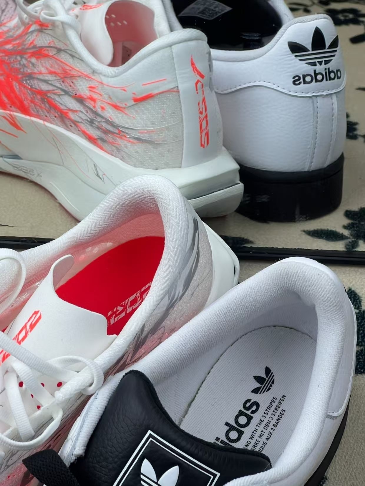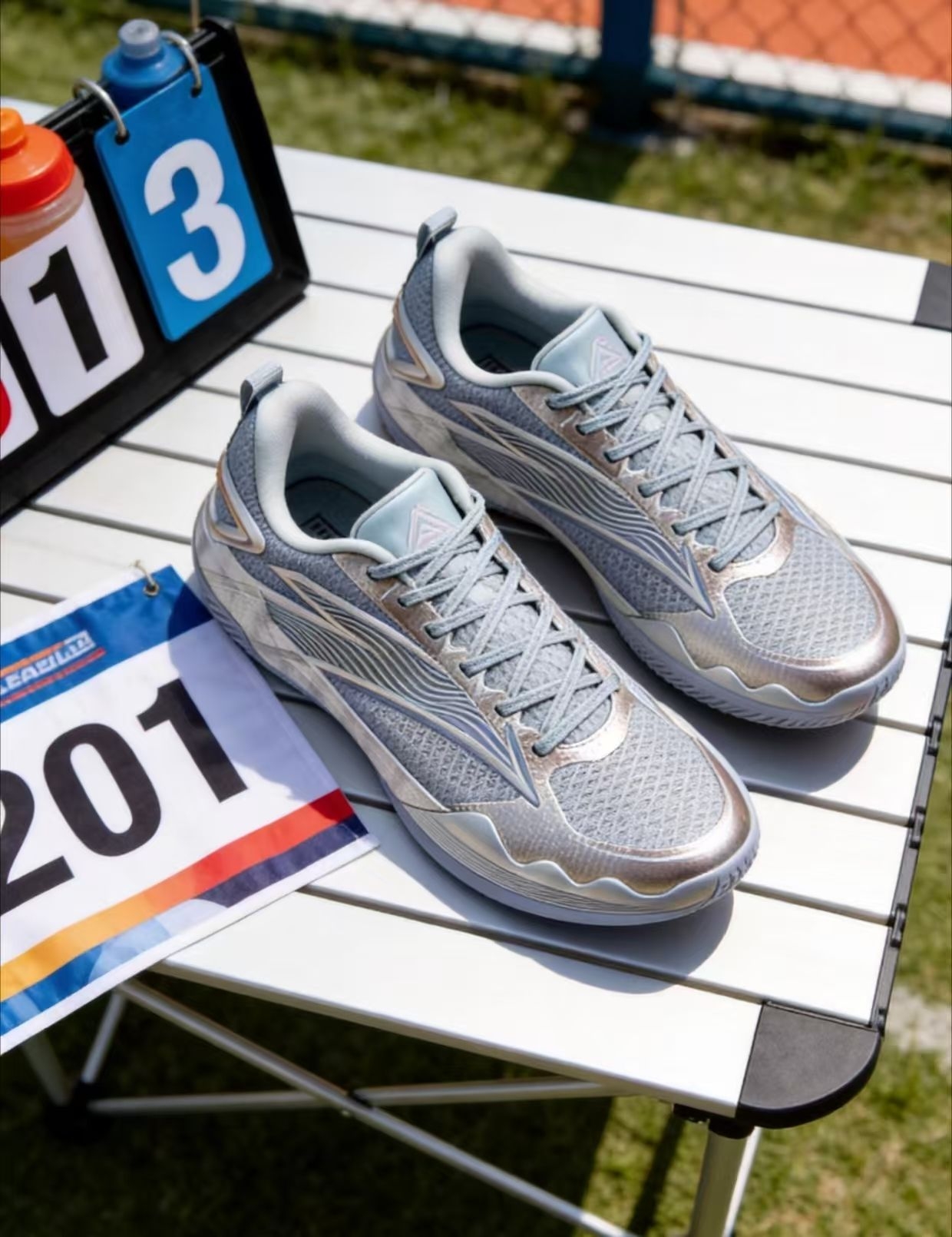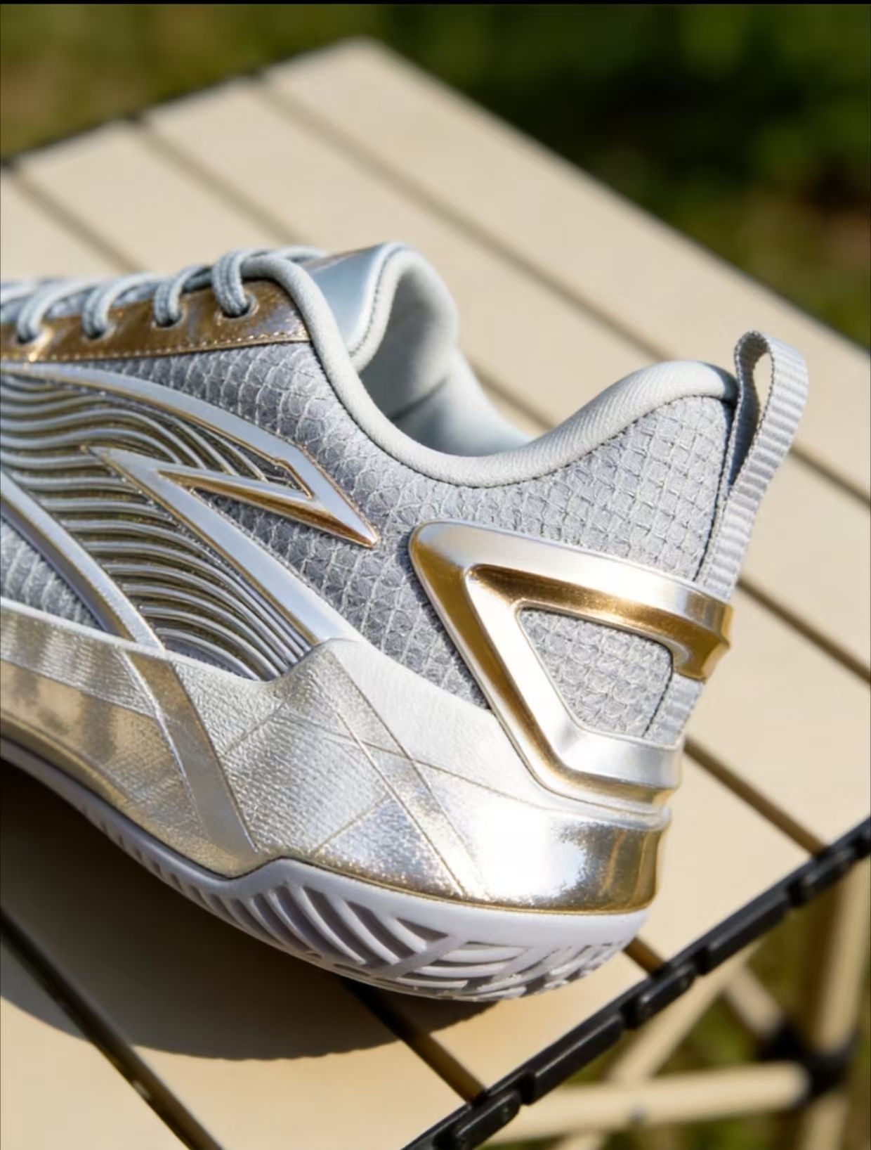 户外自然光下实测这双鞋,优点很直观:阳光下金属质感鞋身颜值很能打,鞋面网布透气孔够多,户外晒着也没明显闷脚感,中底侧面抗扭片刚性够,变向不晃脚,鞋帮高度刚好不卡脚踝。缺点也很实在:鞋头热熔包边偏硬,急停容易顶脚趾,大底纹路偏浅,灰尘多的场地抓地衰减快,鞋身装饰件容易刮花,日常造很容易显旧,不好打理。