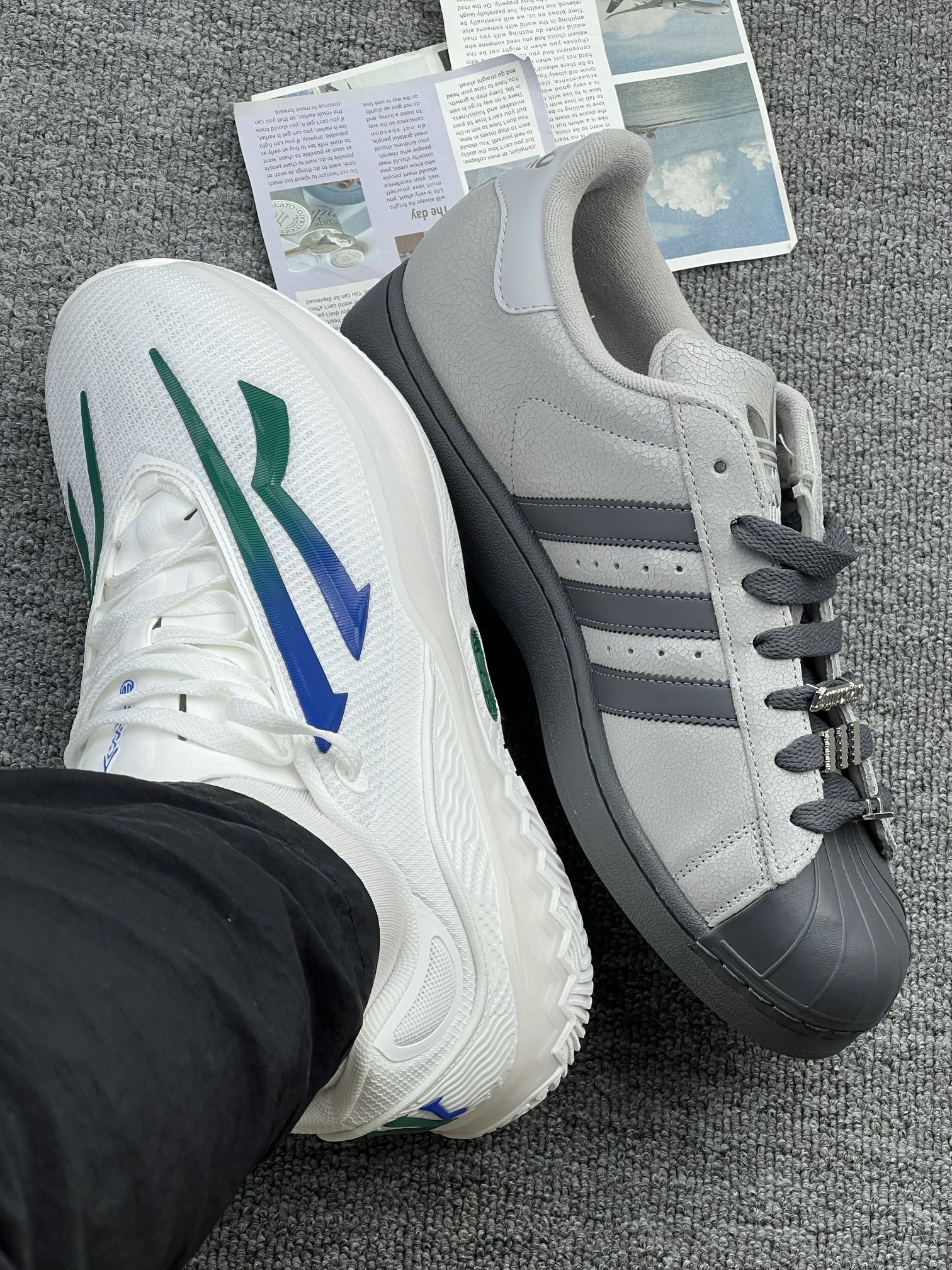 - 安踏白绿网面款: 网布透气感还行,夏天穿不闷脚,但支撑一般,走路久了足弓有点酸。渐变条纹颜值在线,不过容易沾灰,浅色底也不耐脏,得经常擦。鞋底偏软,日常通勤够用,但跑跳时稳定性一般,偶尔会打滑。 - 阿迪灰黑贝壳头: 麂皮质感摸起来舒服,复古感拉满,配工装裤很协调。但麂皮太容易脏,清洁起来麻烦,鞋头贝壳部分硬,刚穿时磨小脚趾,得穿厚袜子磨合。厚底显高,不过走路会有点沉,长时间穿脚会累。 ...
