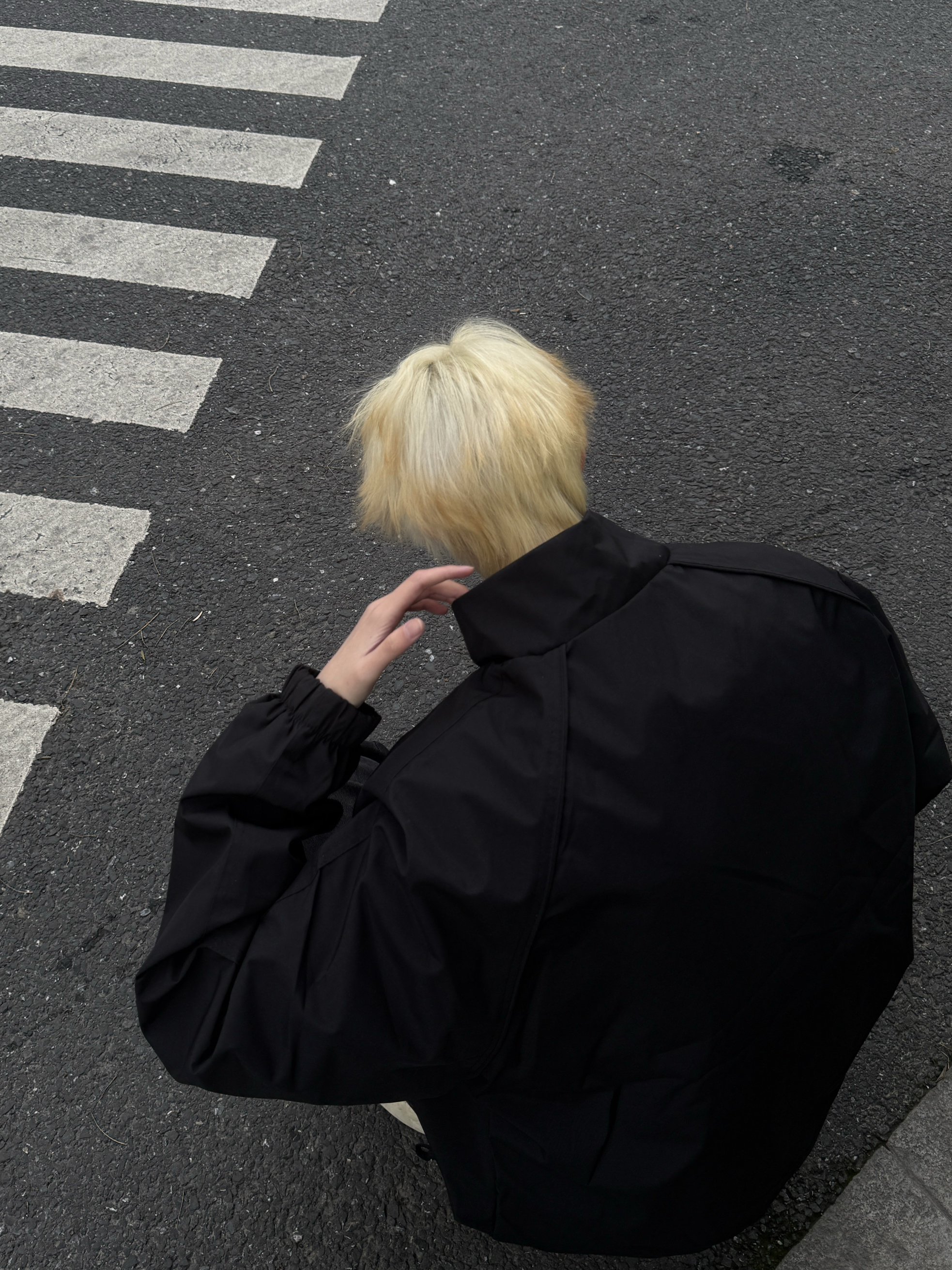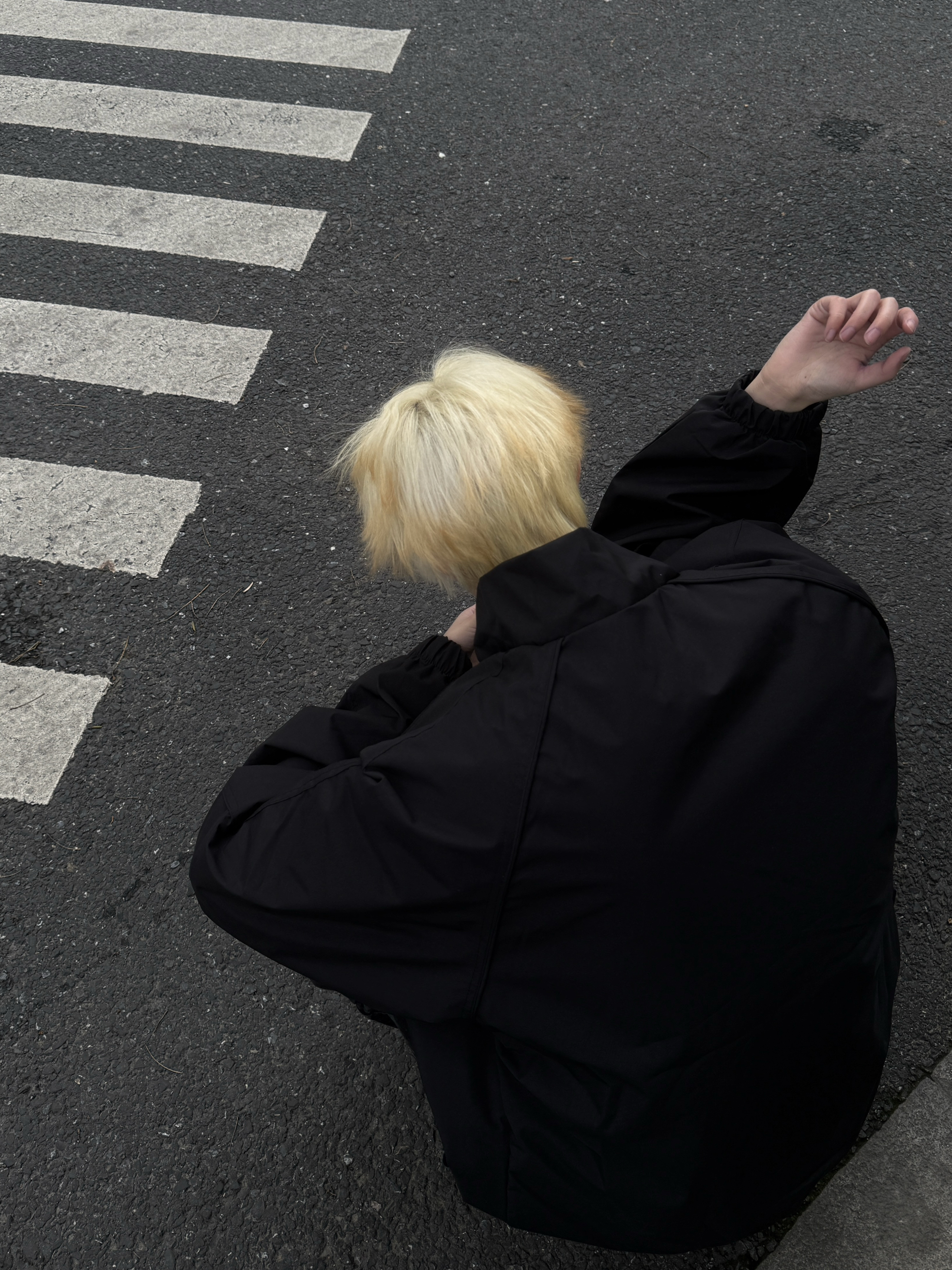 阴天的斑马线,主打一个松弛不费力。 黑色机能夹克的线条感太绝,叠穿白T露出边边,立刻打破全黑的沉闷。 而且这件夹克面料挺括有质感,日常出街回头率超高 浅金发色和黑穿搭的撞色,氛围感直接拉满。 不用刻意摆拍,蹲坐或随意站立,都是自带故事感的街头大片。