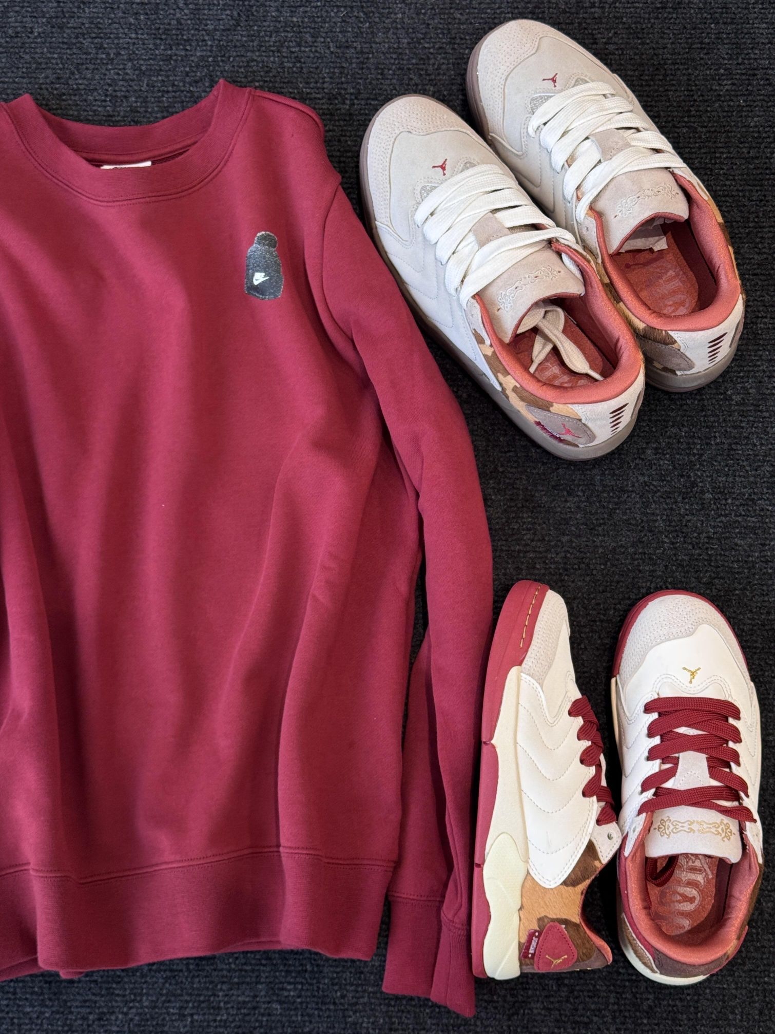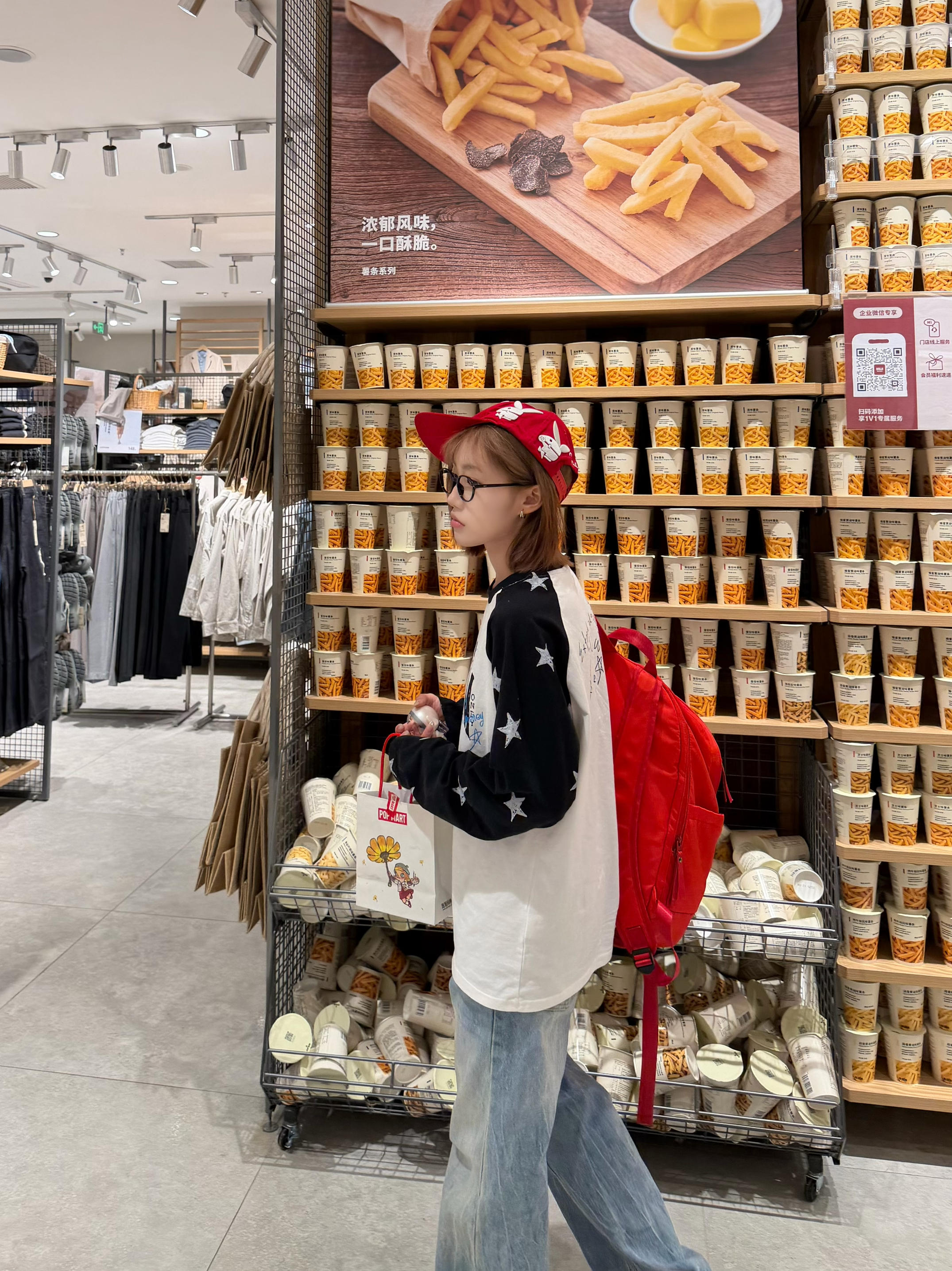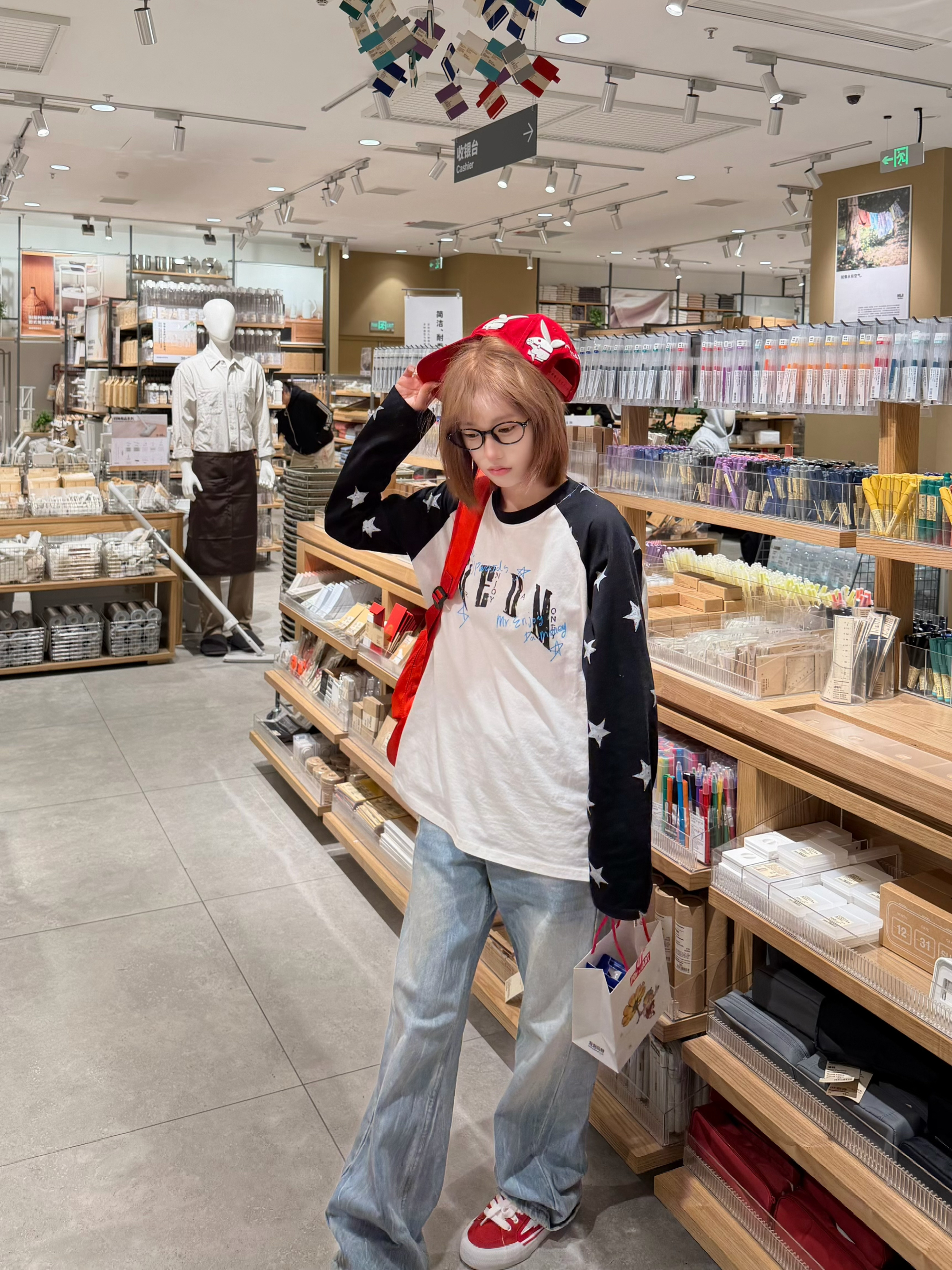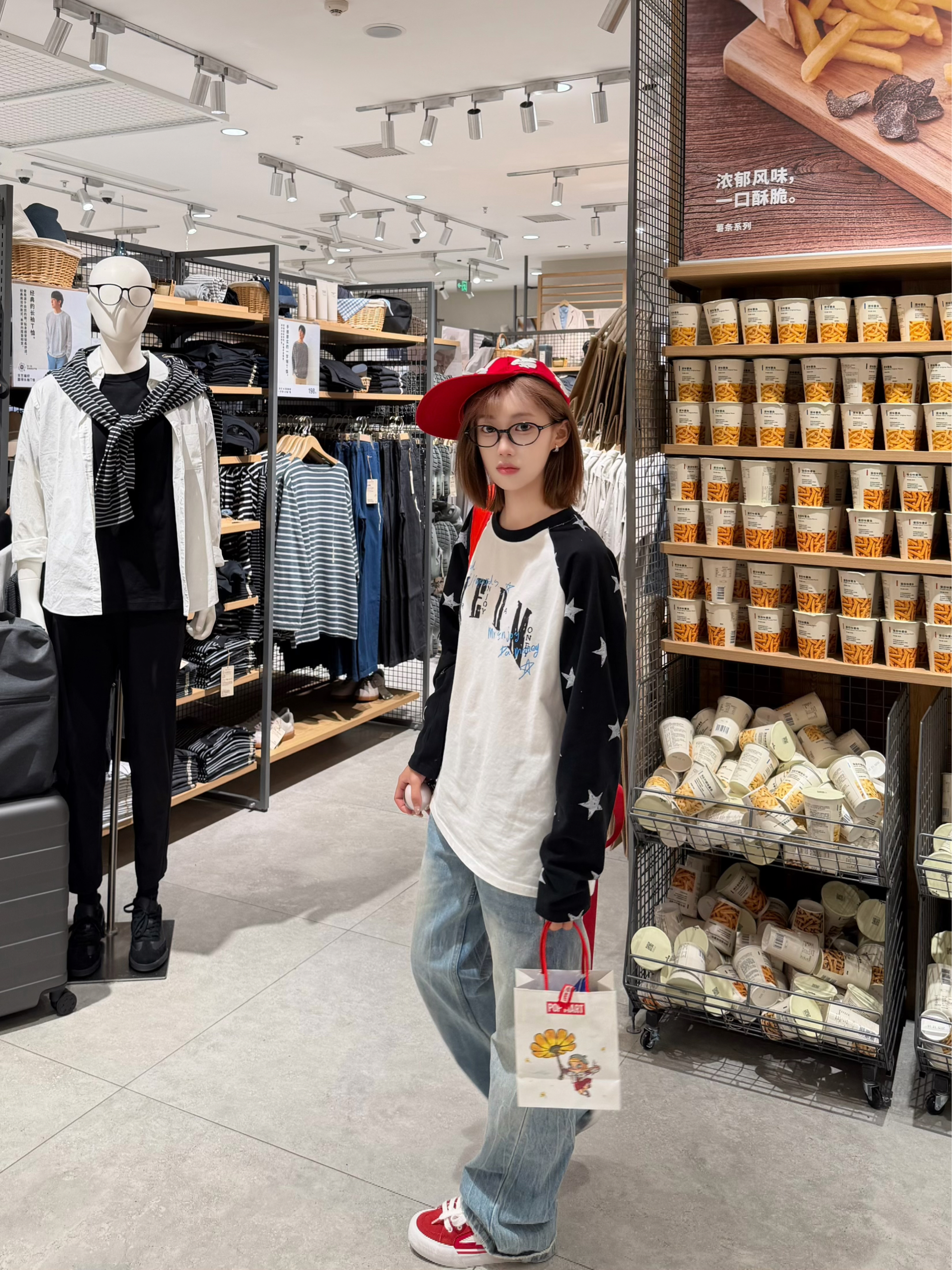 黑白插肩袖卫衣自带慵懒感,星星印花直接拉满美式街头味儿~ 浅蓝阔腿牛仔裤藏肉又显腿长,红帽红鞋一搭,活力值瞬间爆表! 逛家居店都能拍出氛围感,舒服又出片,日常出街这套稳赢~