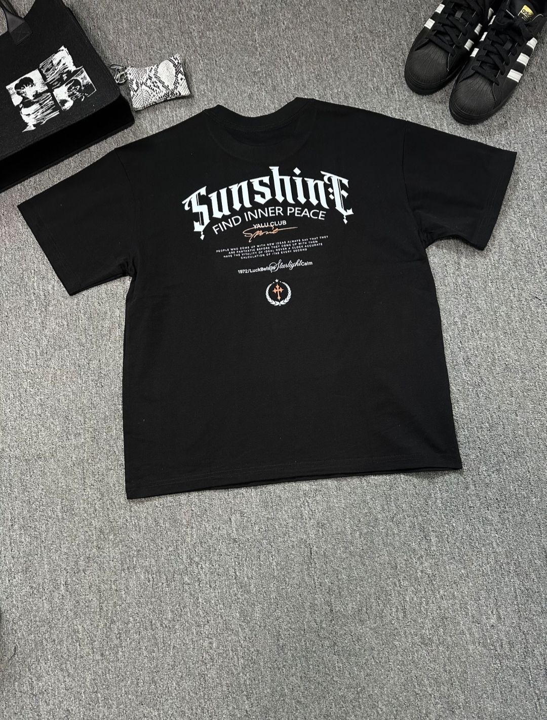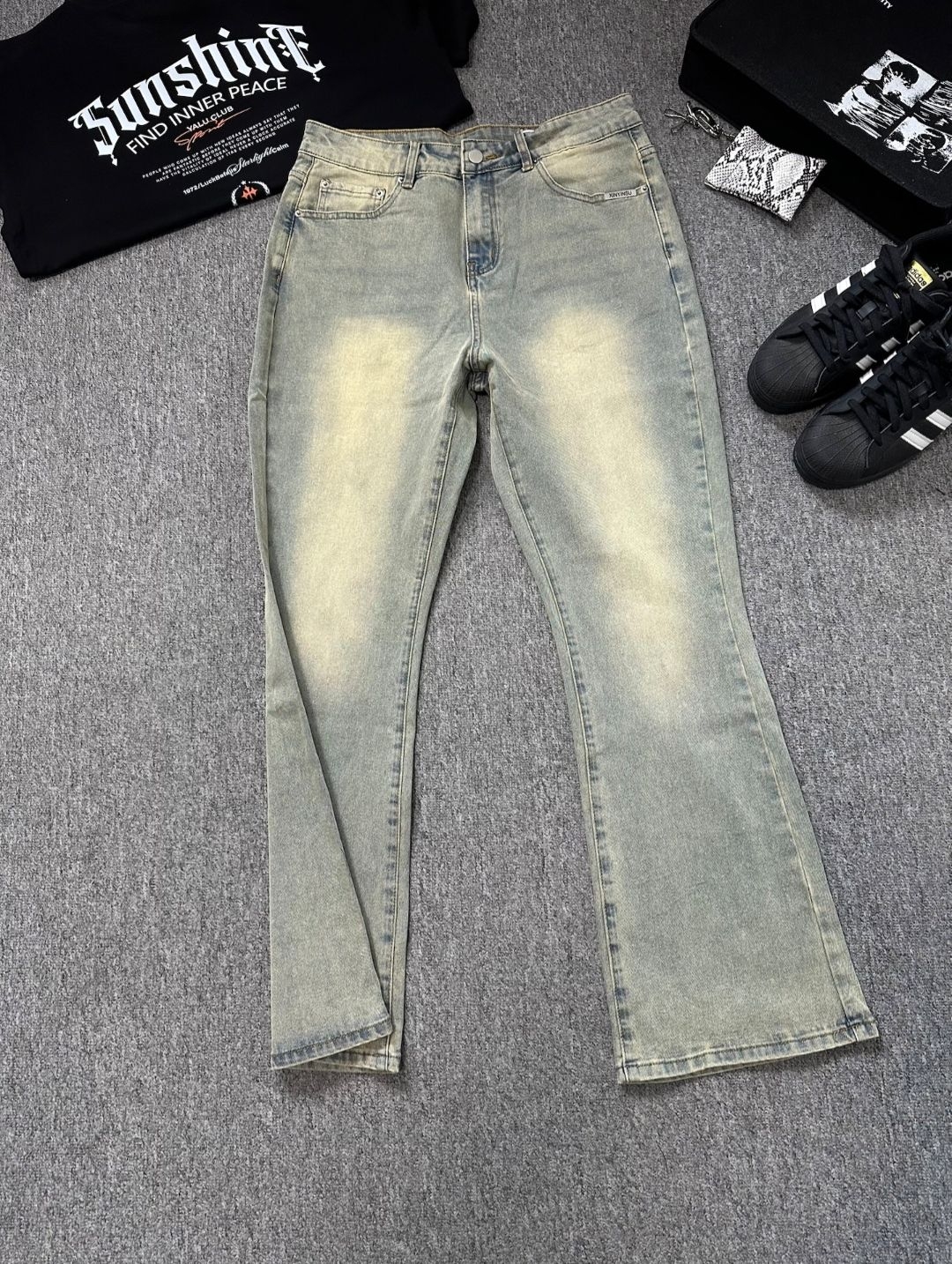 兄弟们~今日穿搭分享来啦哈哈[机智_blue] 美式哥特字母印花T恤搭配黄泥色水洗牛仔裤真的酷💫鞋子搭贝壳头好出片呀哈哈!!