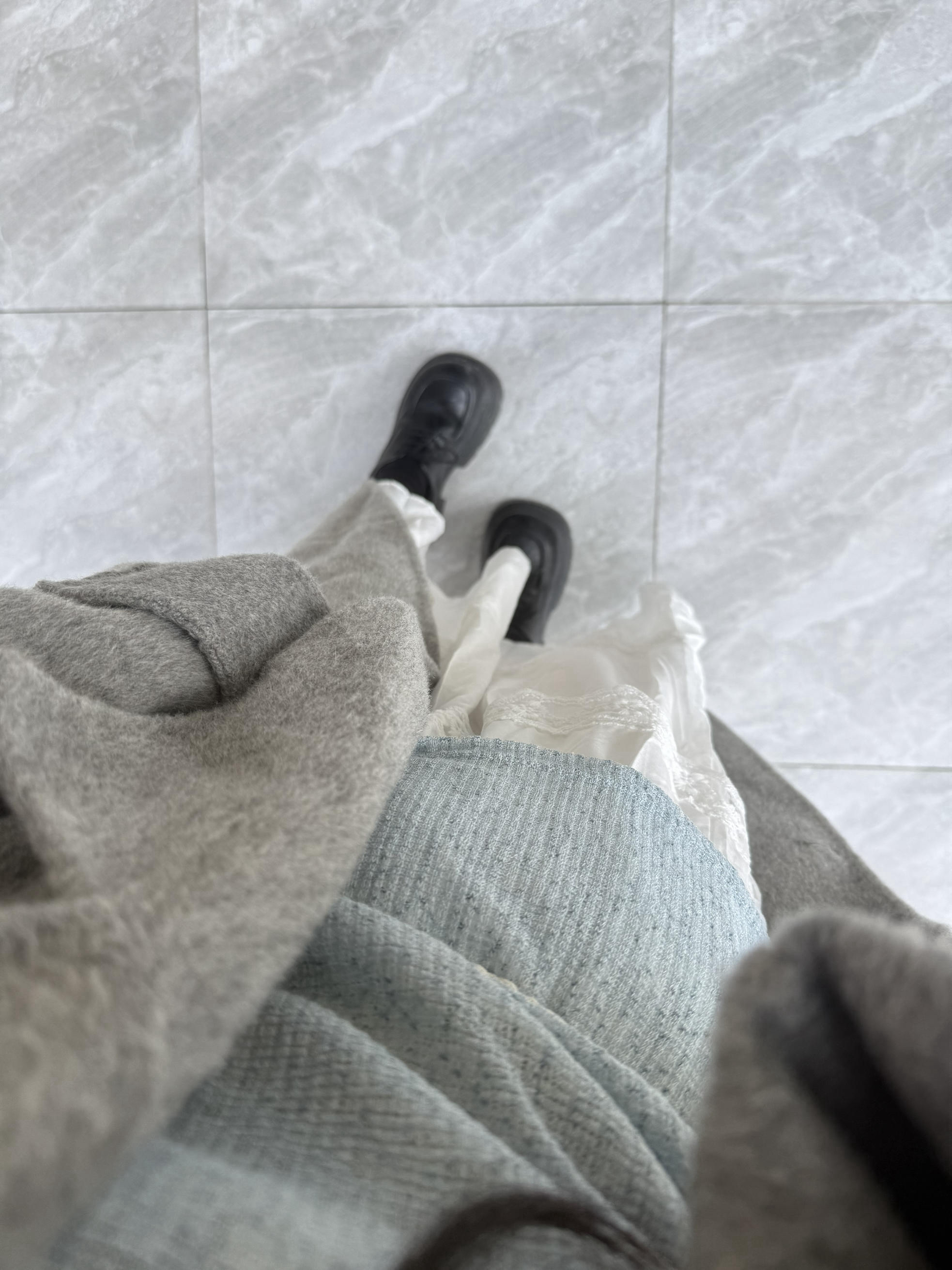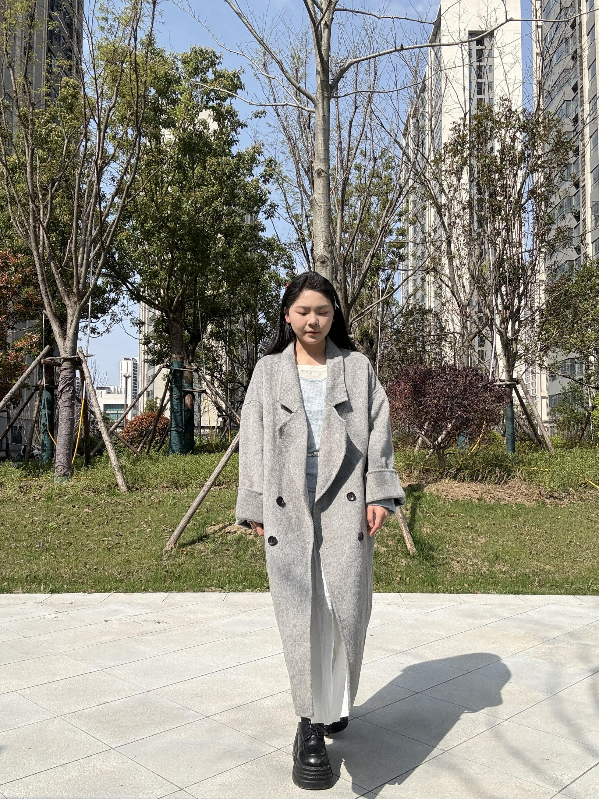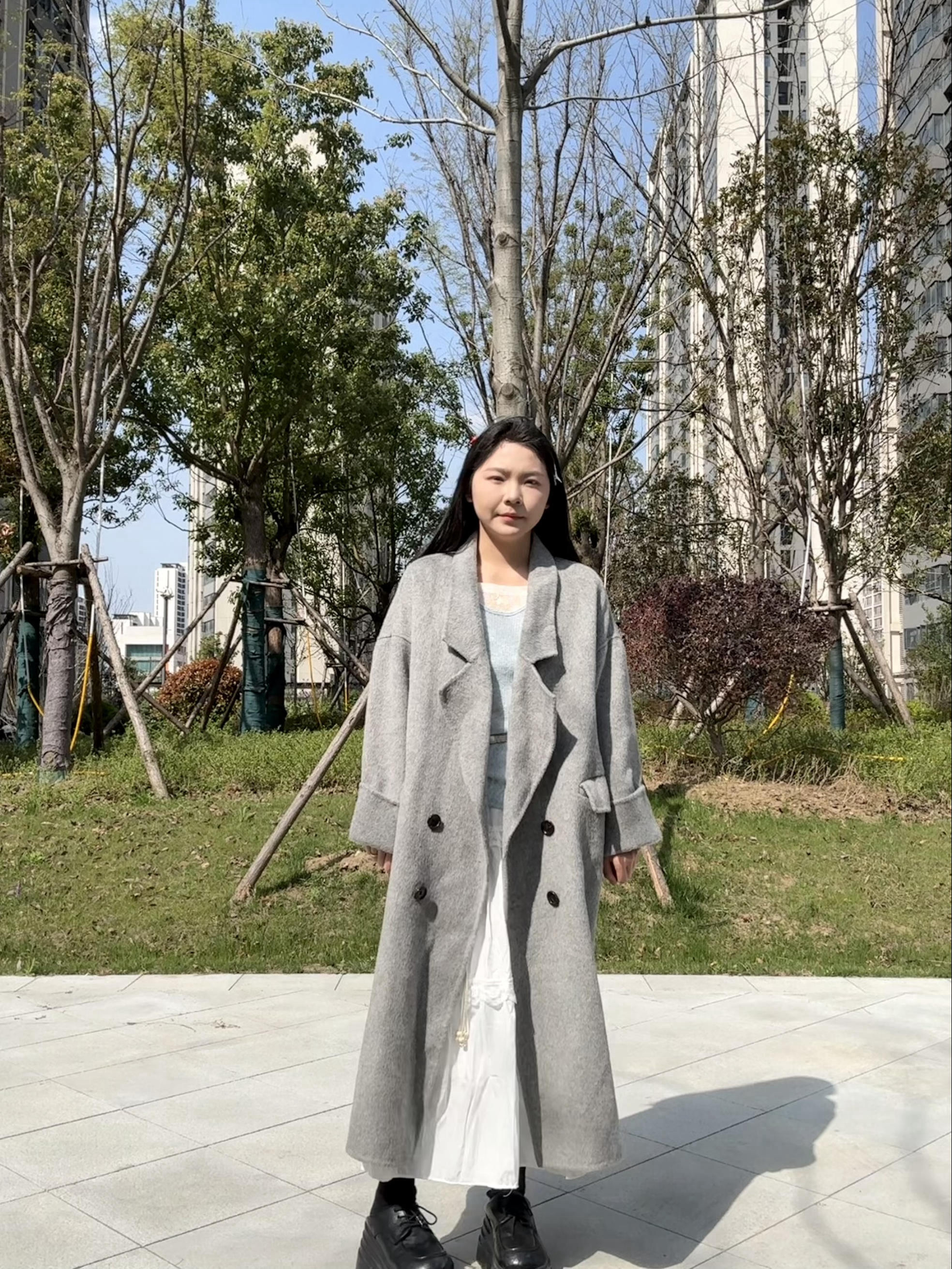 灰色大衣真的太百搭了 搭配裙子优雅知性 最近天气温差大 早晚穿大衣 中午直接脱掉外套也美美的